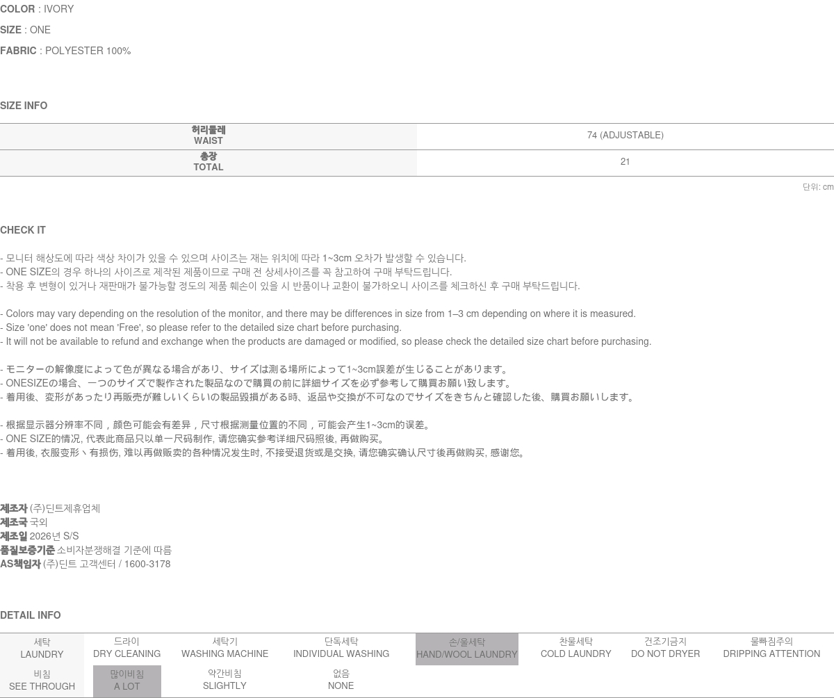 • (주)딘트의 의류는 일반 세탁 및 건조기 사용 시 원단의 변형이나 제품 손상의 원인이 될 수 있으므로, 하단에 안내된 세탁 방법을 따라주시기를 권장합니다.