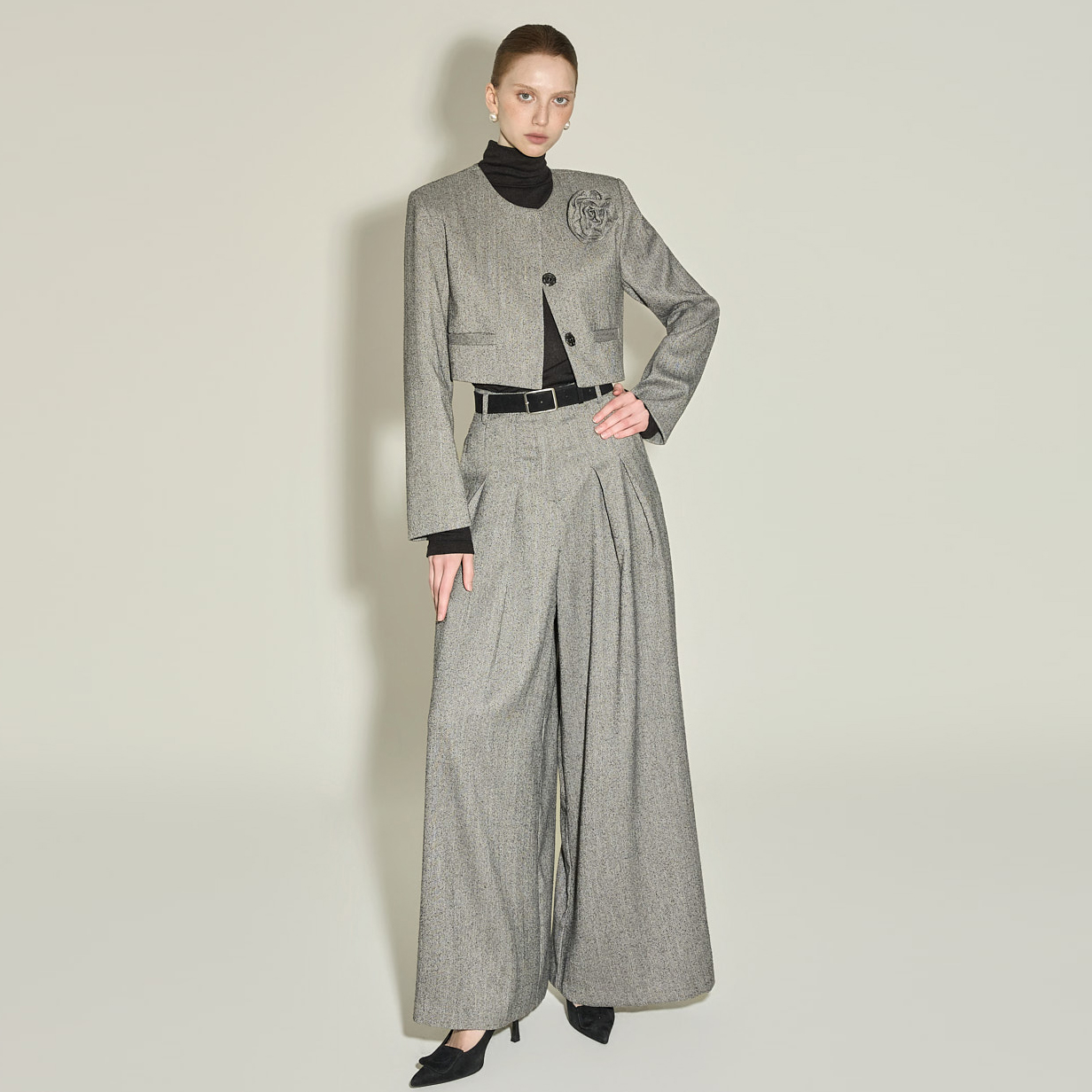 슬랙스는 와이드한 플레어 핏에 전면 핀턱 디테일이 더해져