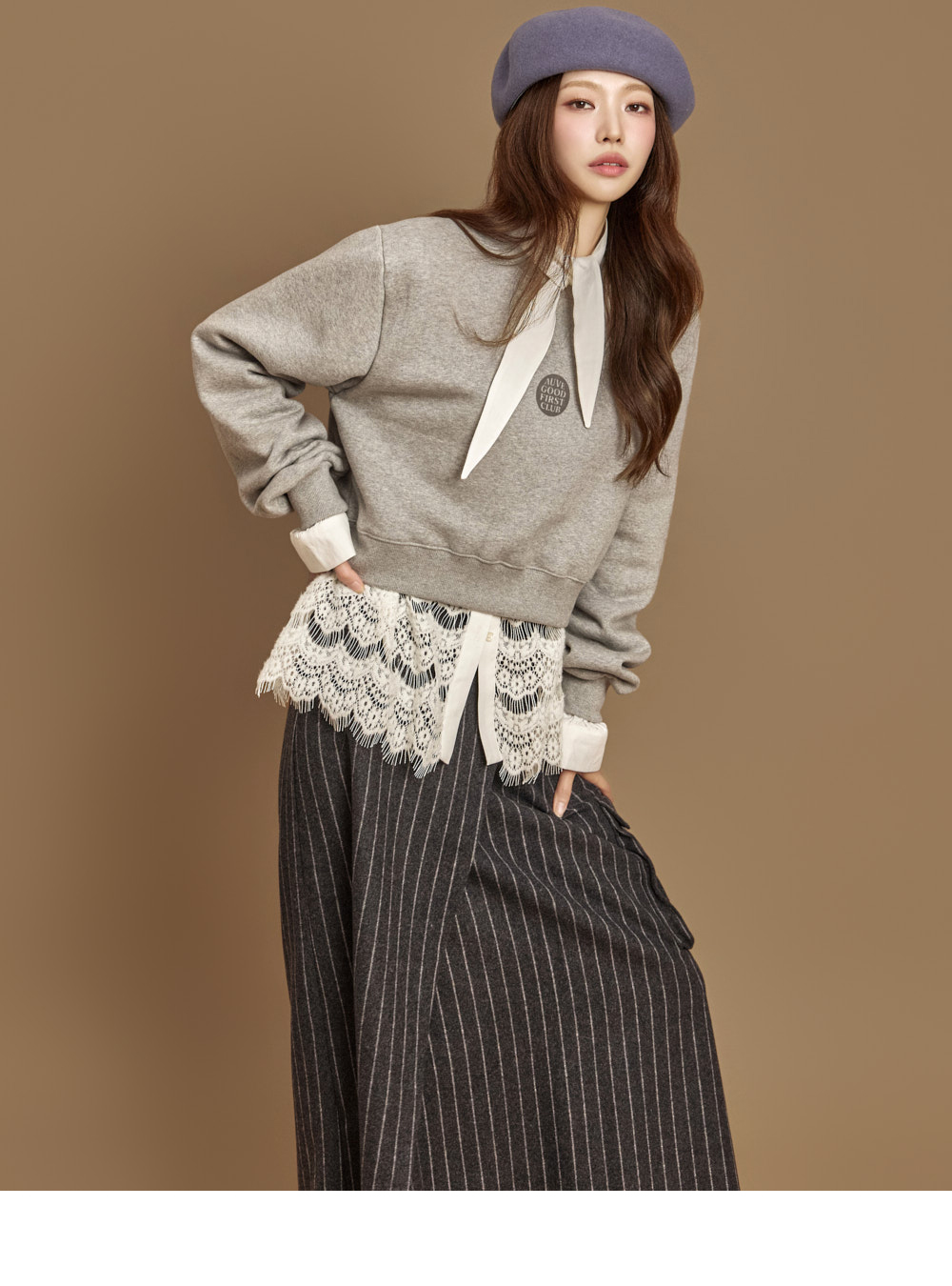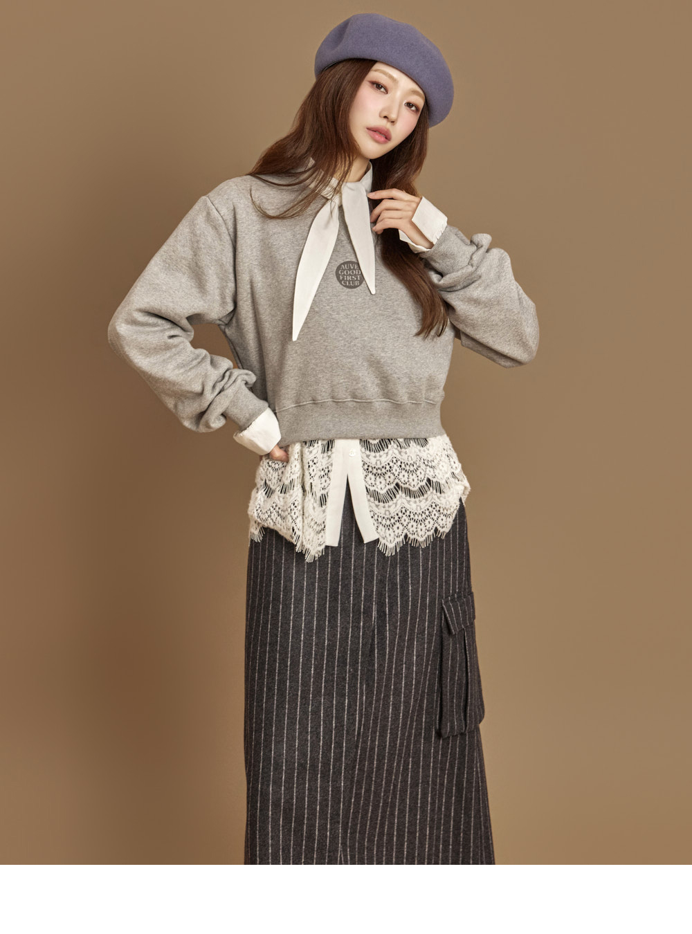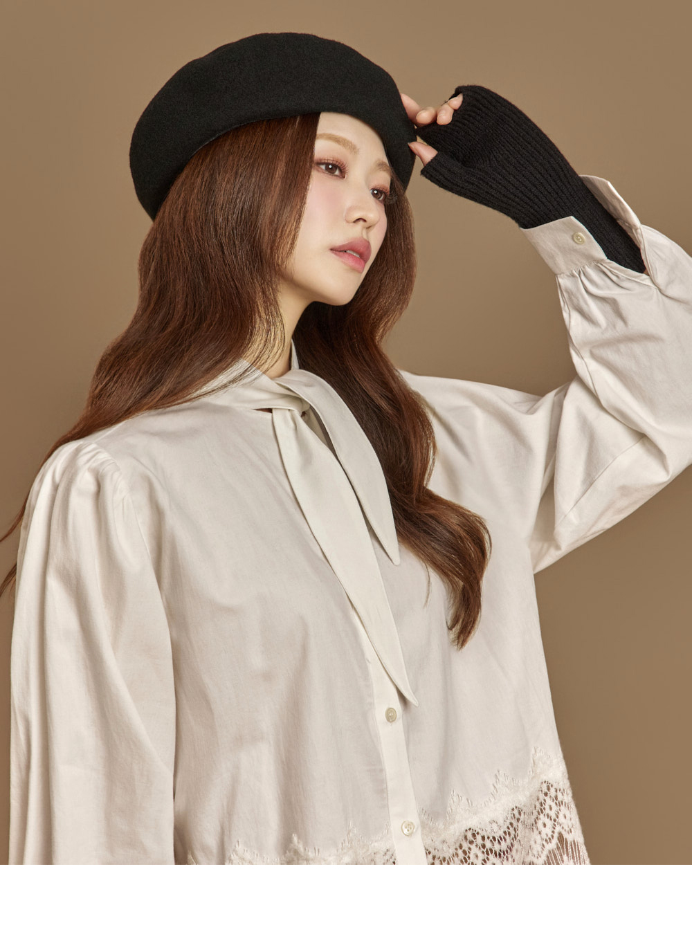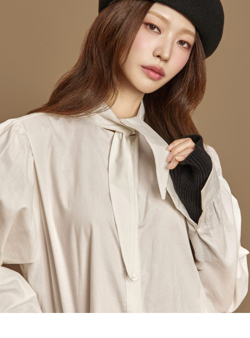 자연스럽게 흐르는 라인의 네크 스카프 디테일이