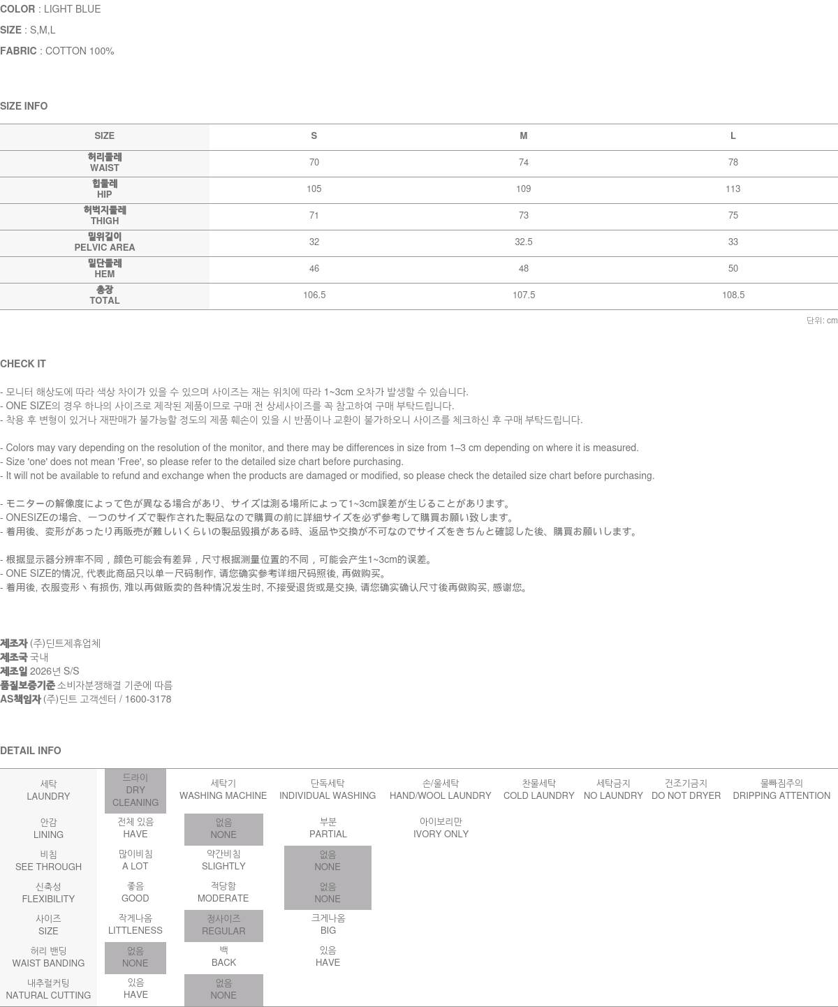 - (주)딘트의 의류는 일반 세탁 및 건조기 사용 시 원단의 변형이나 제품 손상의 원인이 될 수 있으므로, 하단에 안내된 세탁 방법을 따라주시기를 권장합니다.