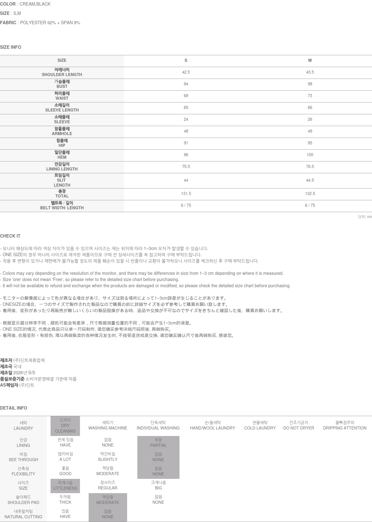 - (주)딘트의 의류는 일반 세탁 및 건조기 사용 시 원단의 변형이나 제품 손상의 원인이 될 수 있으므로, 하단에 안내된 세탁 방법을 따라주시기를 권장합니다.