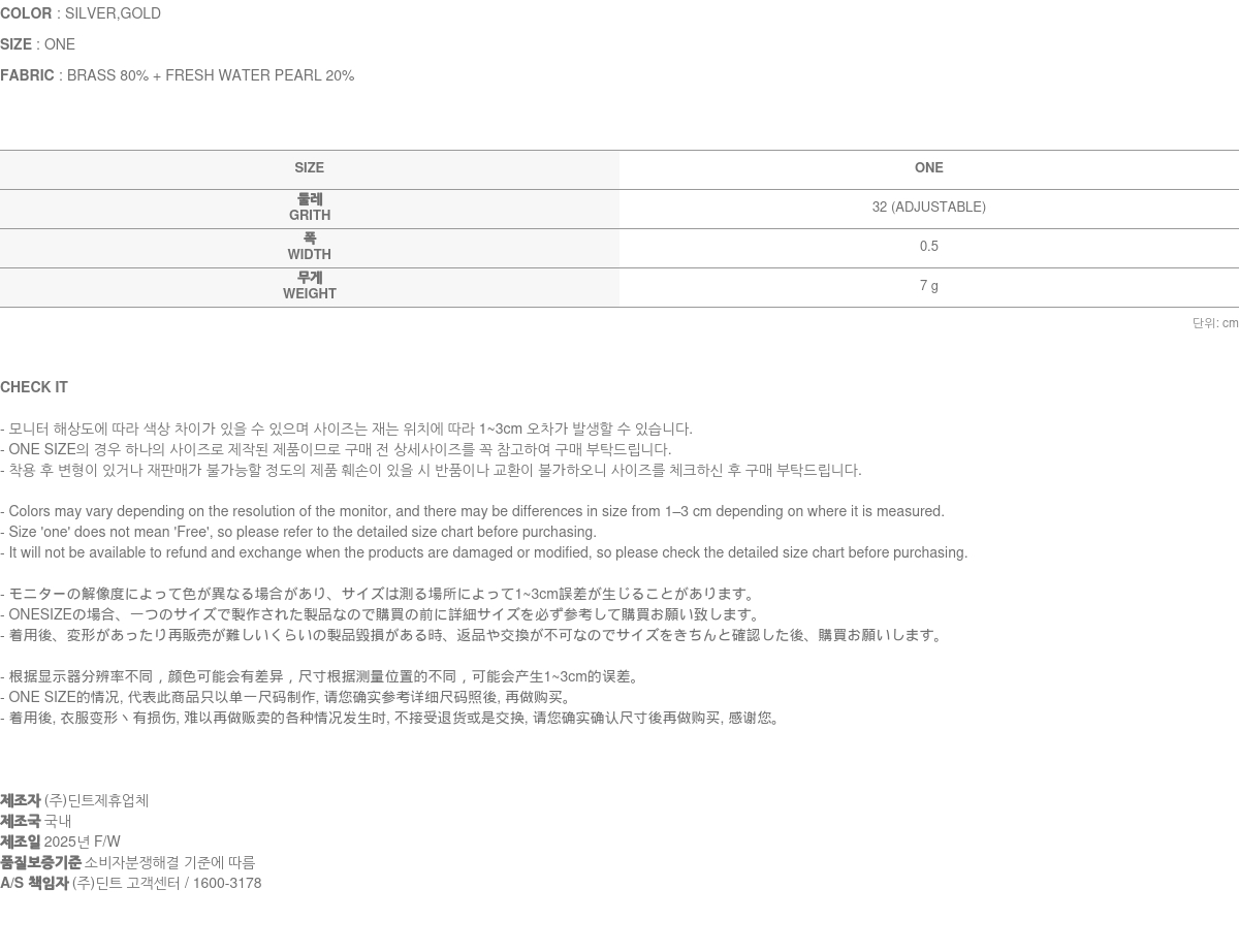 - 액세서리 및 잡화는 장시간 보관 및 착용 시 변색이나 변형이 될 수 있습니다.