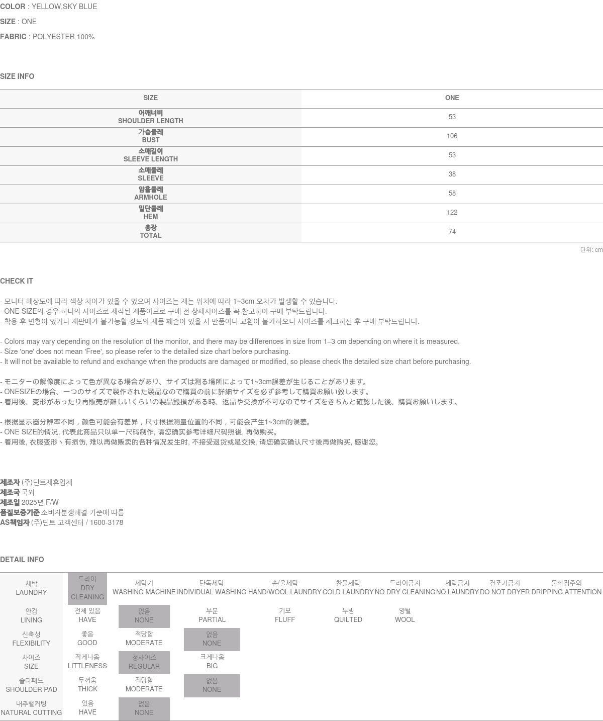 171CM 모델 ONE 사이즈, YELLOW 컬러 착용하였습니다.