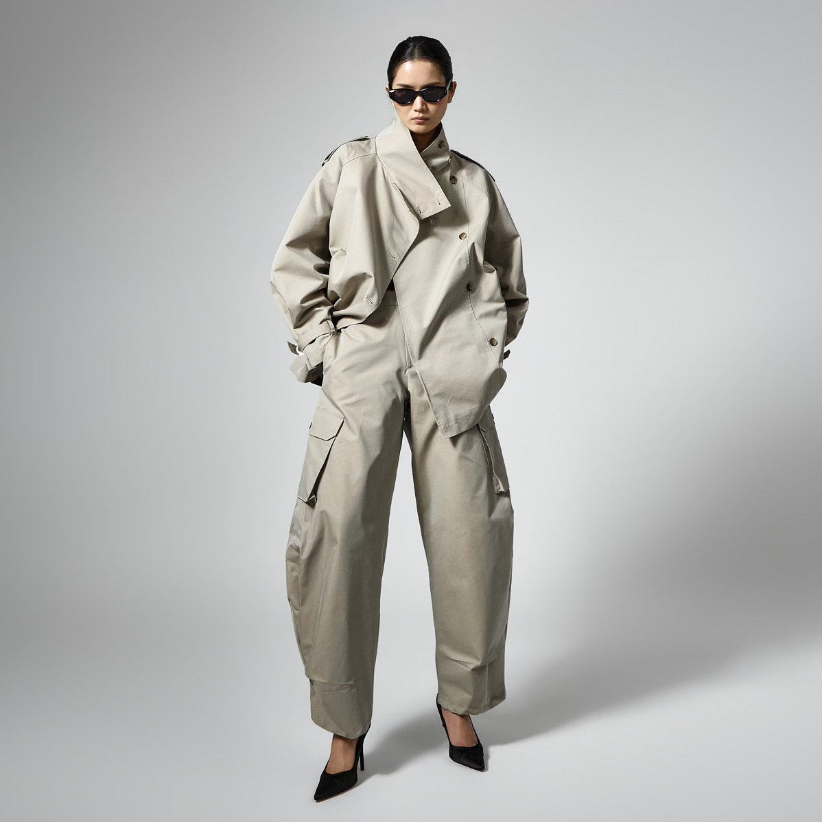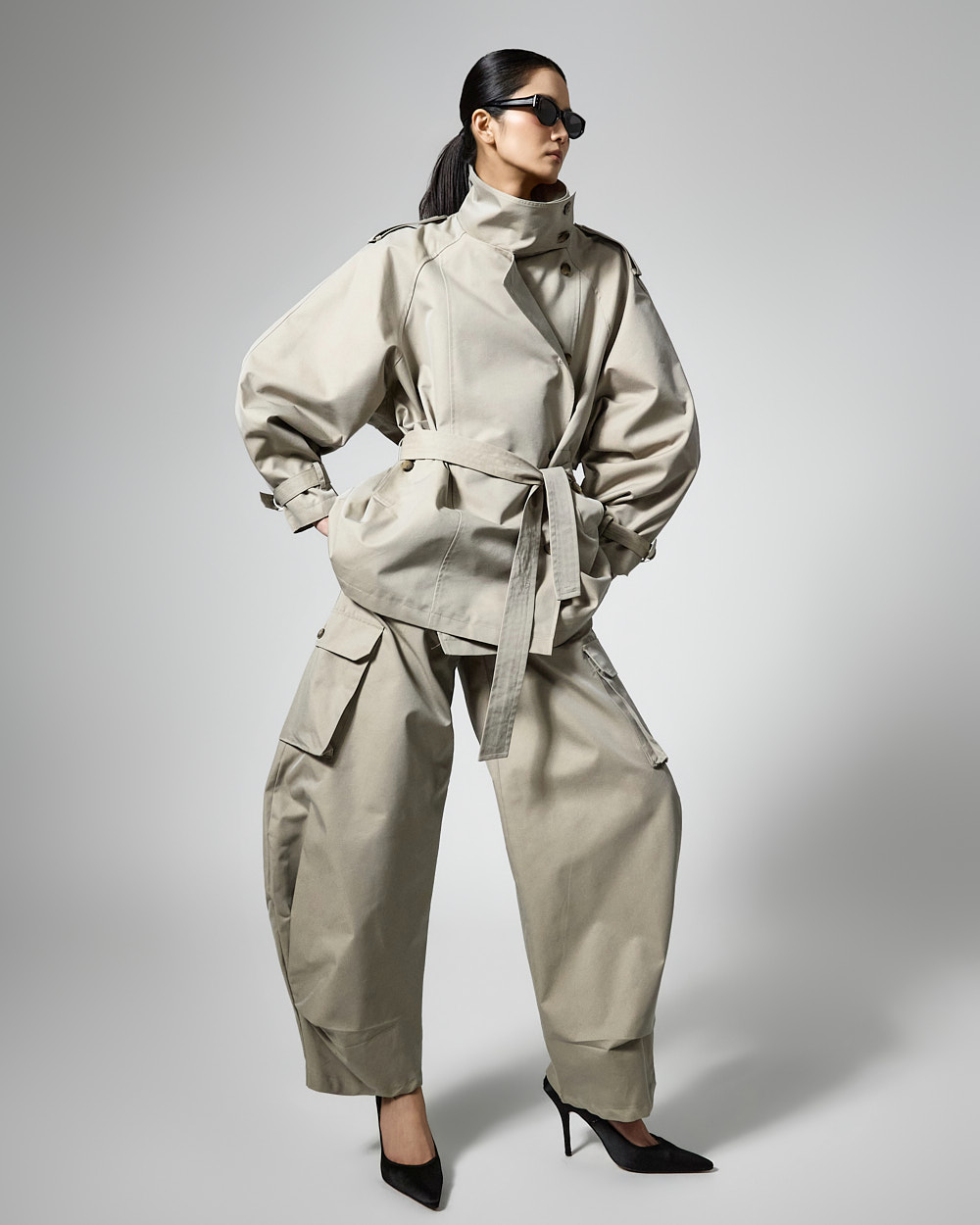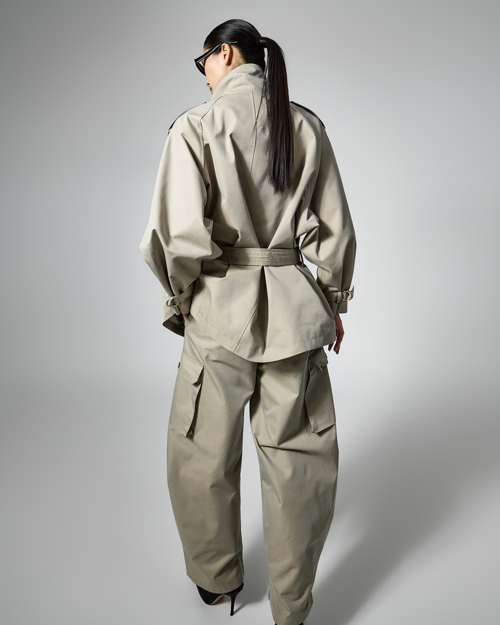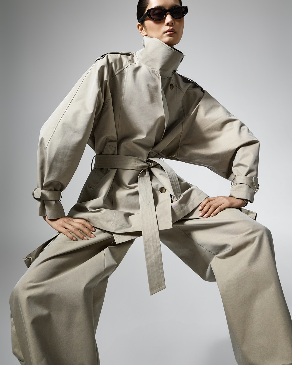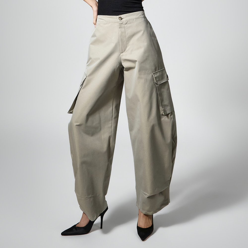 팬츠는 커브드 핏에 핀턱 디테일이 더해져