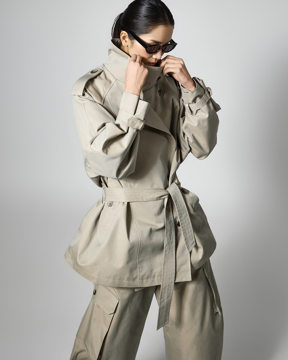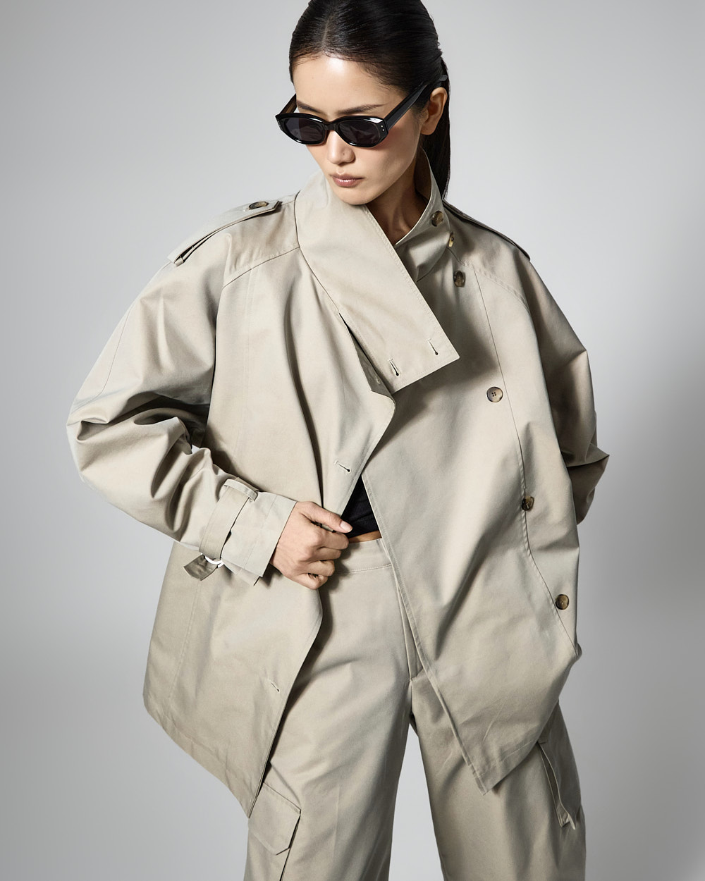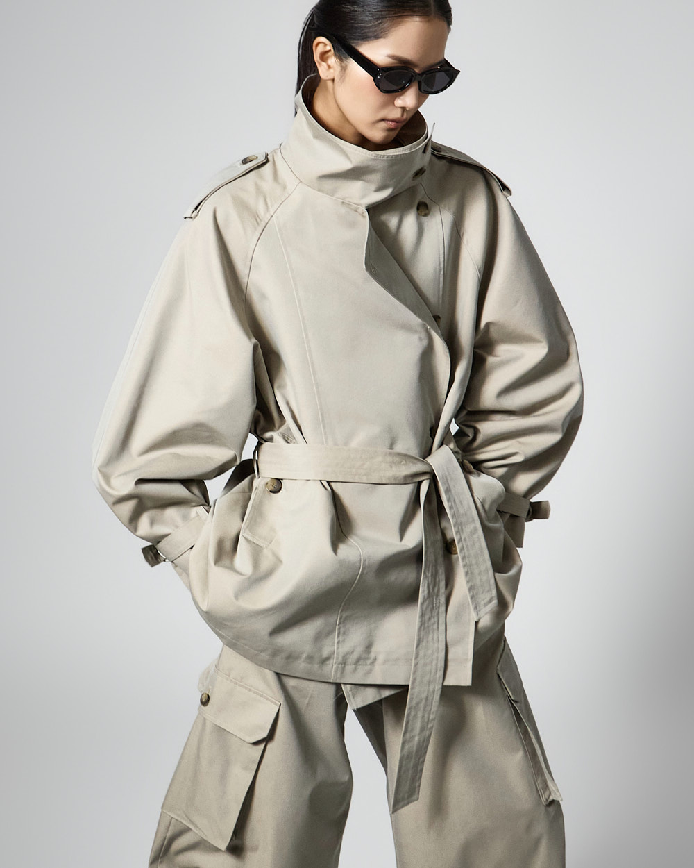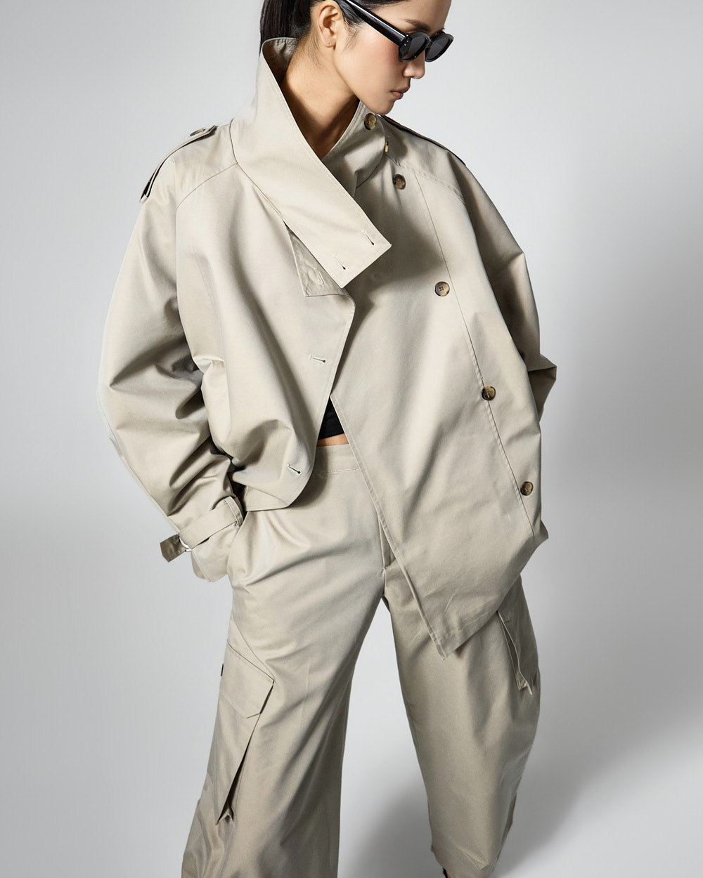 자켓은 하이넥 디자인과 루즈한 박스핏으로