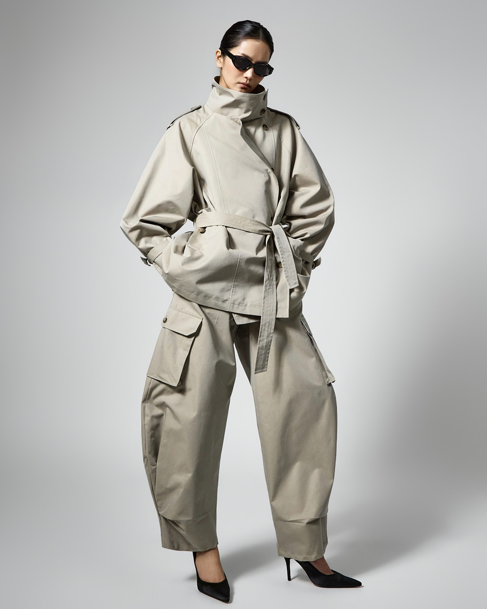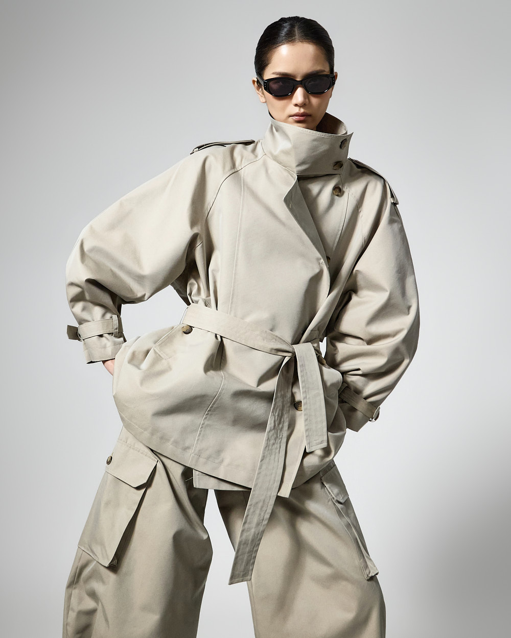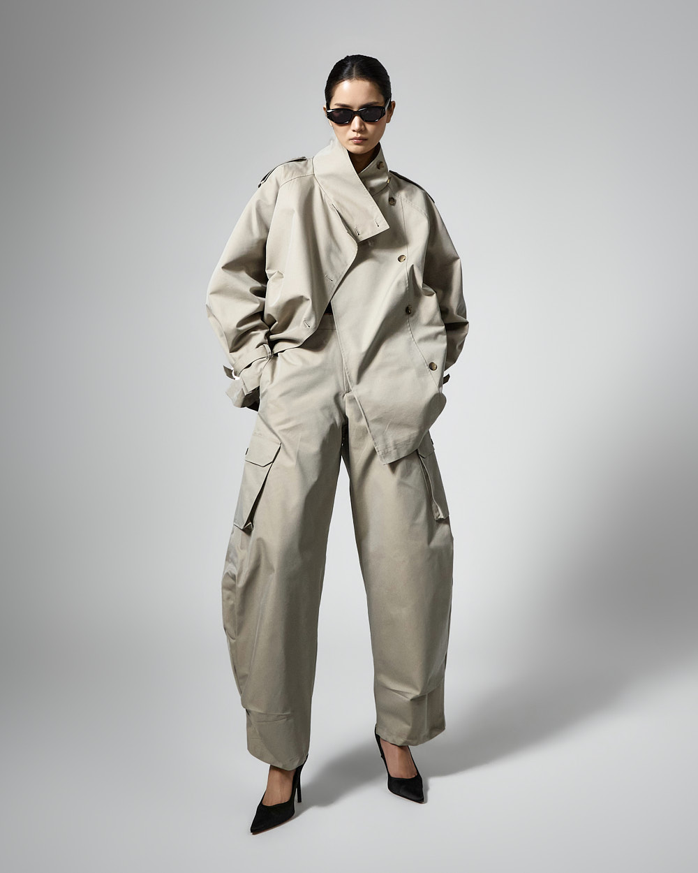 자켓은 하이넥 디자인과 루즈한 박스핏으로