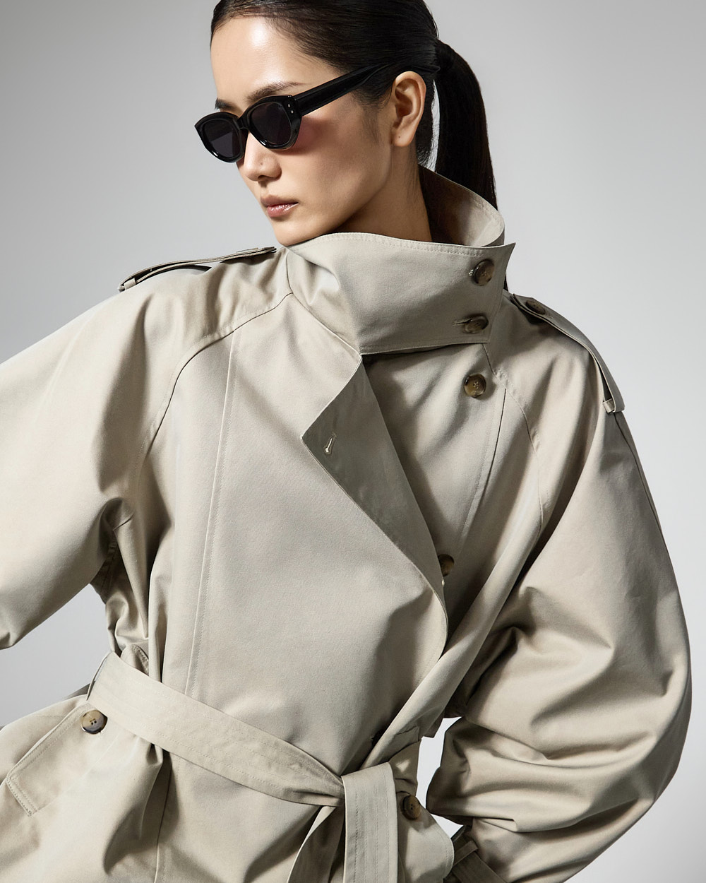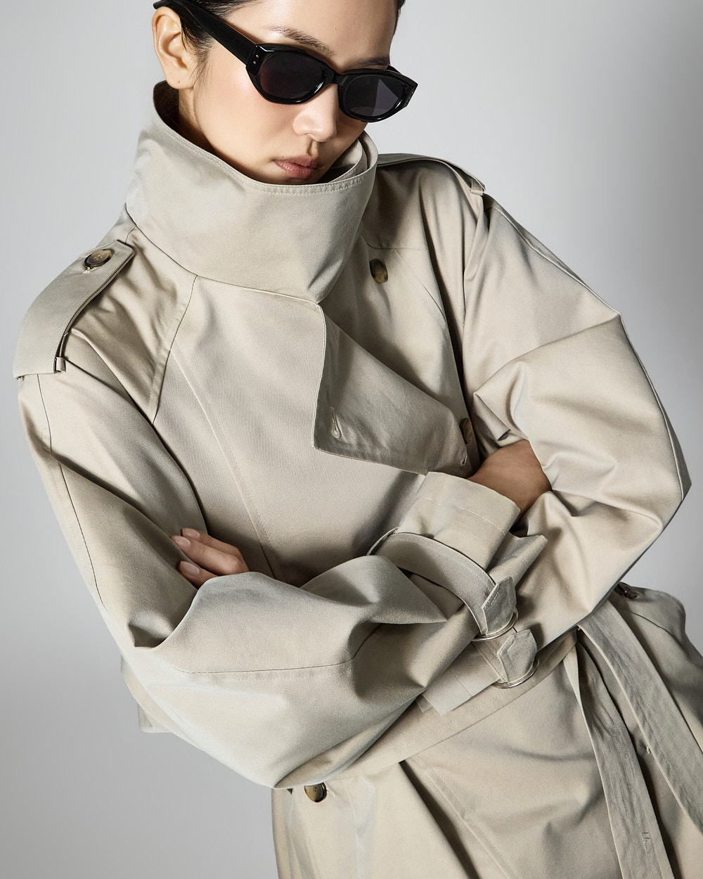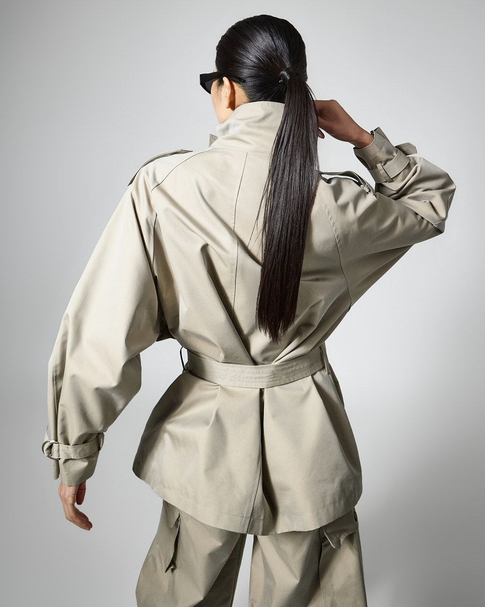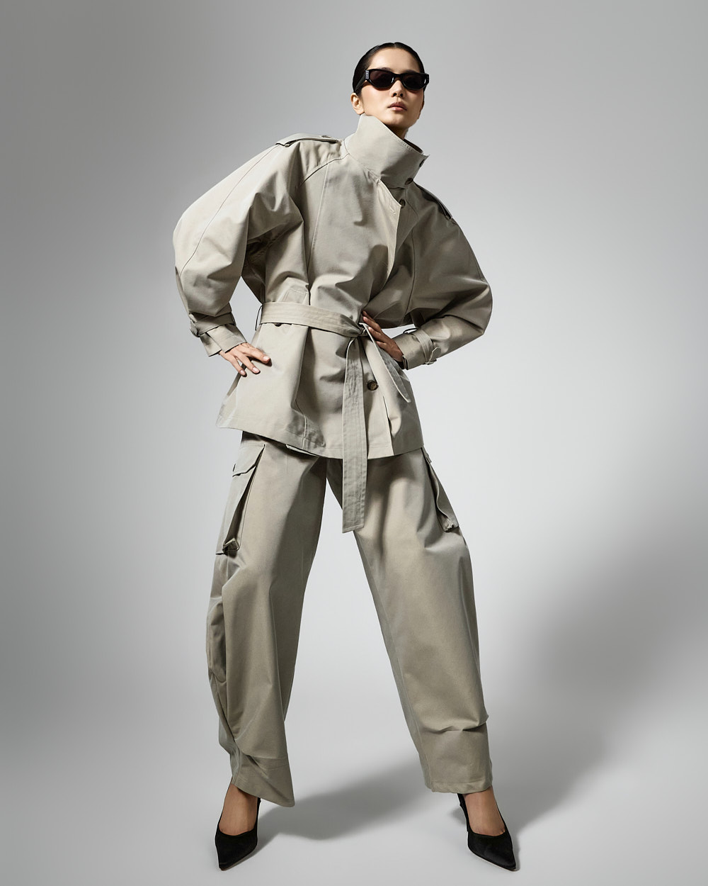 자켓은 하이넥 디자인과 루즈한 박스핏으로