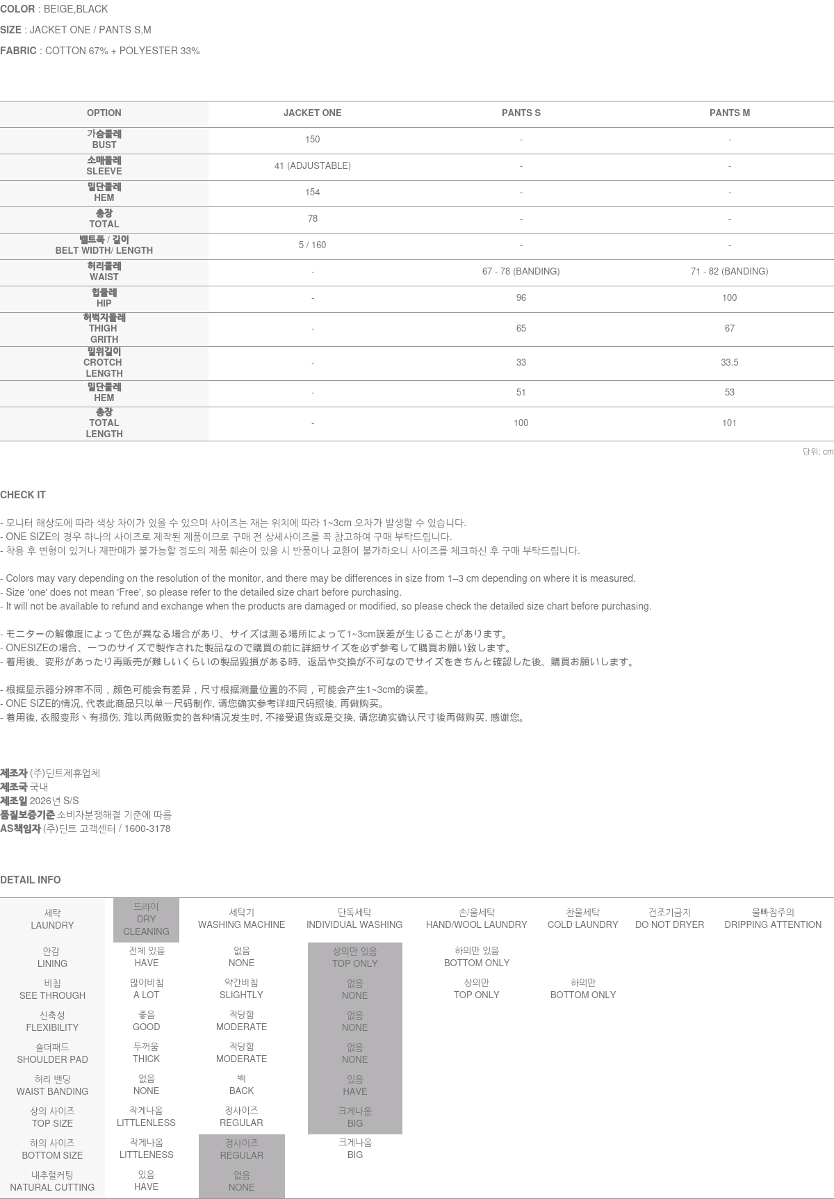- (주)딘트의 의류는 일반 세탁 및 건조기 사용 시 원단의 변형이나 제품 손상의 원인이 될 수 있으므로, 하단에 안내된 세탁 방법을 따라주시기를 권장합니다.