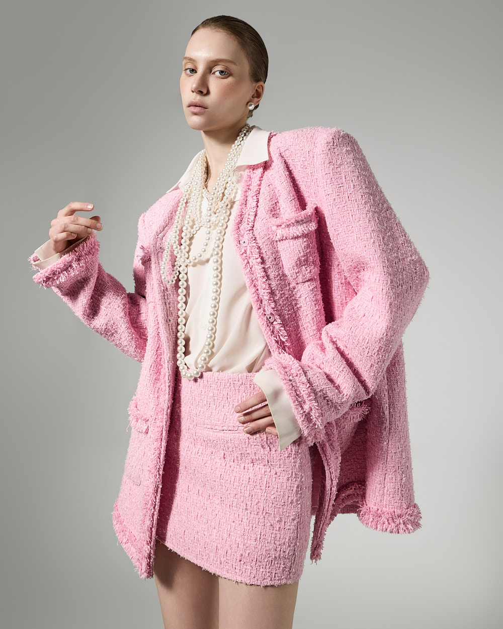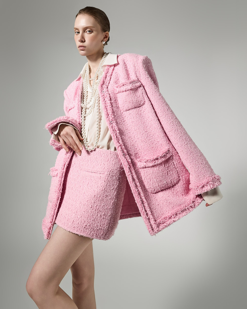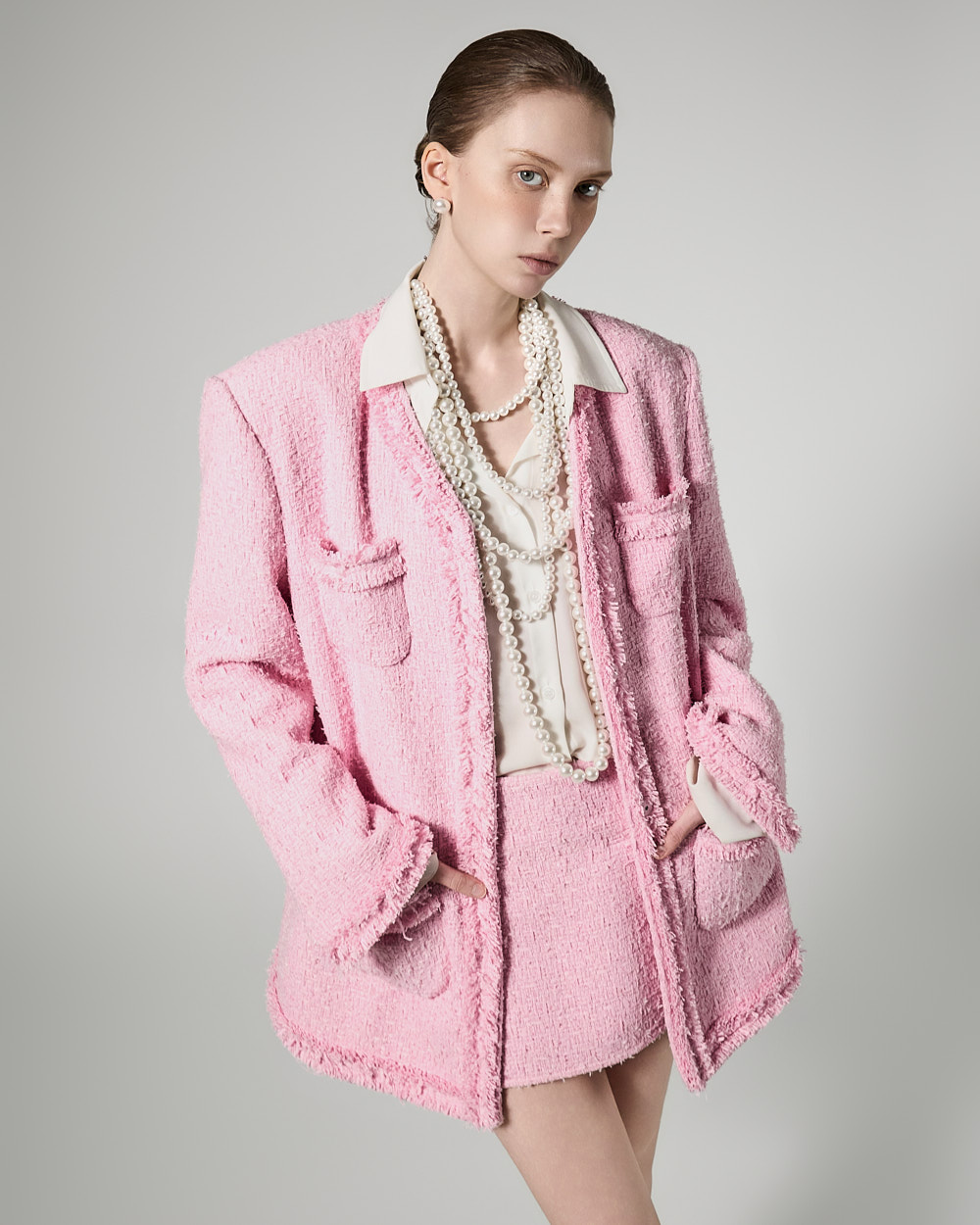모던한 무드의 프린지 트위드 셋업입니다.