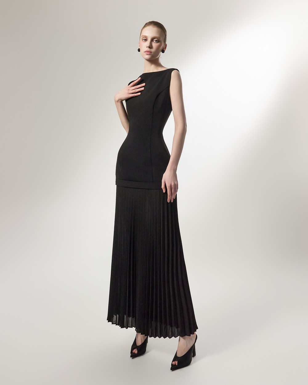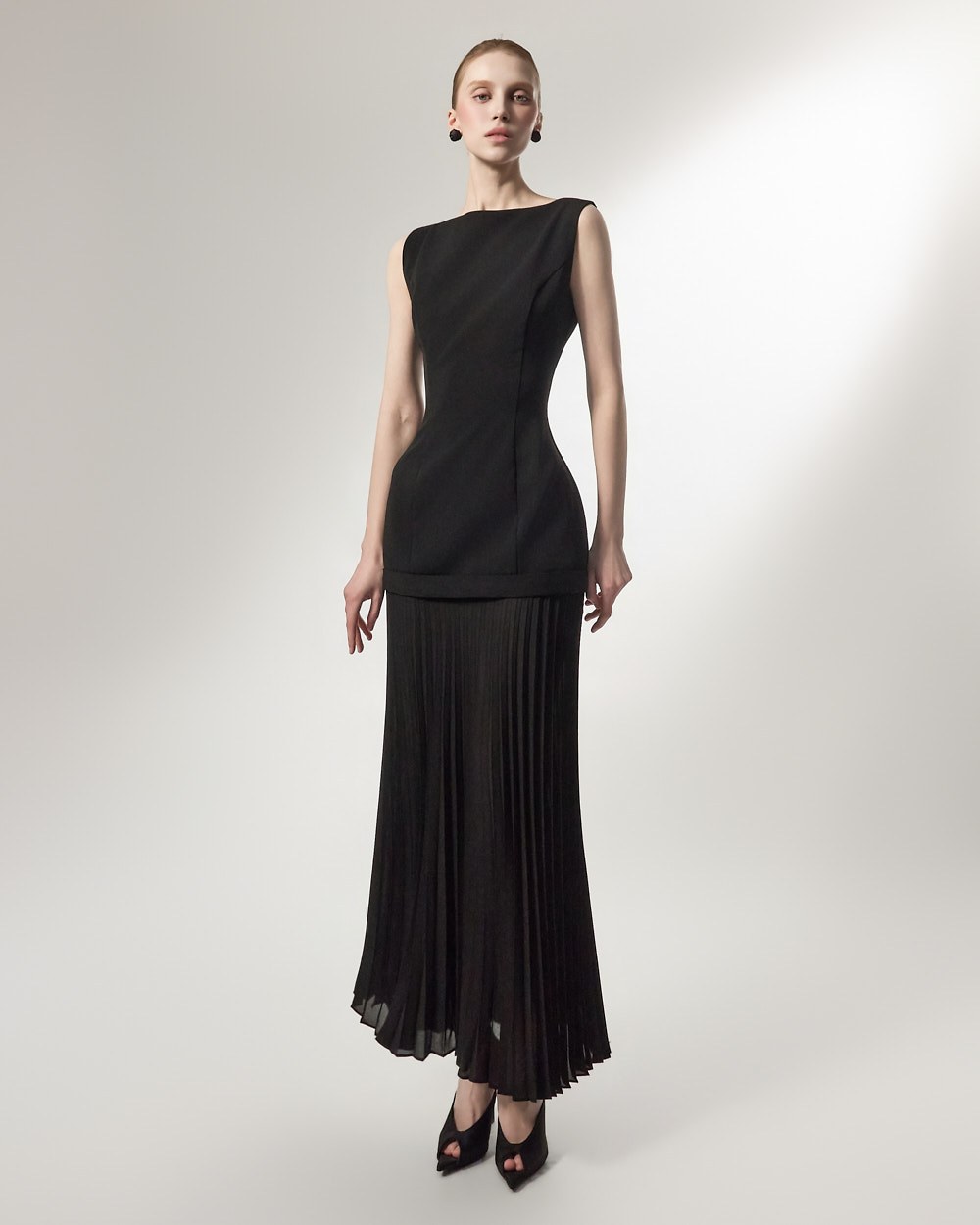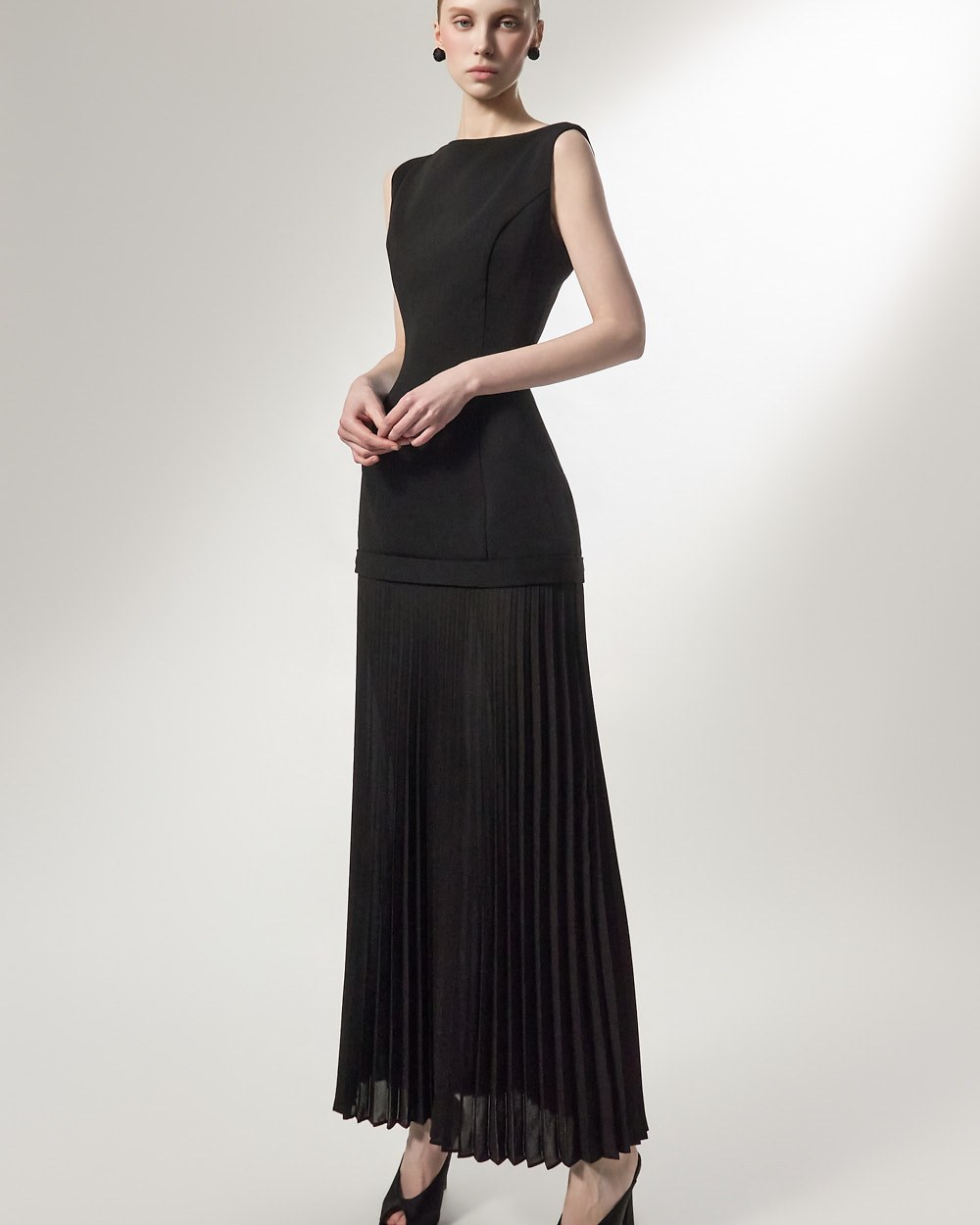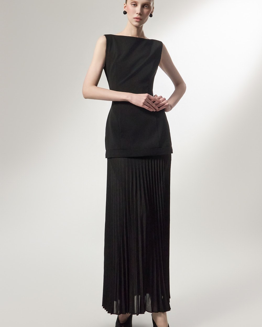 상체의 담백한 질감과 대비되는 가벼운 플리츠가