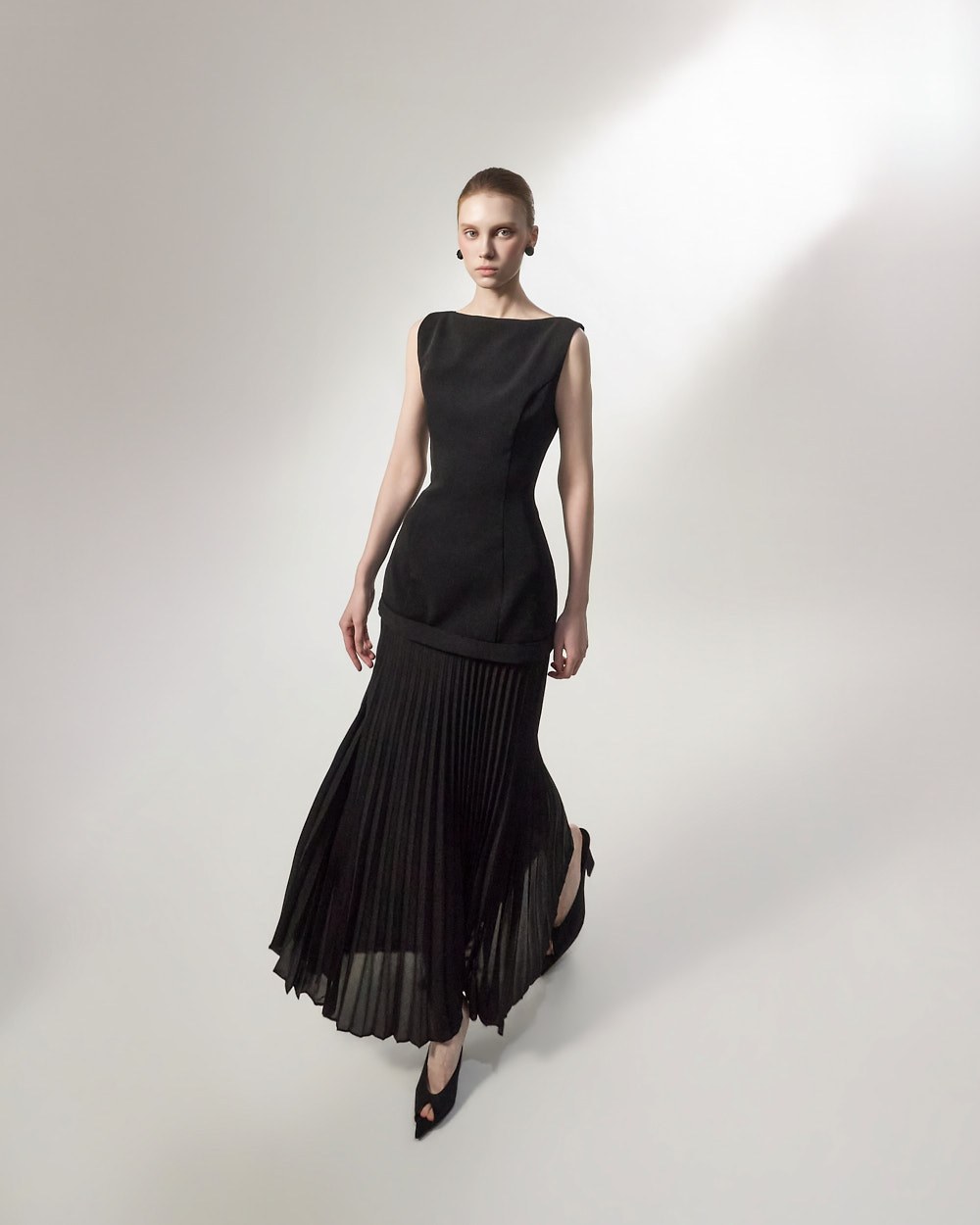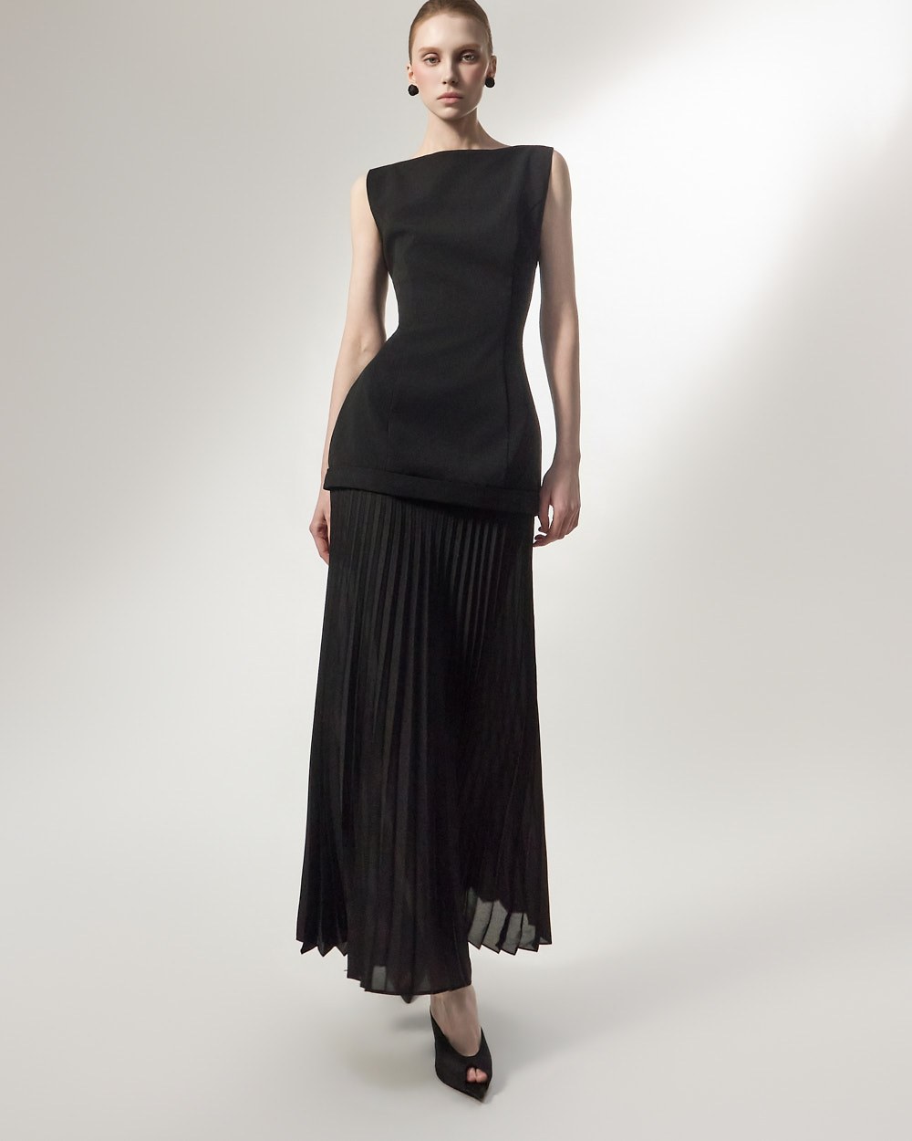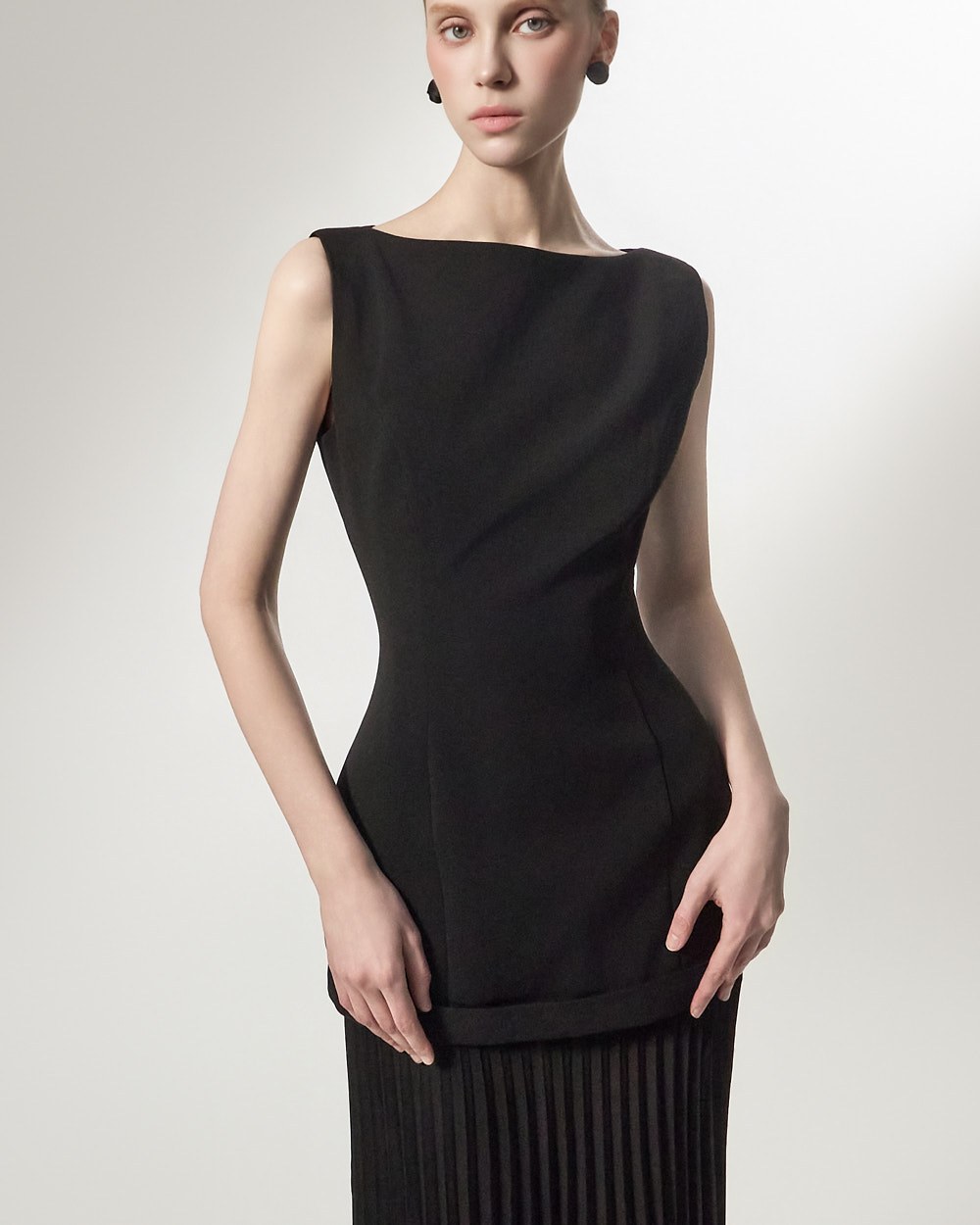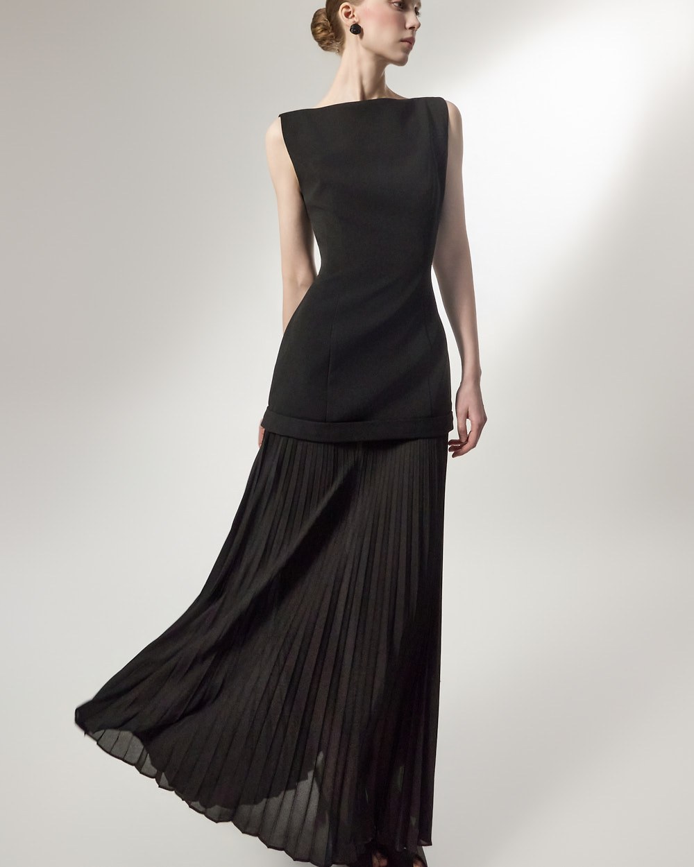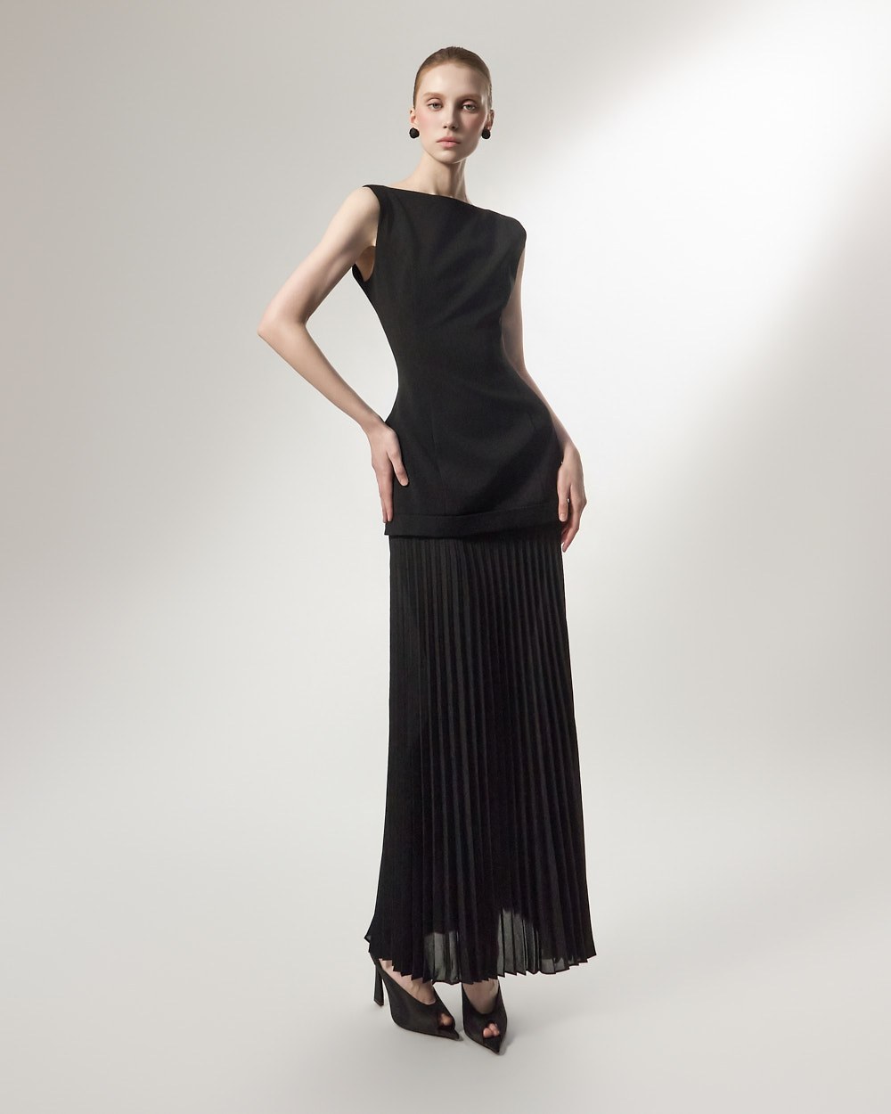 상체의 담백한 질감과 대비되는 가벼운 플리츠가