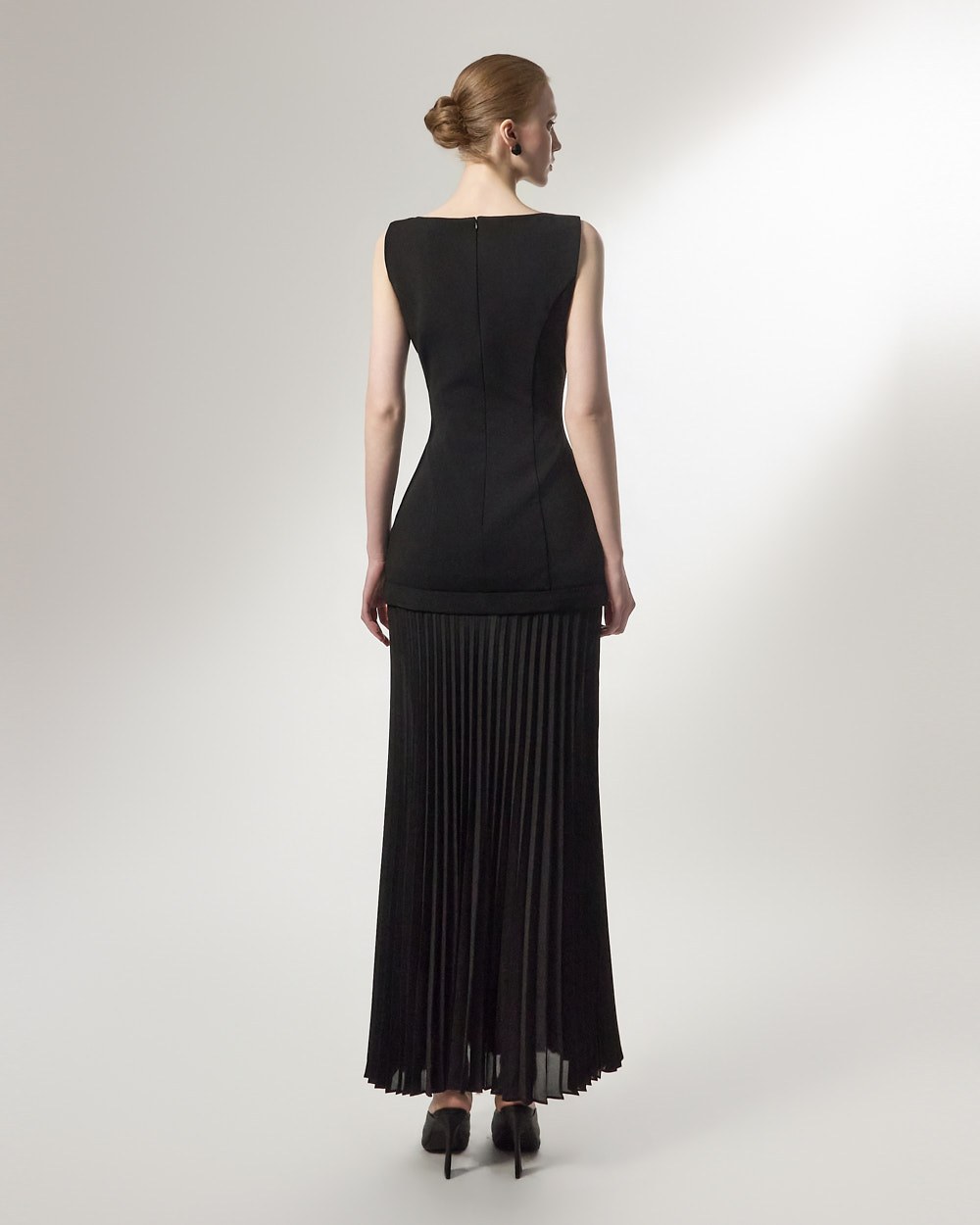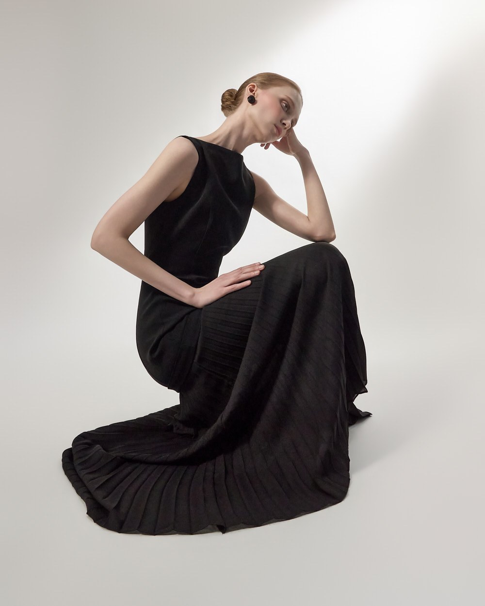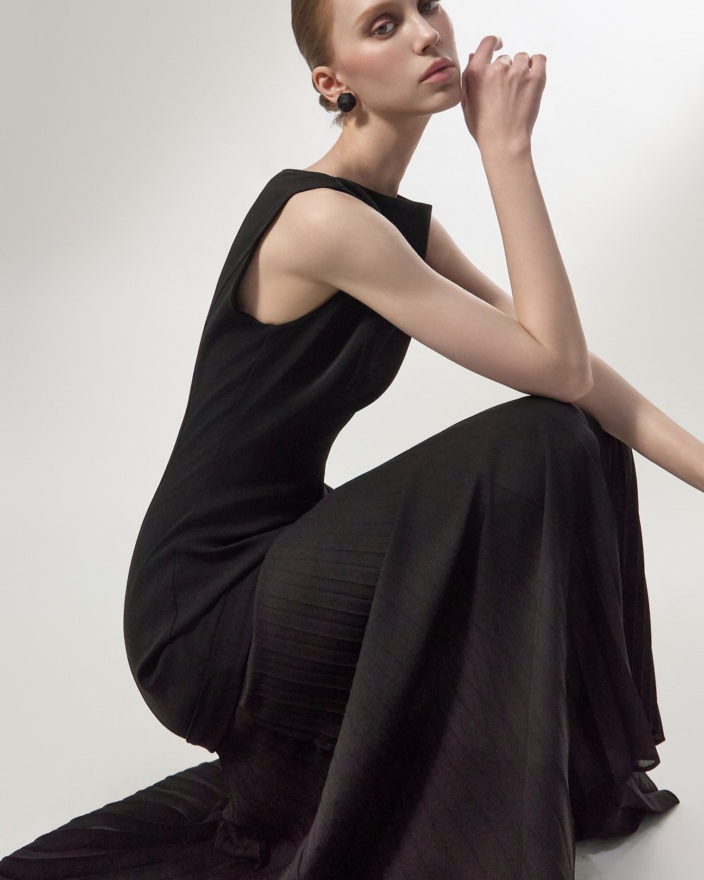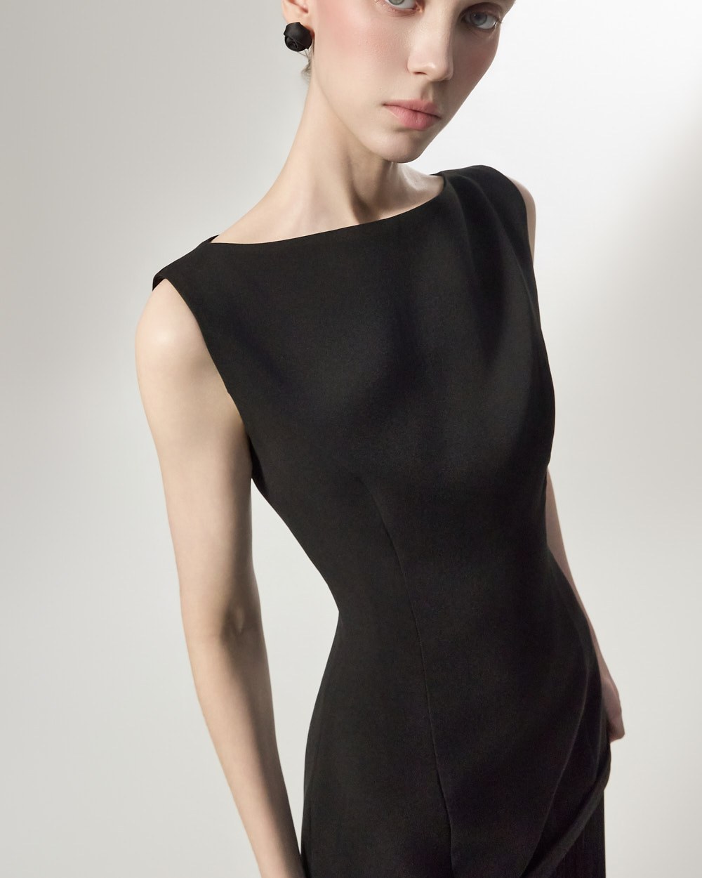 상체의 담백한 질감과 대비되는 가벼운 플리츠가