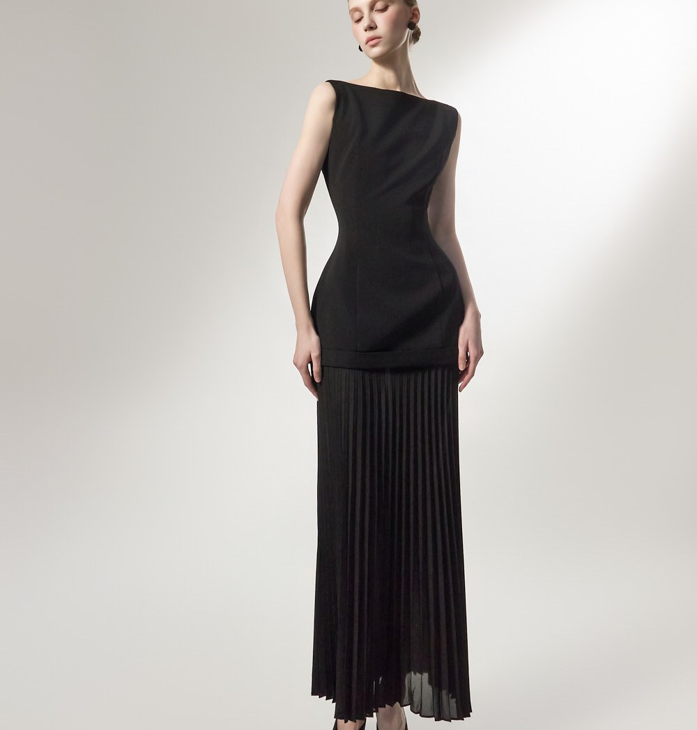 밑단에는 플리츠 디테일의 스커트가 레이어드되어