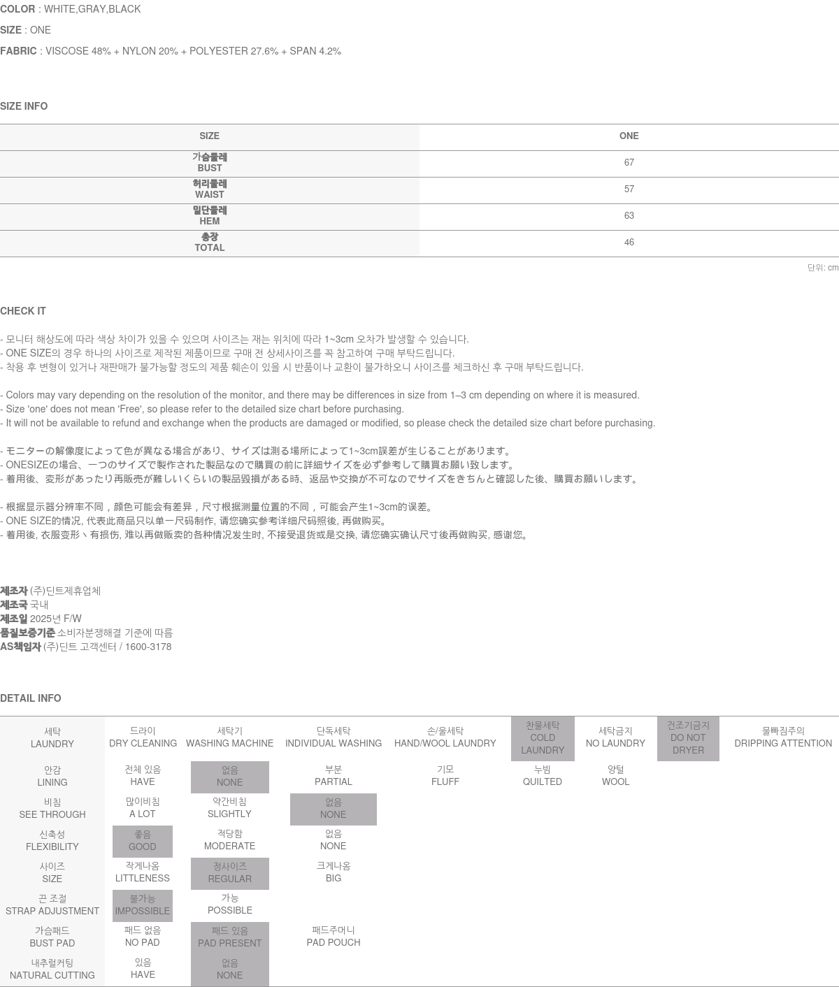 • (주)딘트의 의류는 일반 세탁 및 건조기 사용 시 원단의 변형이나 제품 손상의 원인이 될 수 있으므로, 하단에 안내된 세탁 방법을 따라주시기를 권장합니다.