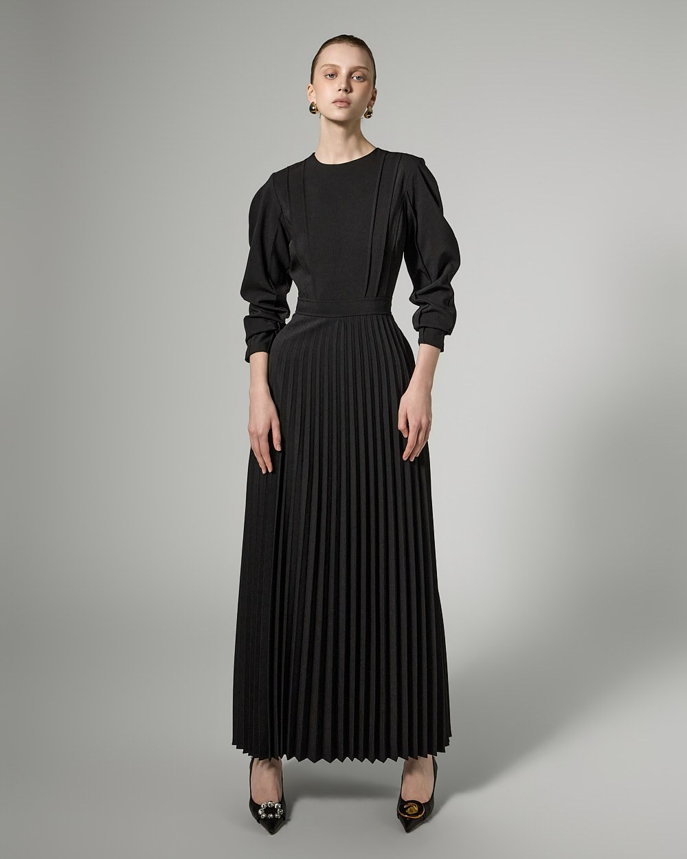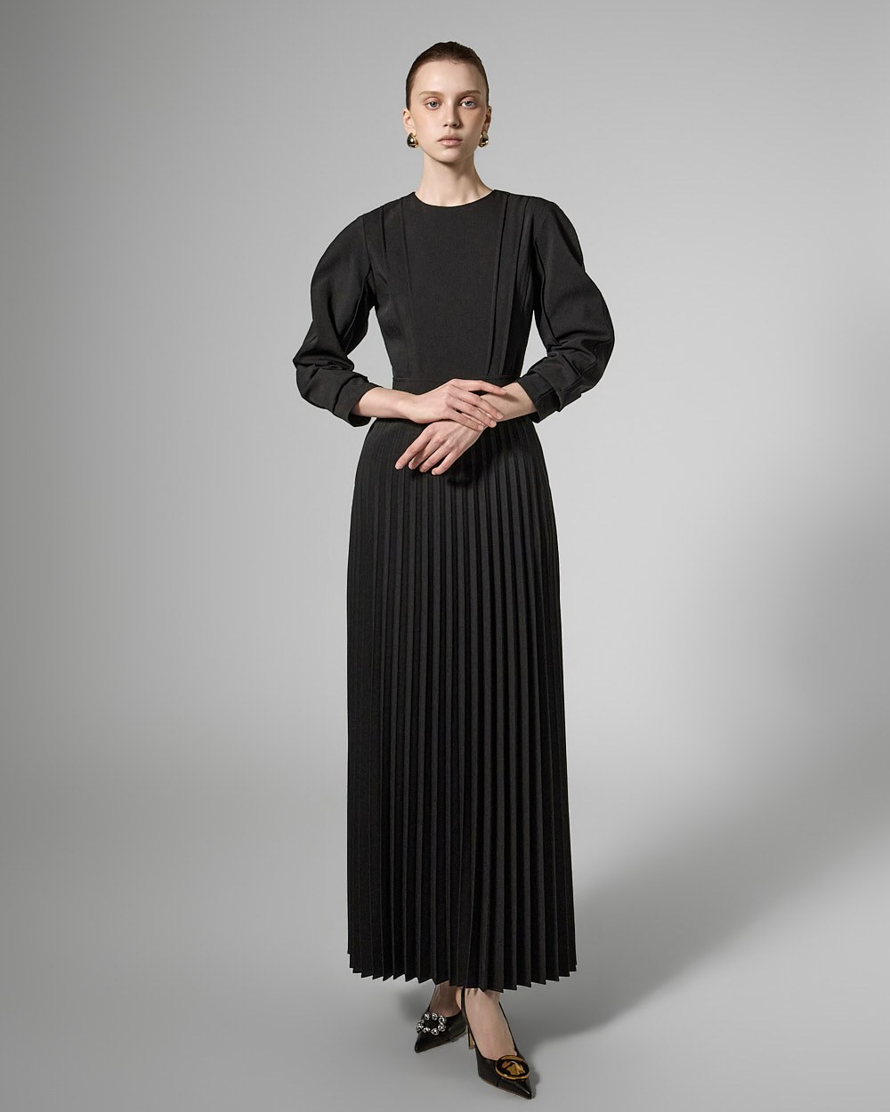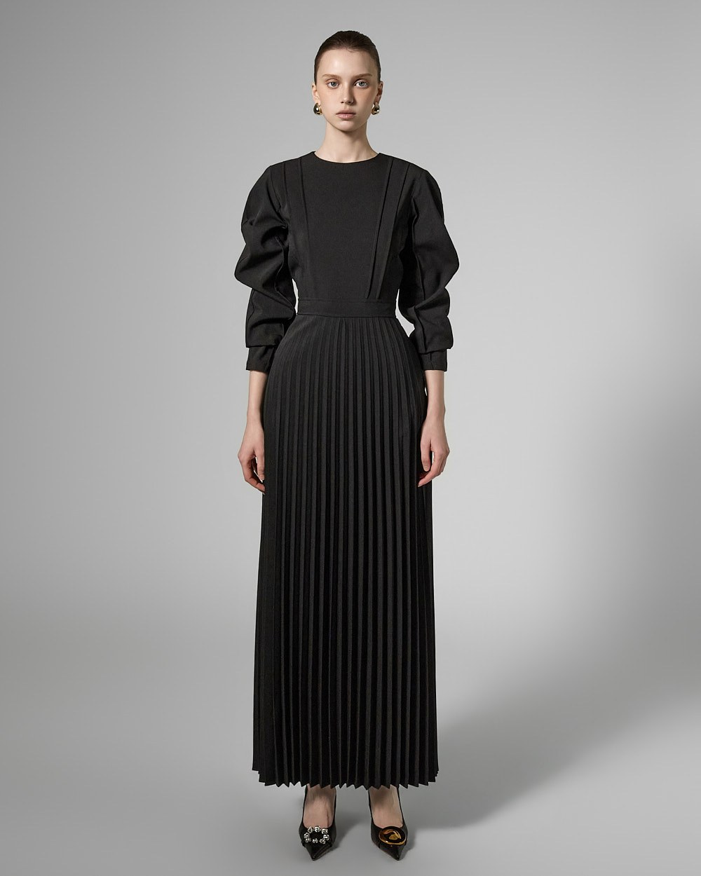 우아한 무드의 플리츠 퍼프 원피스입니다.