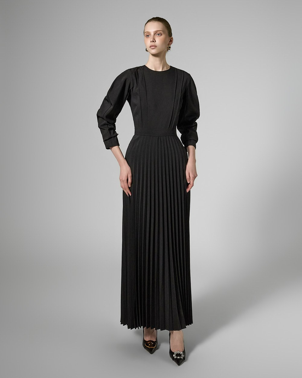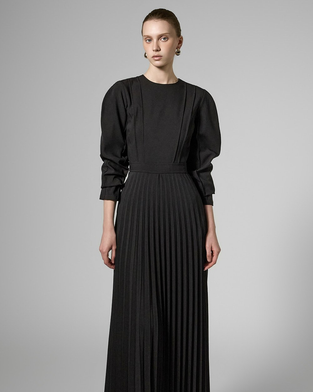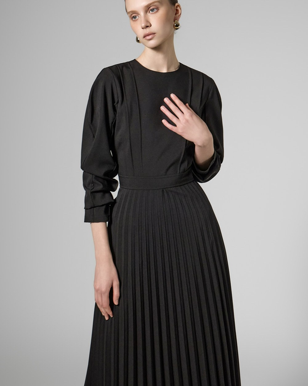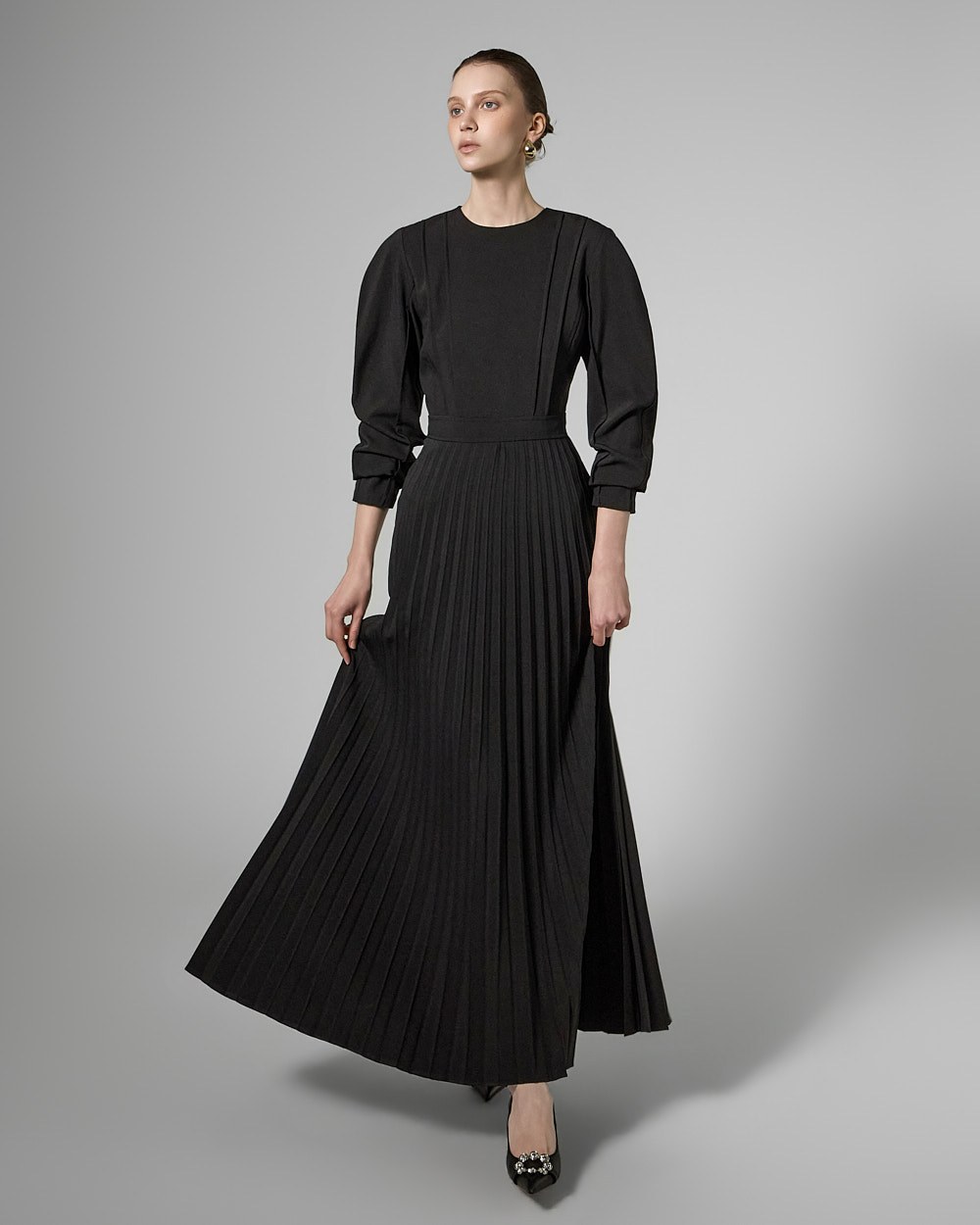 허리 라인 아래로는 잔잔한 플리츠 주름이 자연스럽게 퍼져