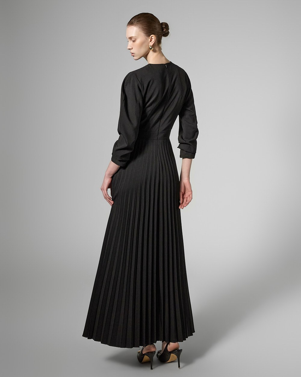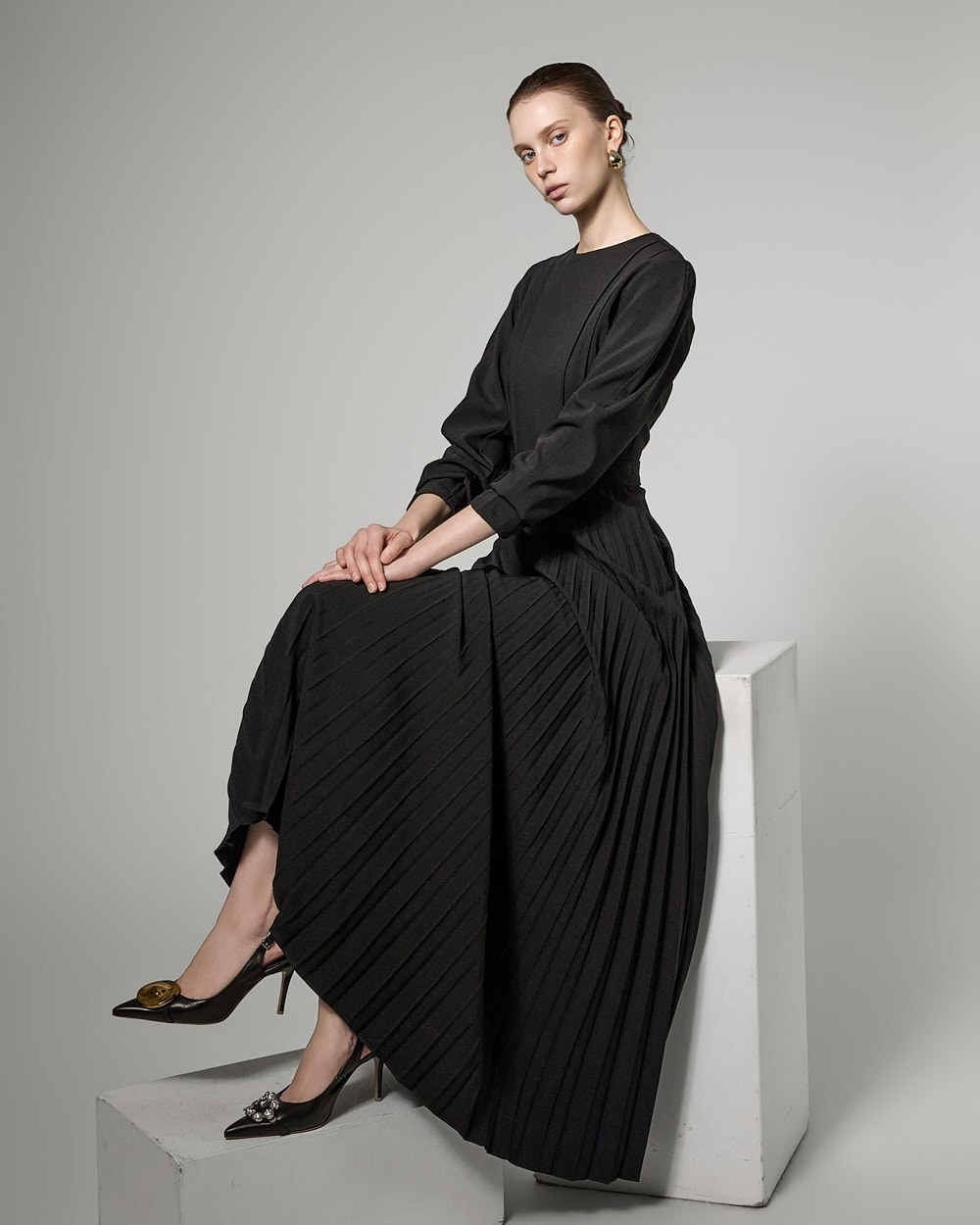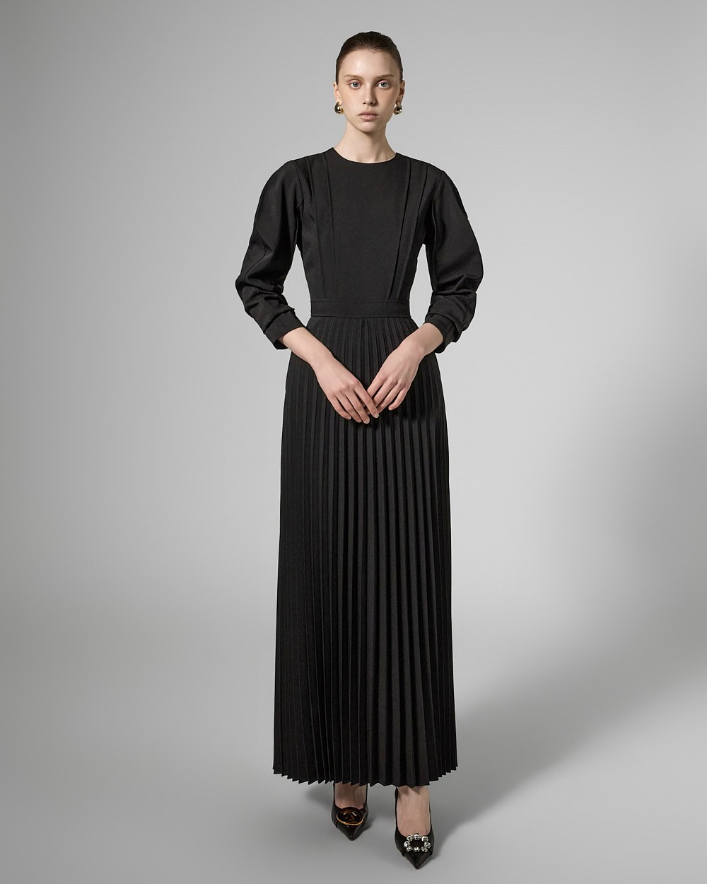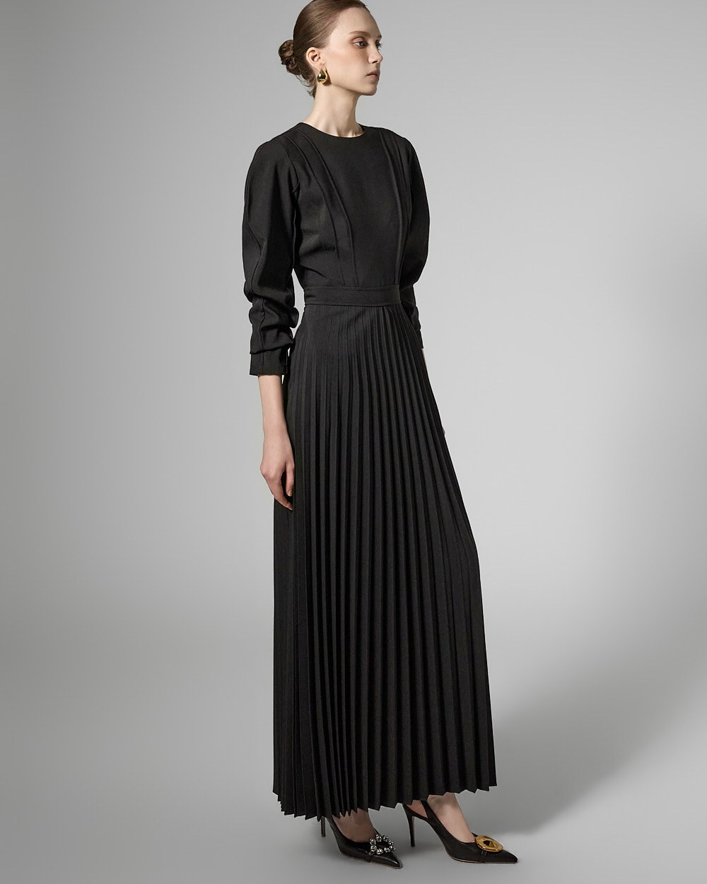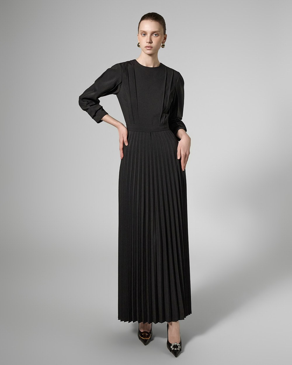 허리 라인 아래로는 잔잔한 플리츠 주름이 자연스럽게 퍼져