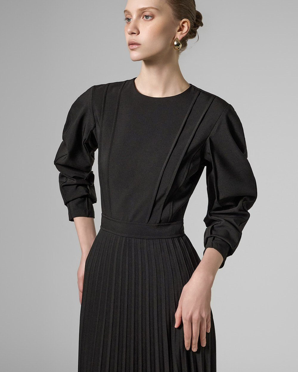 둥근 퍼프 소매와 절개 라인이 포인트가 되어