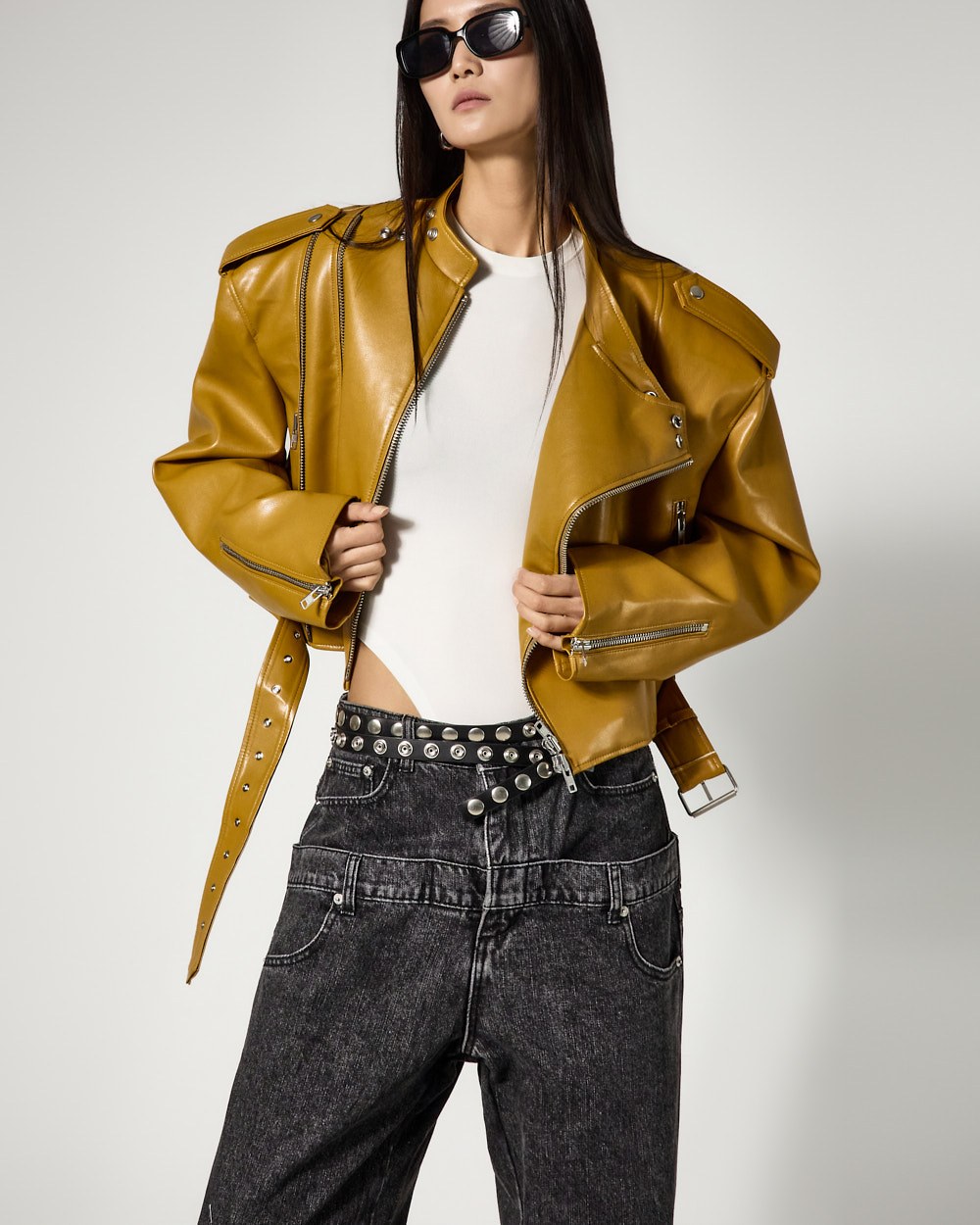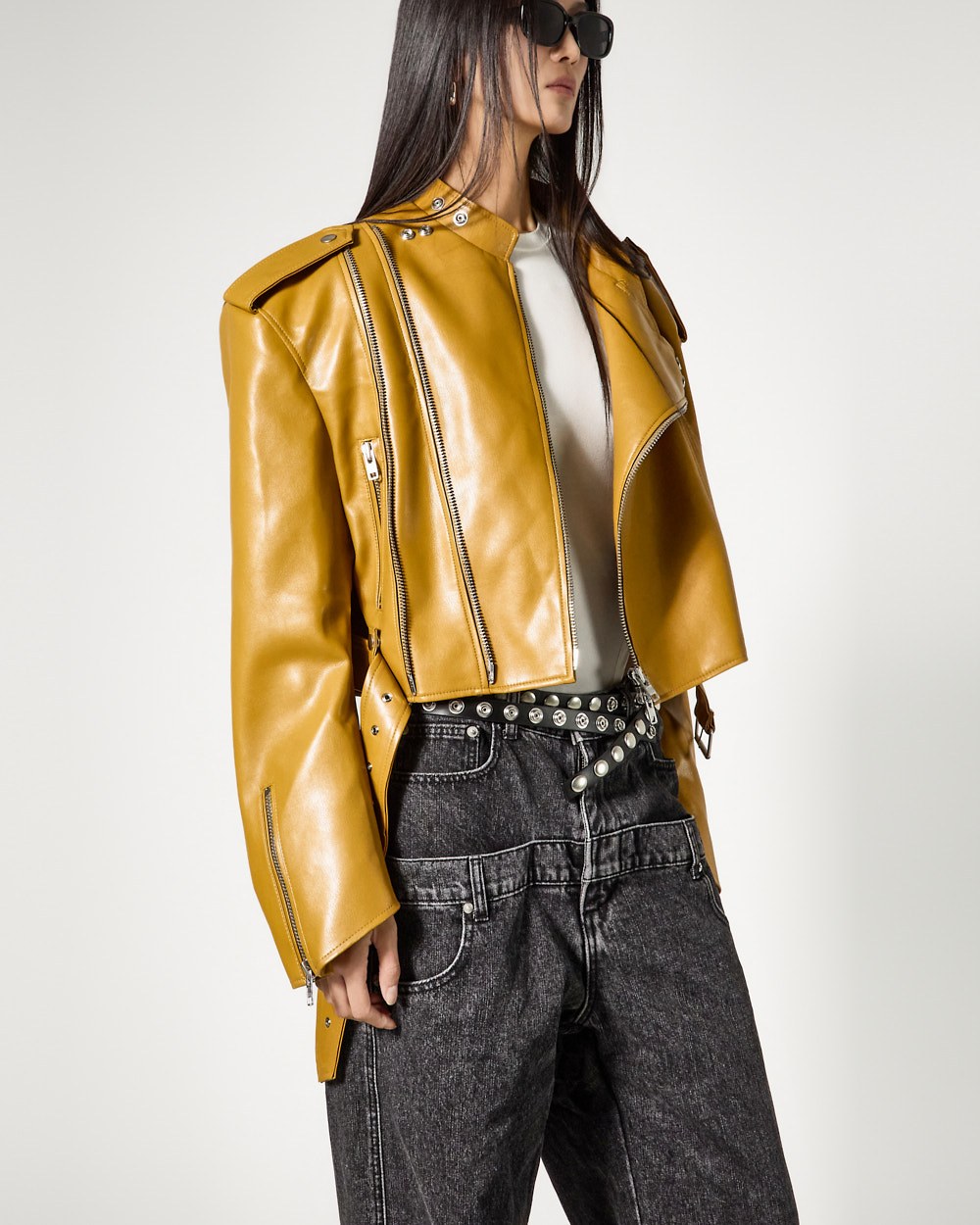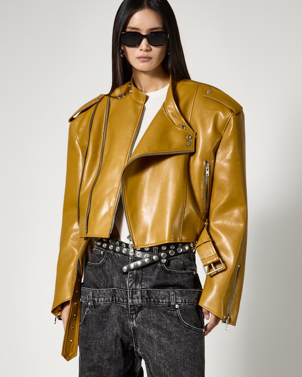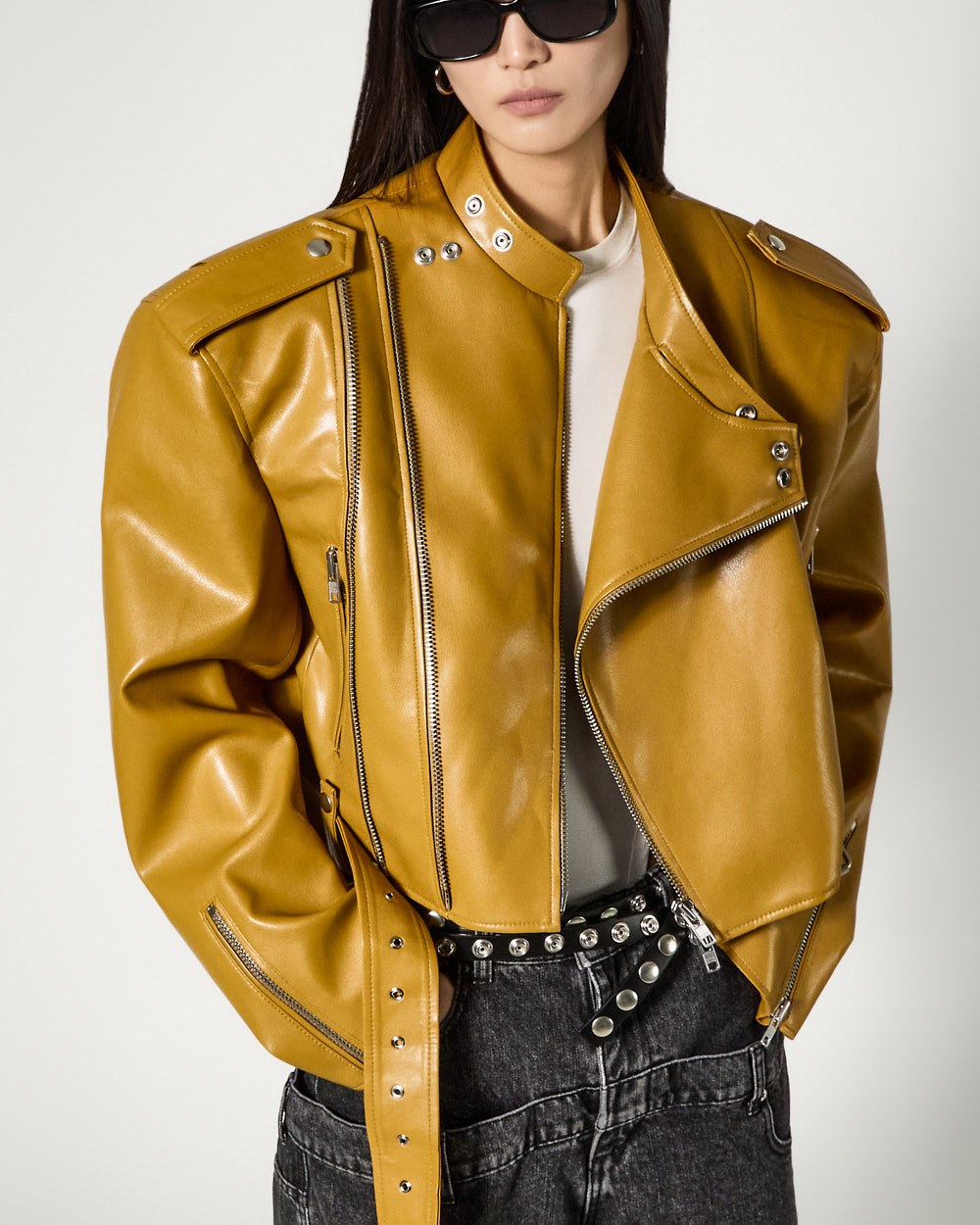 시크한 무드의 비건레더 바이커 자켓입니다.