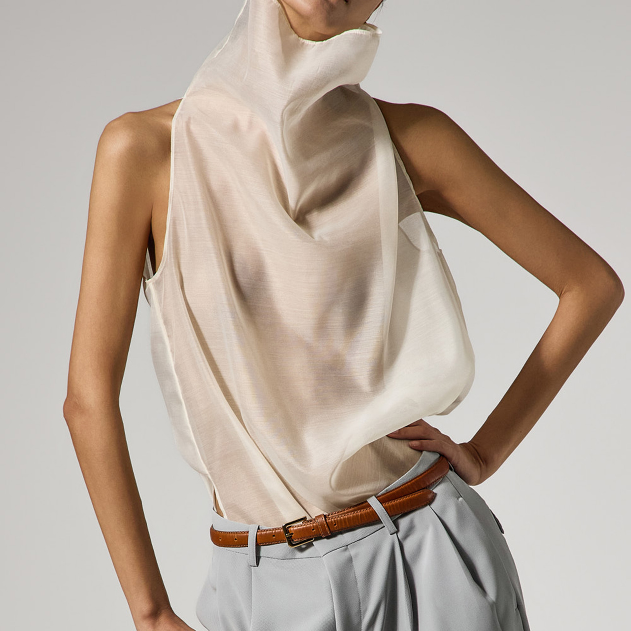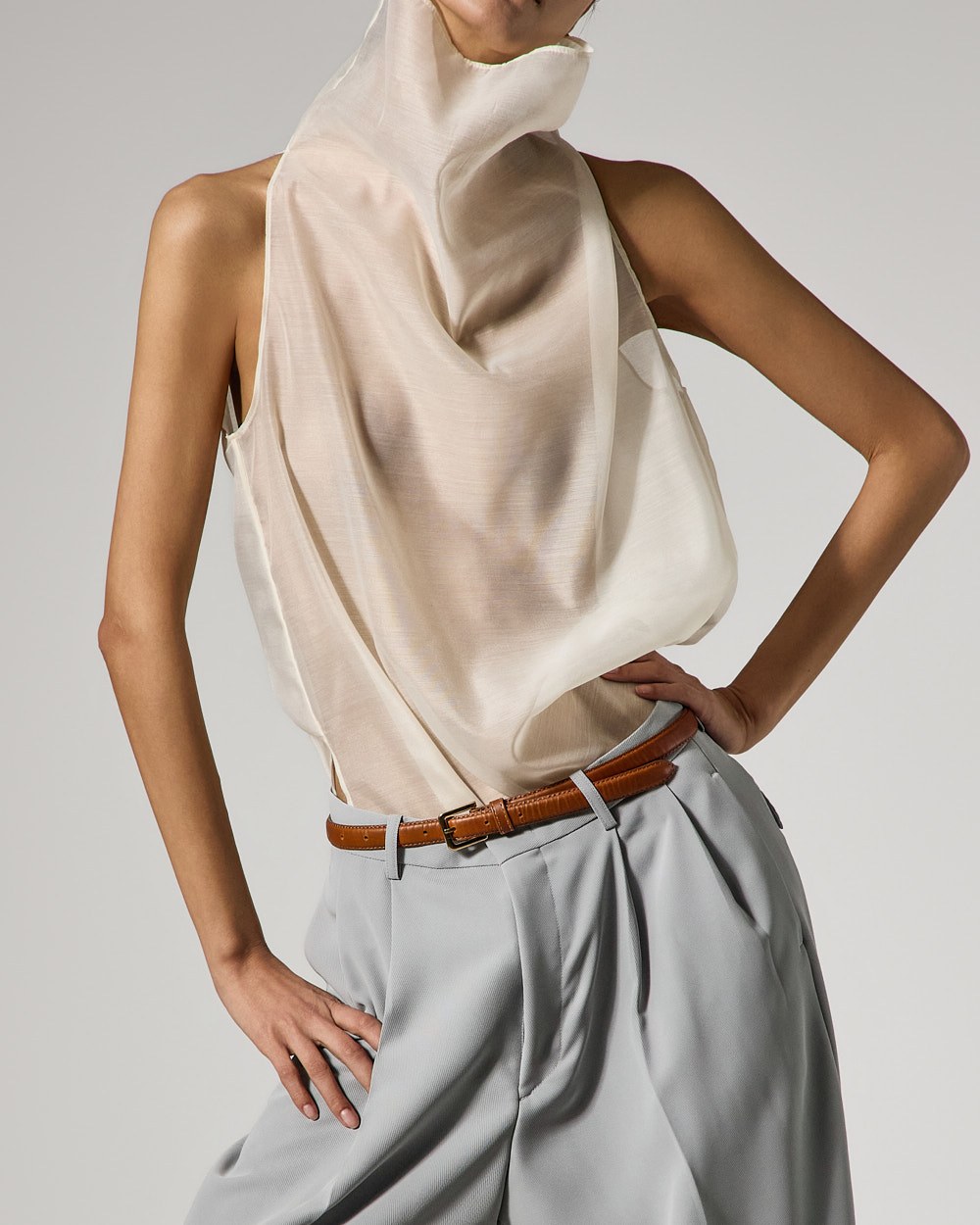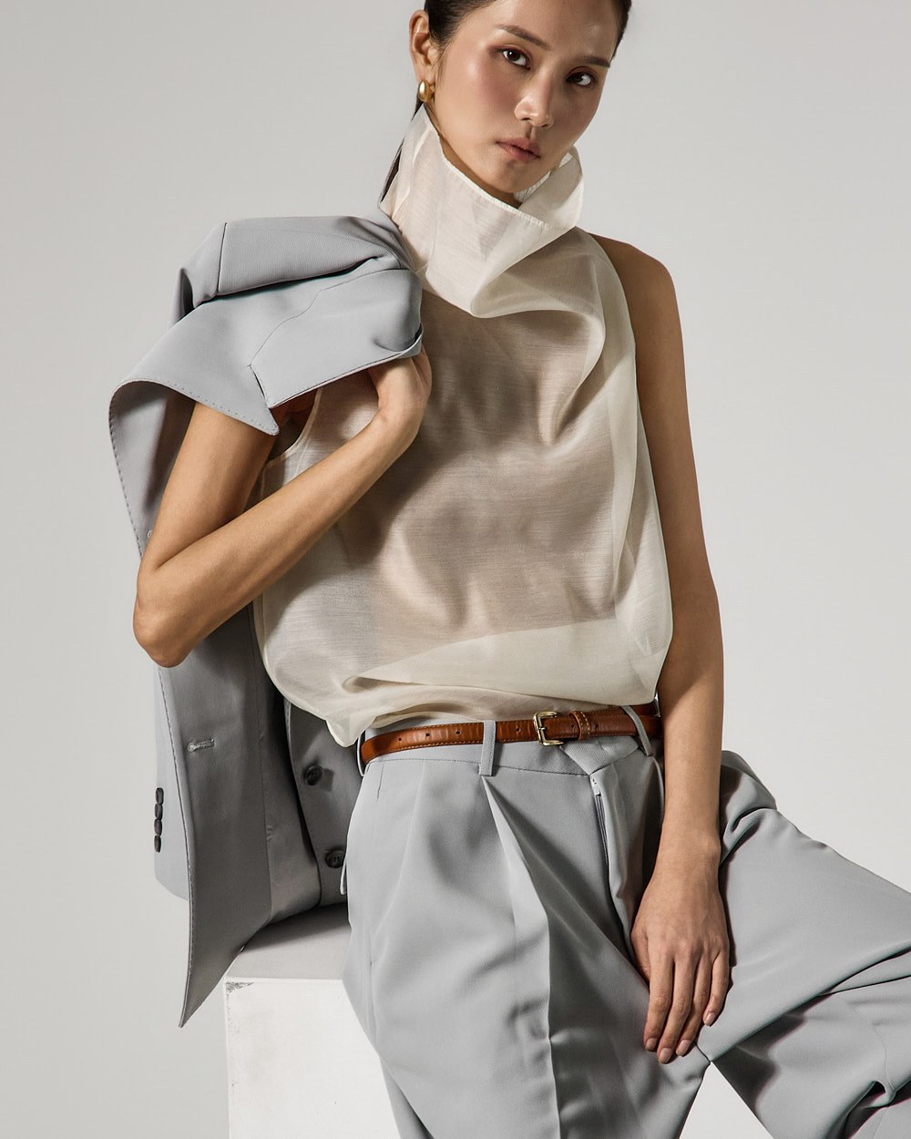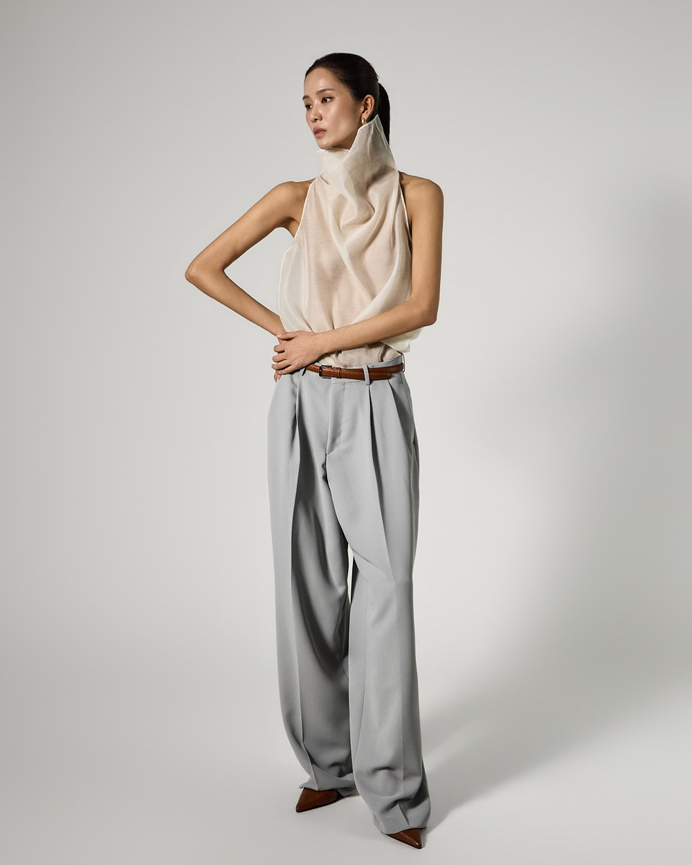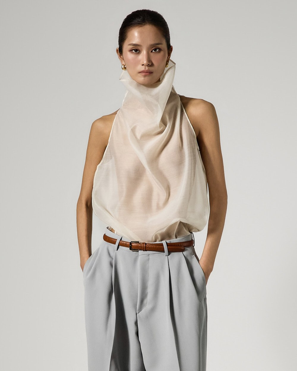하이넥 라인으로 목을 감싸듯 부드럽게 떨어져