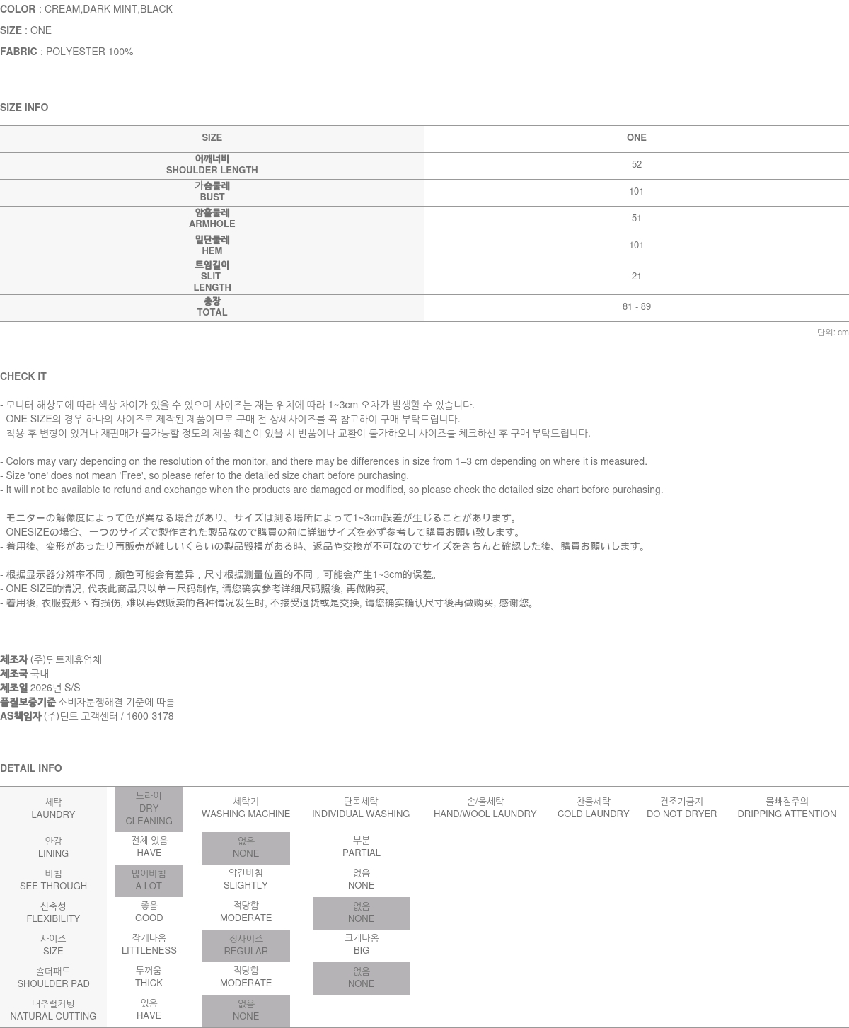 174CM 모델 ONE 사이즈, CREAM 컬러 착용하였습니다.