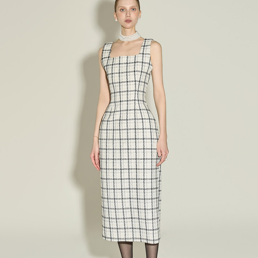 슬리브리스 디자인에 미디 기장감의 H라인 실루엣으로