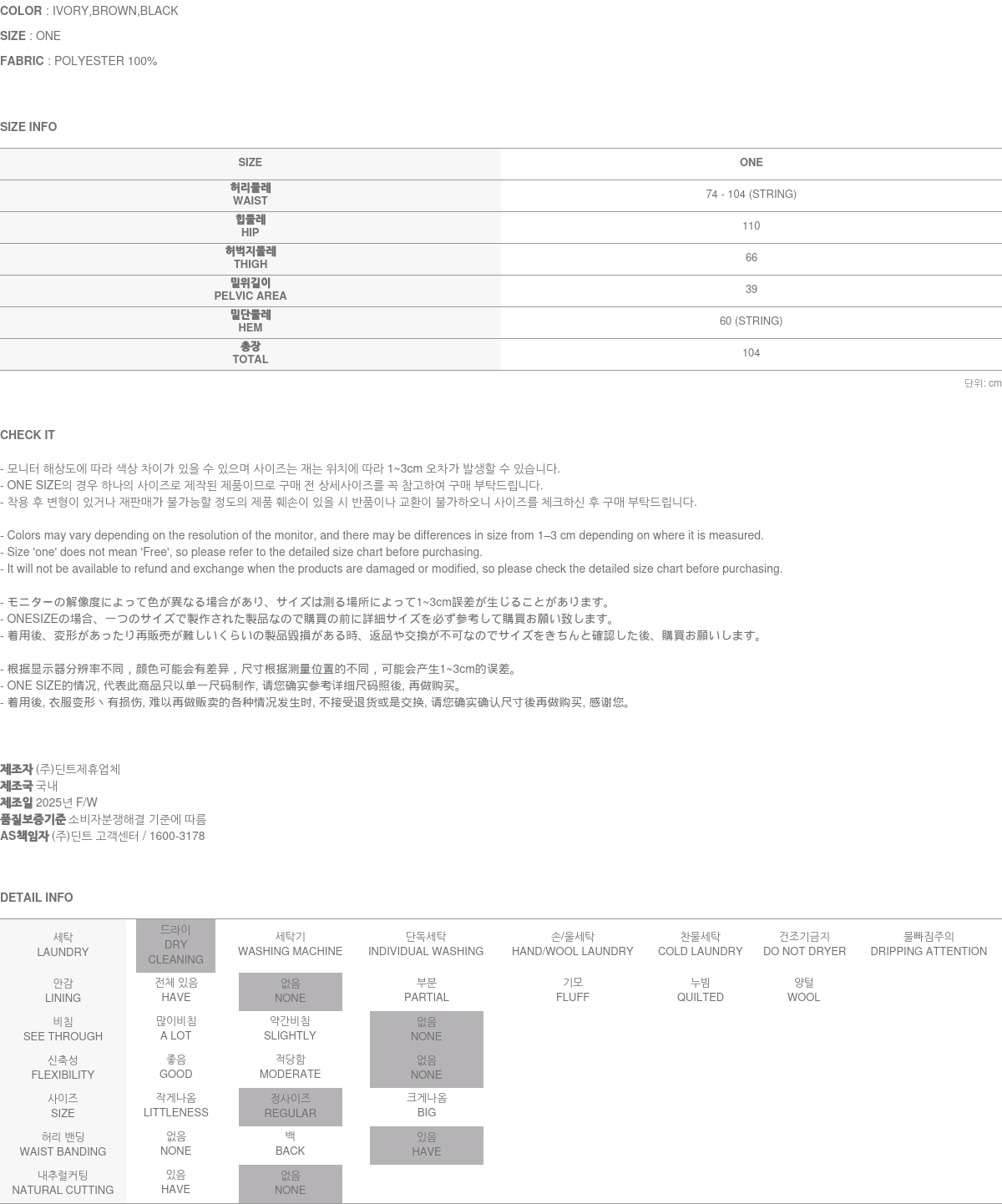 171CM 모델 ONE 사이즈, BROWN 컬러 착용하였습니다.