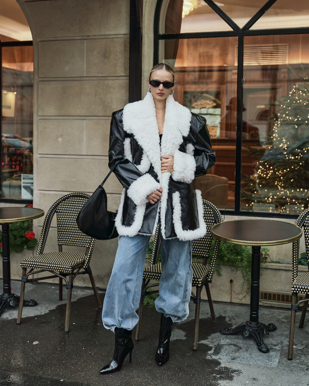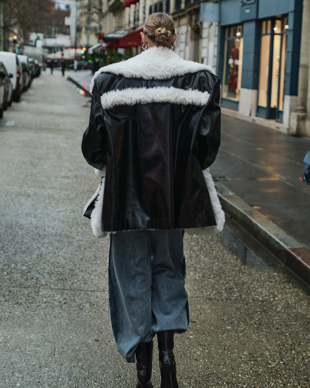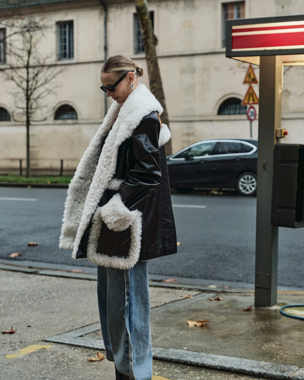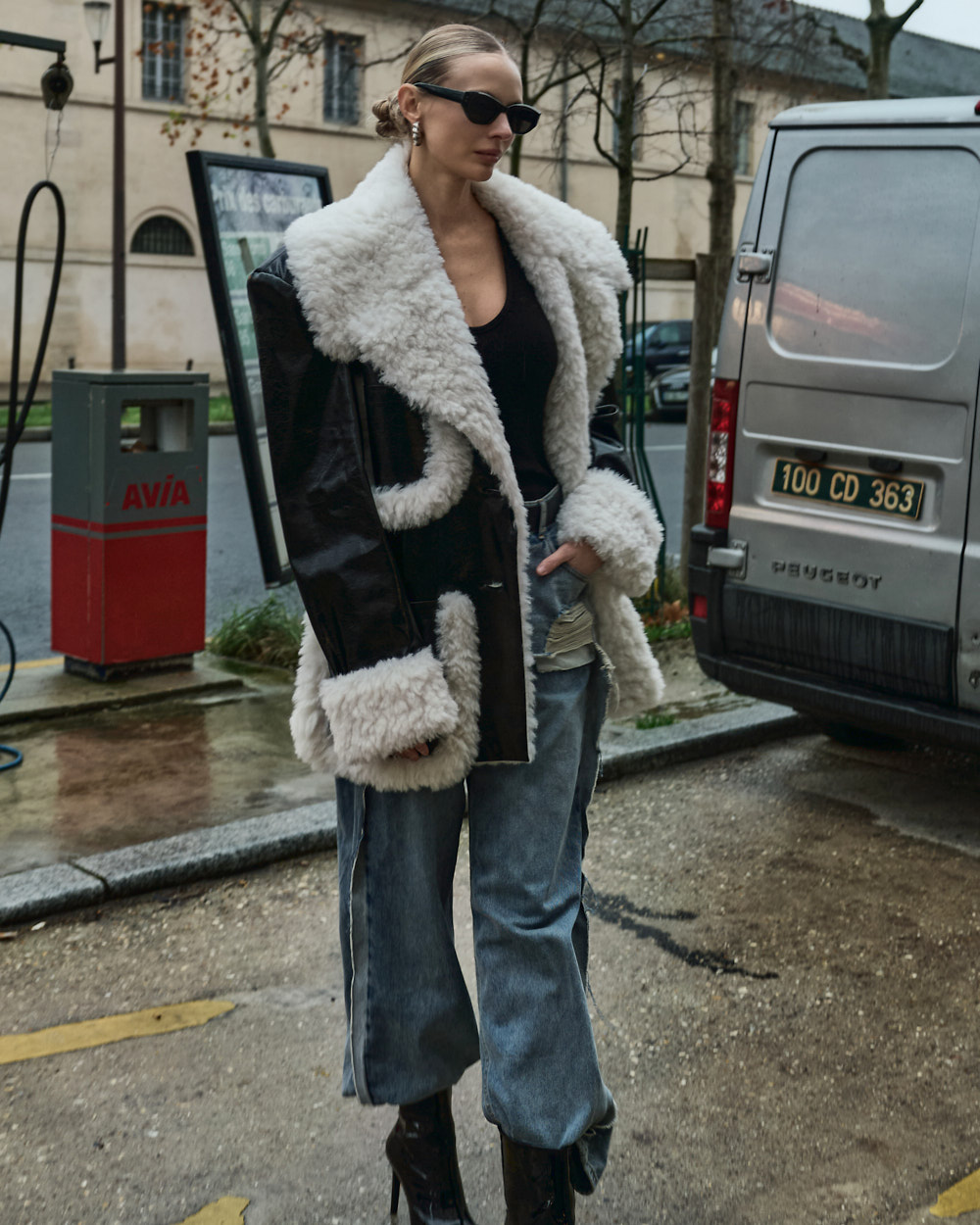 힙을 덮는 루즈한 기장감의 무스탕 코트로 체형 커버에도 탁월하고