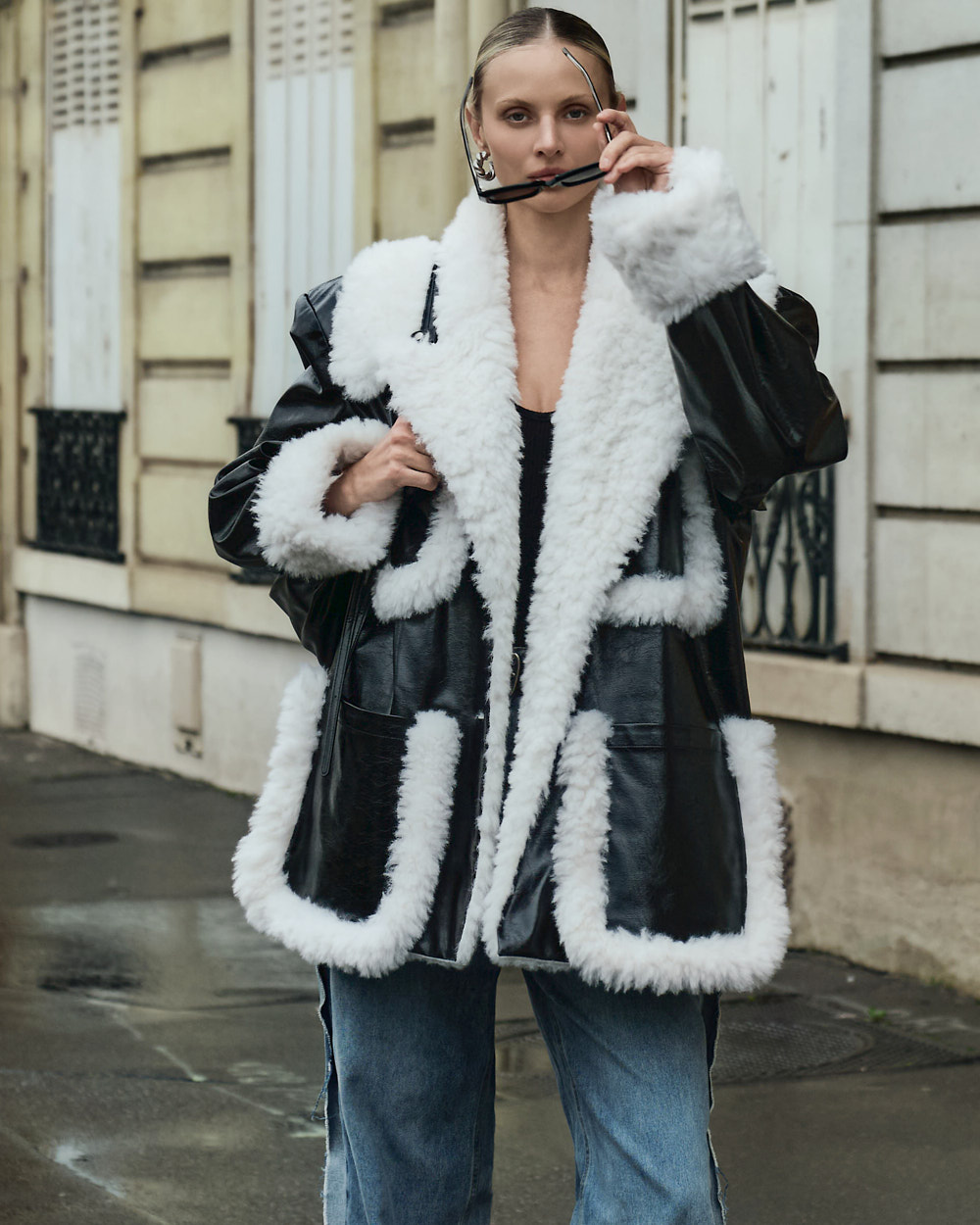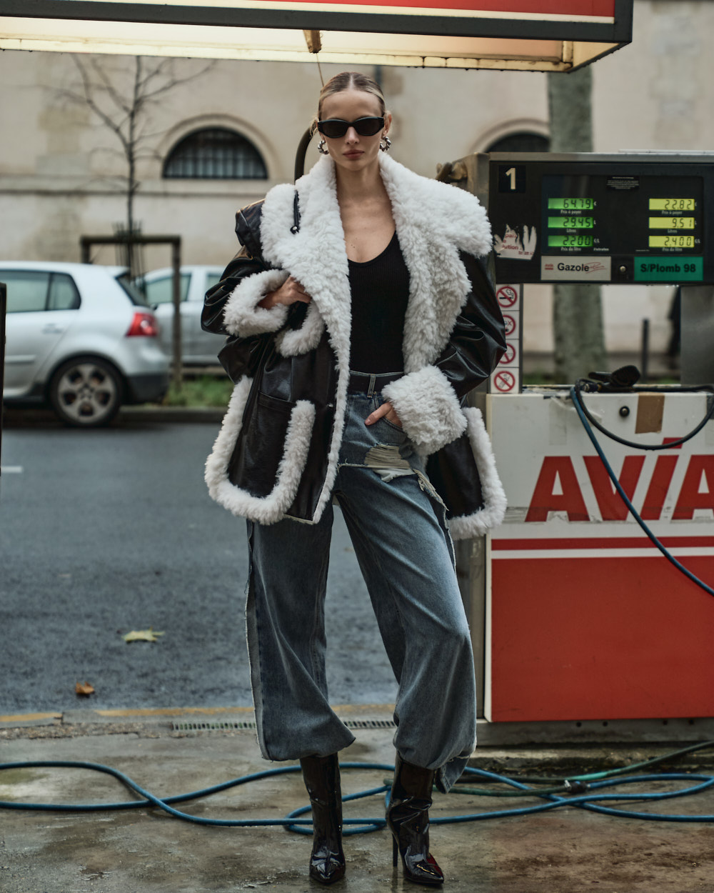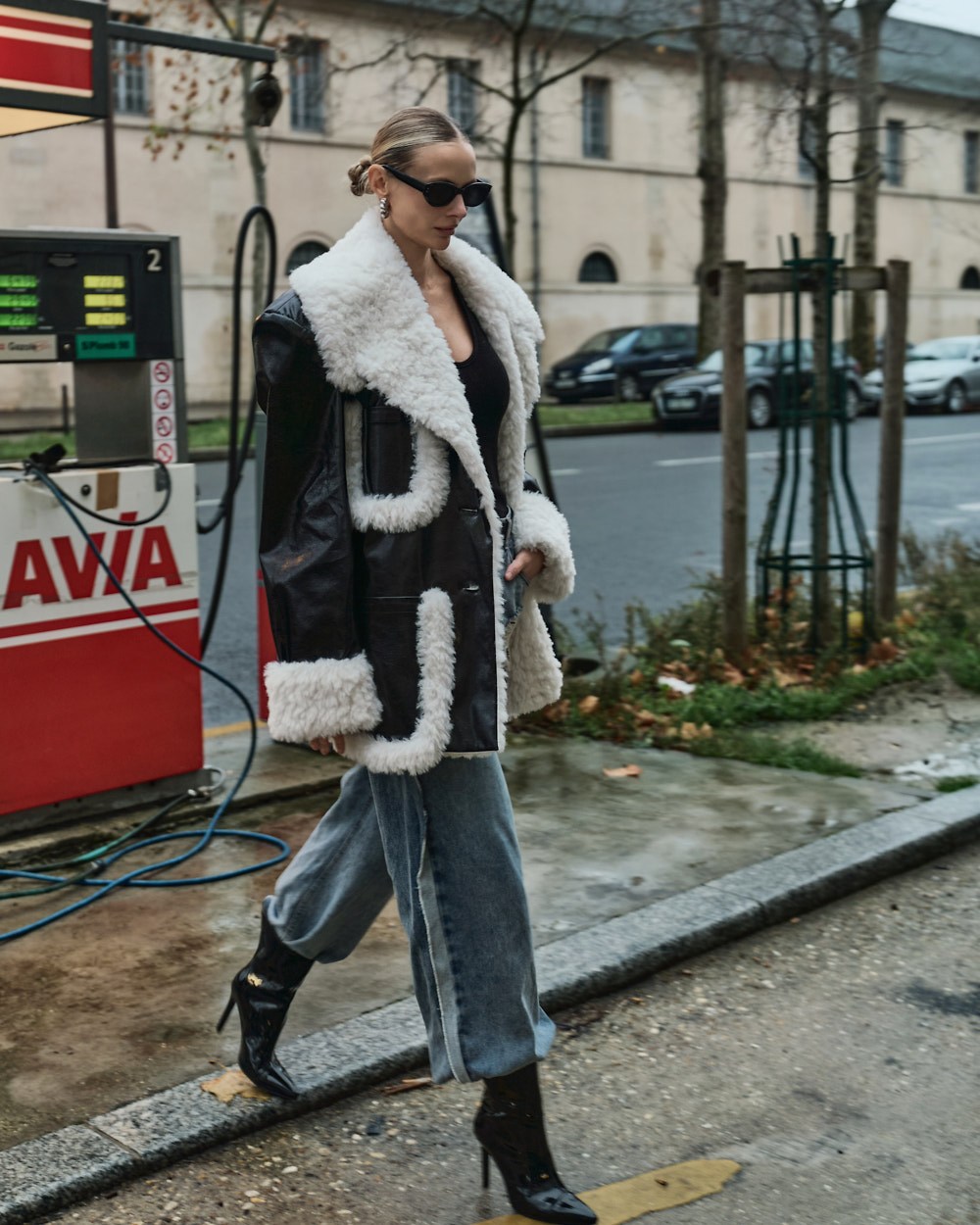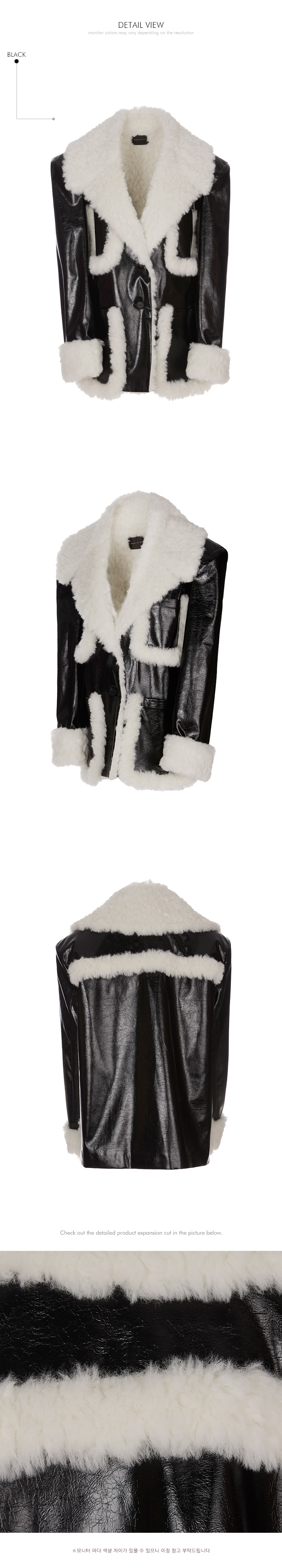 힙을 덮는 루즈한 기장감의 무스탕 코트로 체형 커버에도 탁월하고