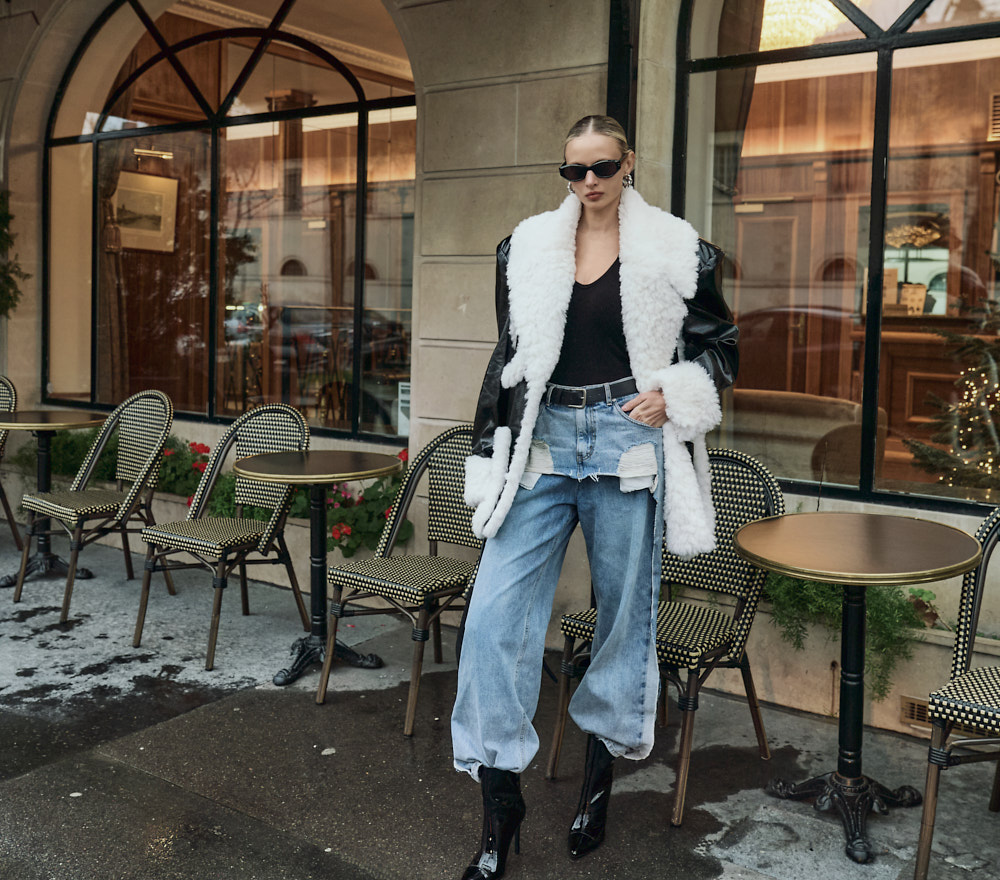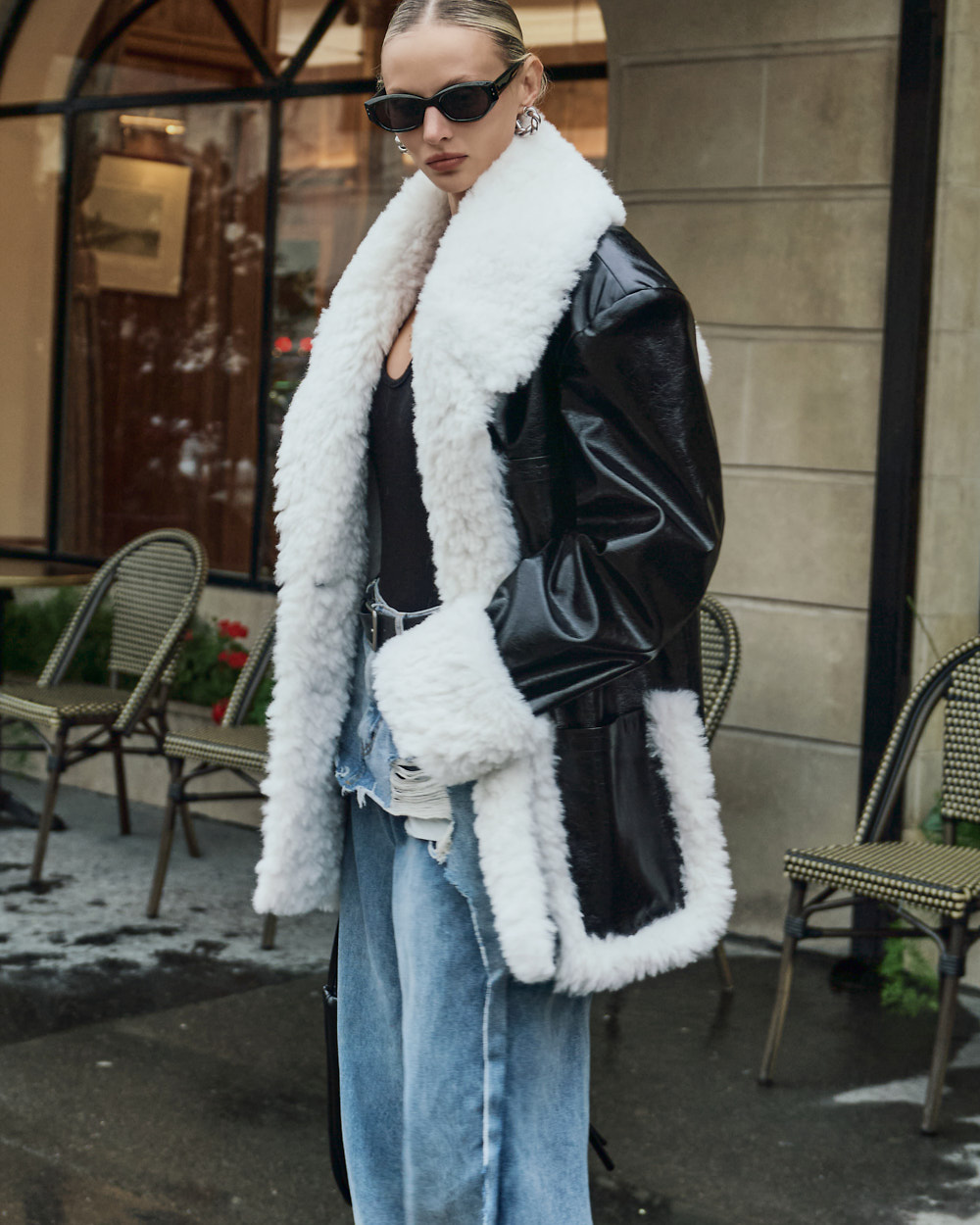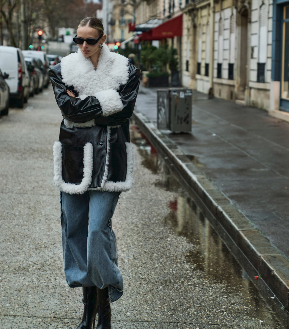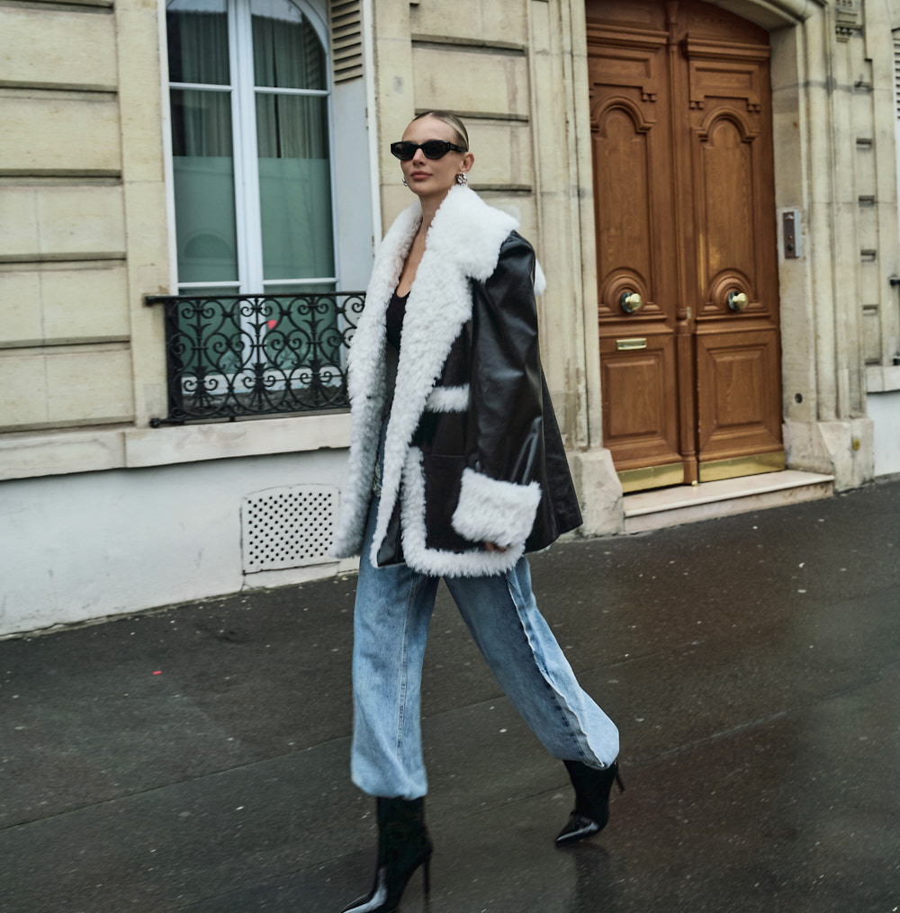 힙을 덮는 루즈한 기장감의 무스탕 코트로 체형 커버에도 탁월하고