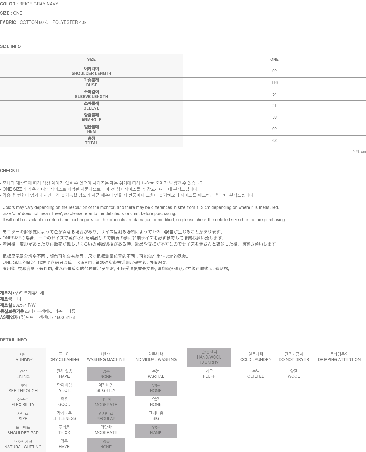COTTON 60%, POLYESTER 40% 혼방 소재로 제작되어
