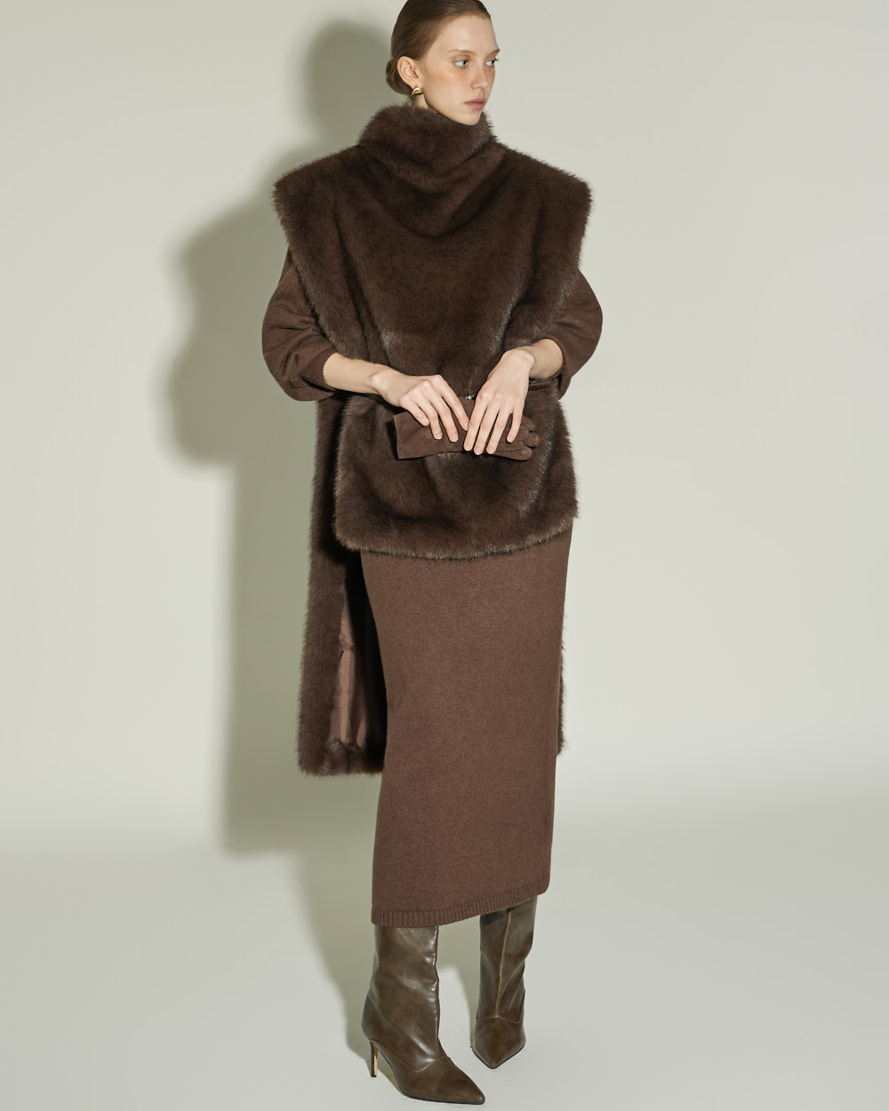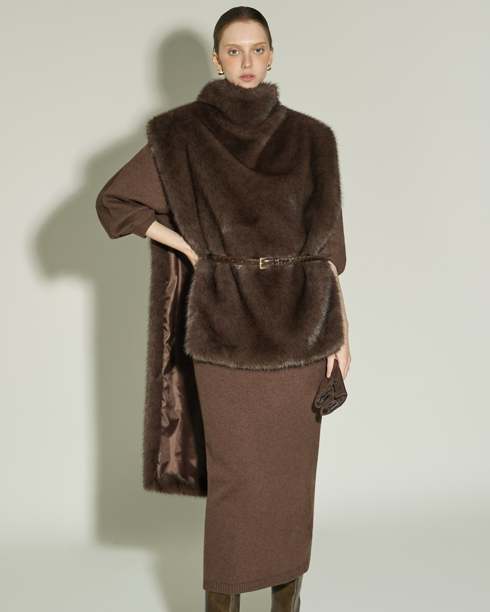 넓게 올라오는 하이 터틀넥으로 세련된 실루엣을 연출합니다.