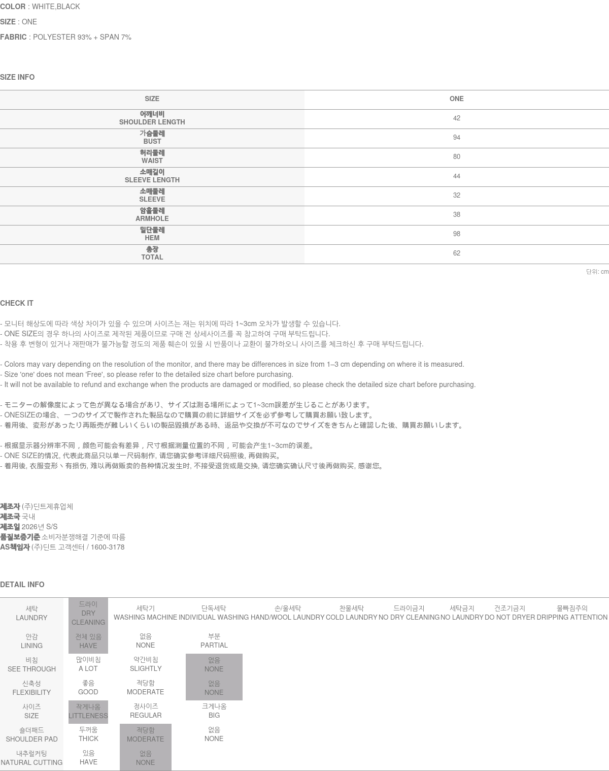 174CM 모델 ONE 사이즈, WHITE 컬러 착용하였습니다.