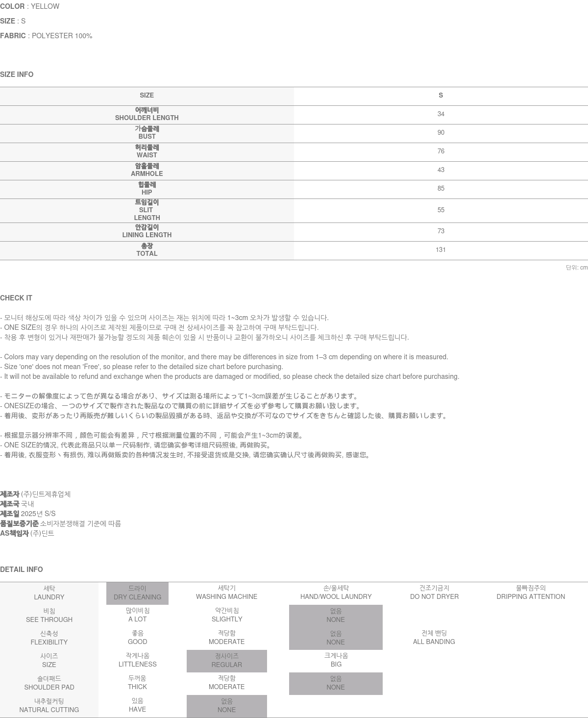 • (주)딘트의 의류는 일반 세탁 및 건조기 사용 시 원단의 변형이나 제품 손상의 원인이 될 수 있으므로, 하단에 안내된 세탁 방법을 따라주시기를 권장합니다.