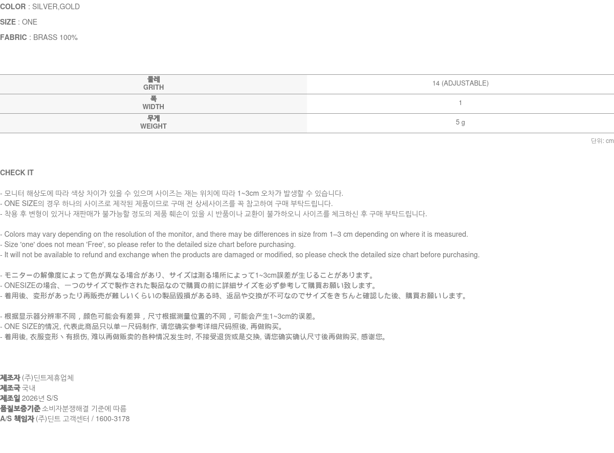 • 액세서리 및 잡화는 장시간 보관 및 착용 시 변색이나 변형이 될 수 있습니다.