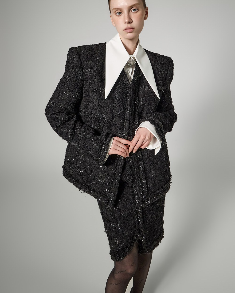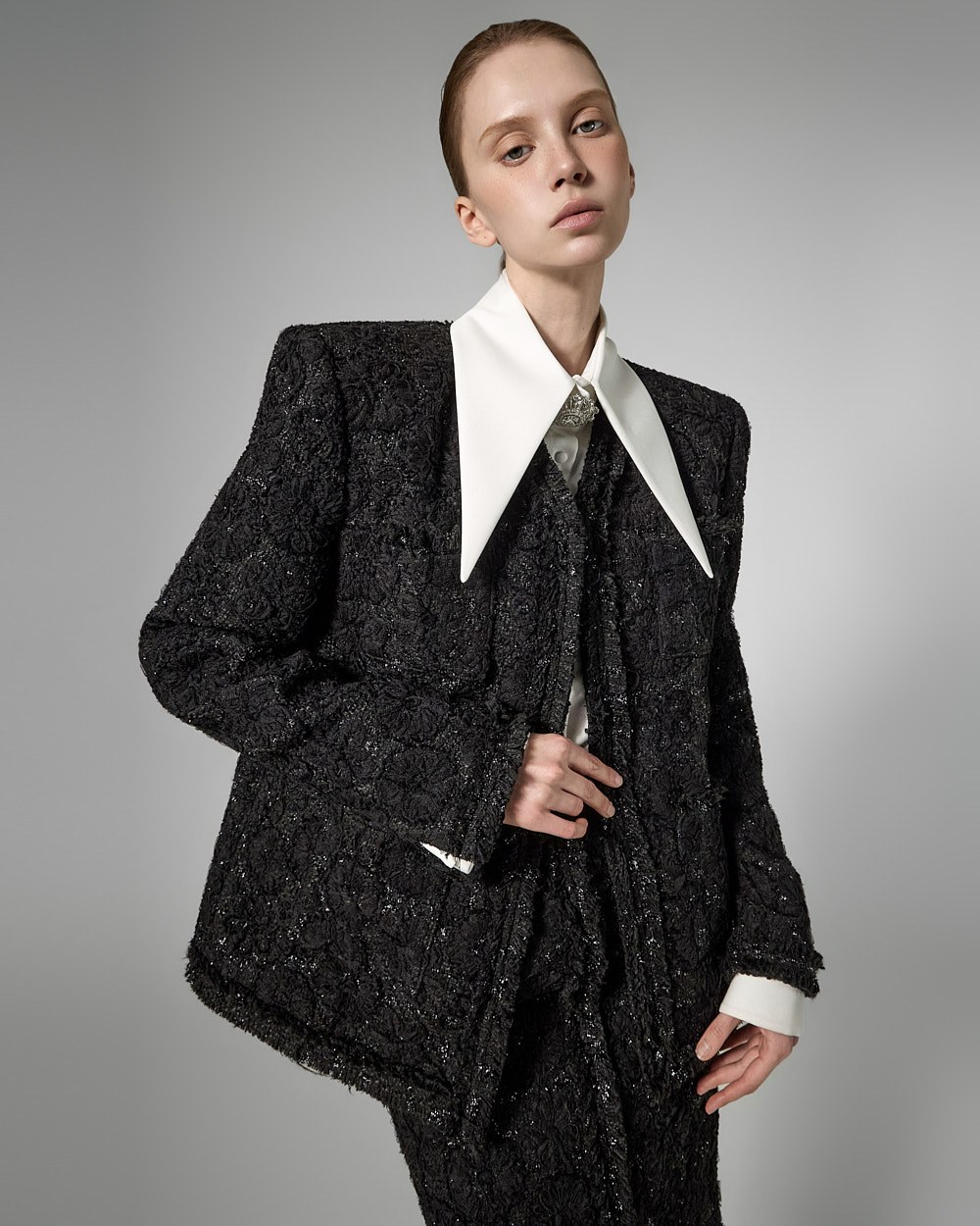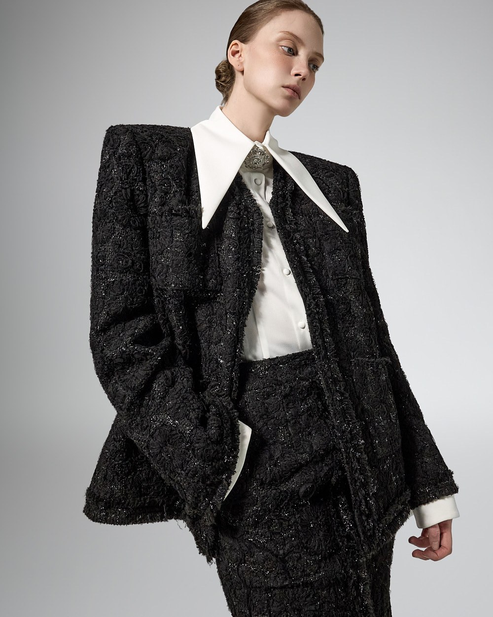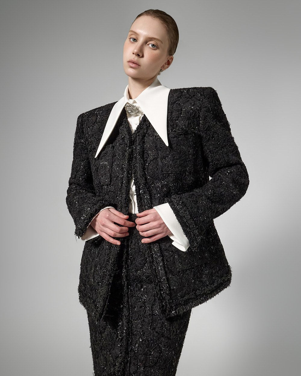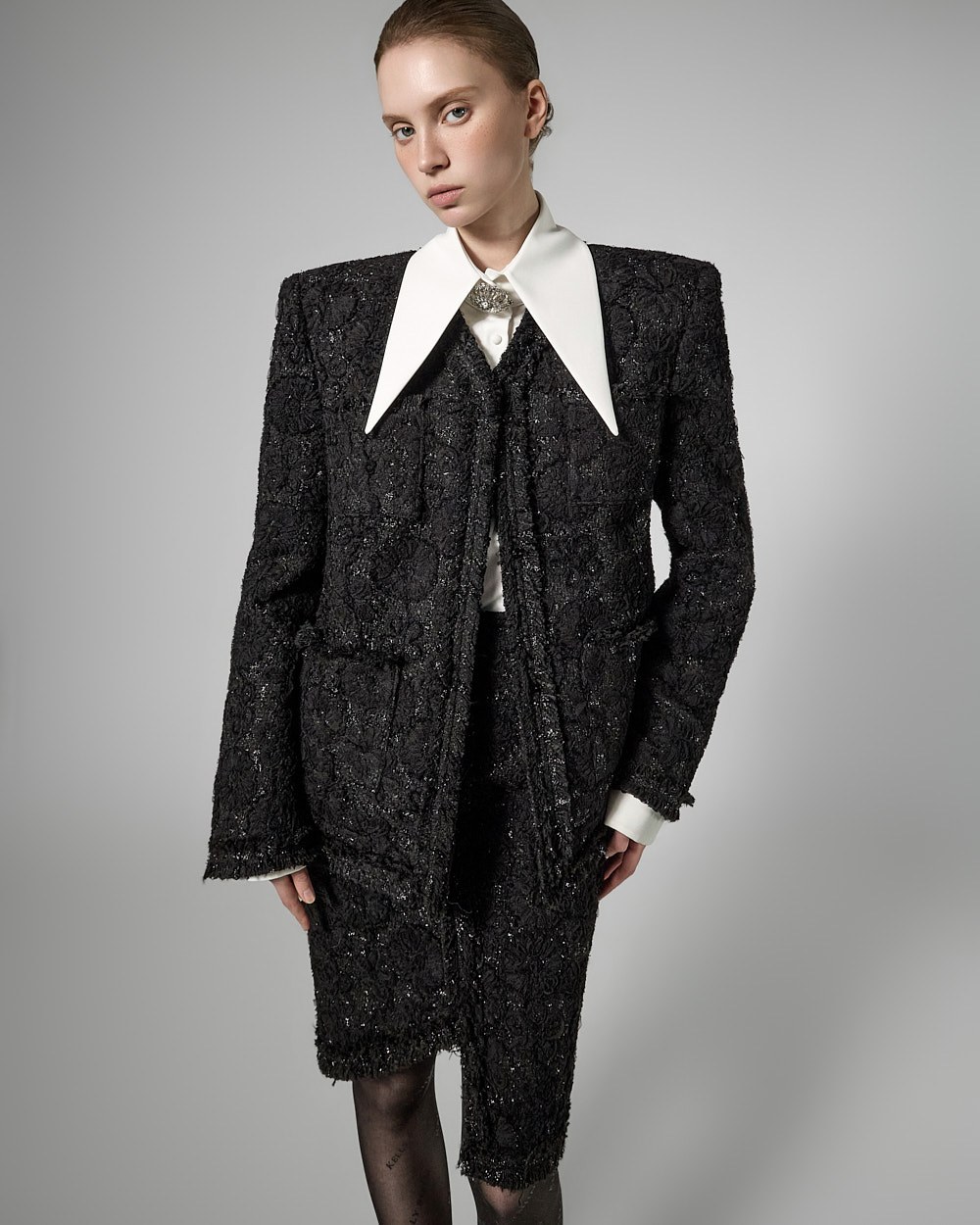 숄더라인 패드를 드리워 볼륨감있는 아웃핏을 선사하며,