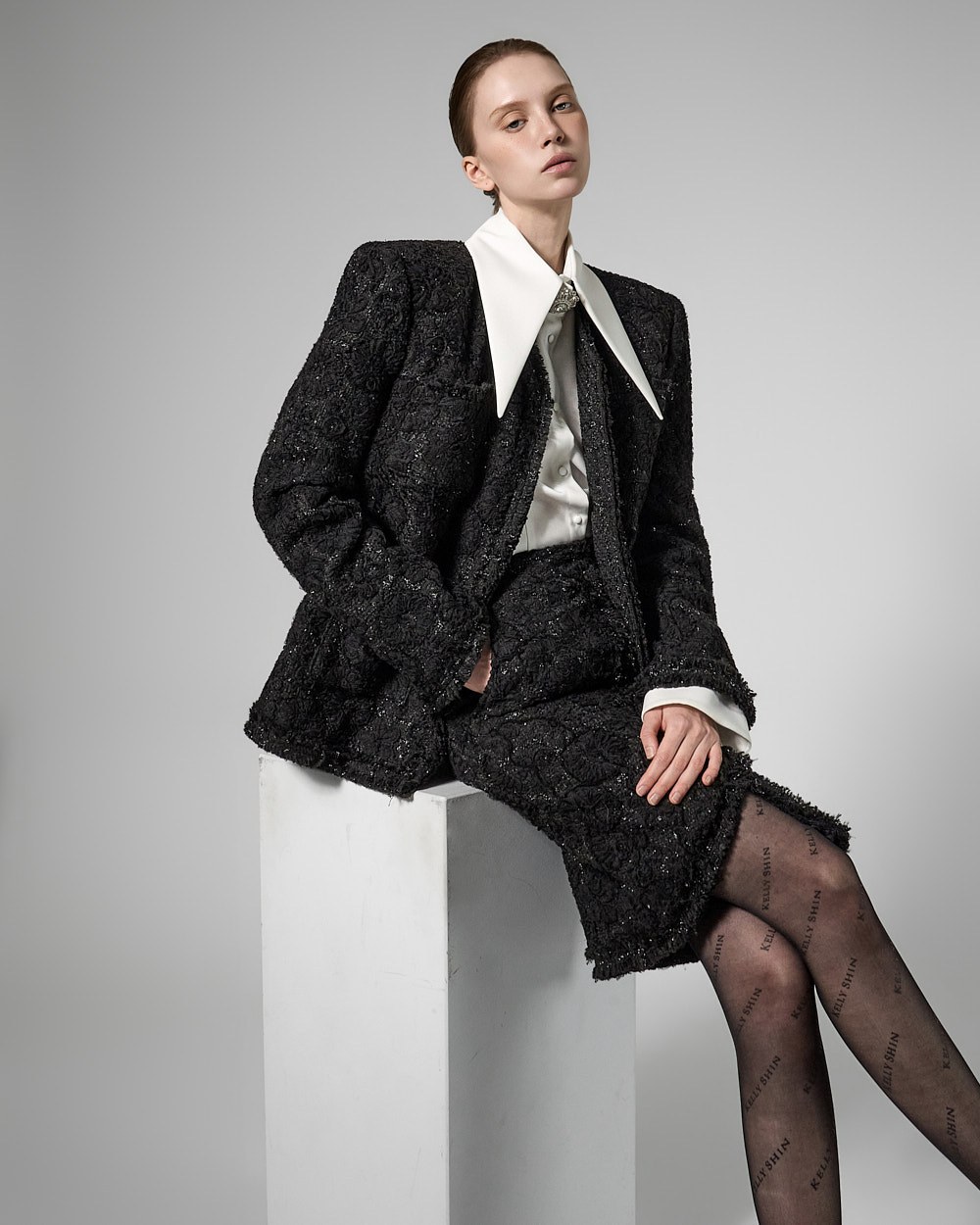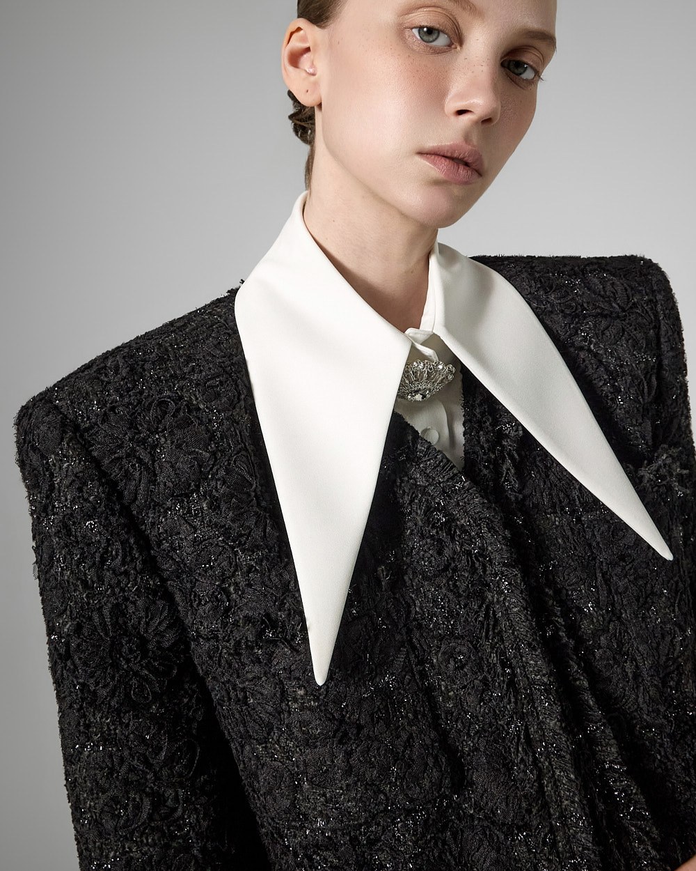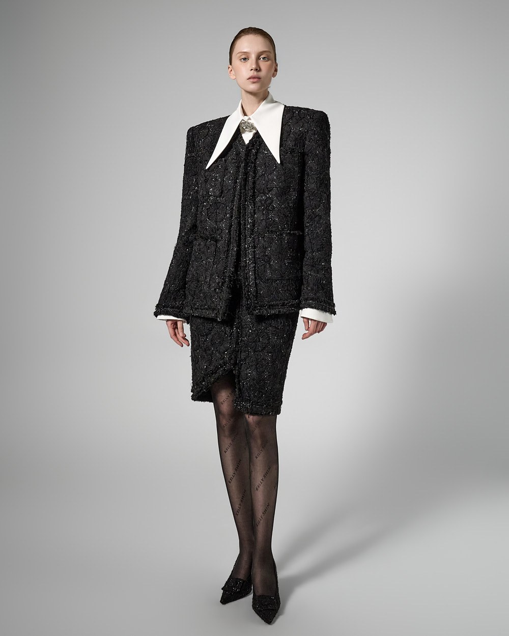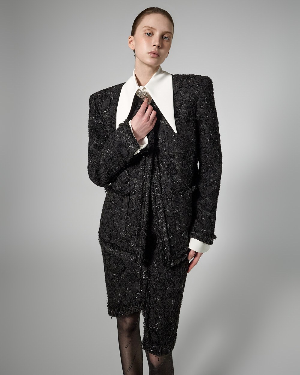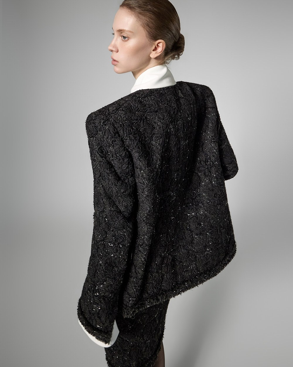 숄더라인 패드를 드리워 볼륨감있는 아웃핏을 선사하며,