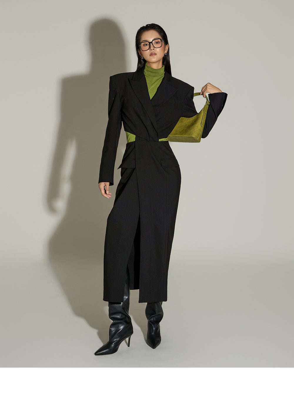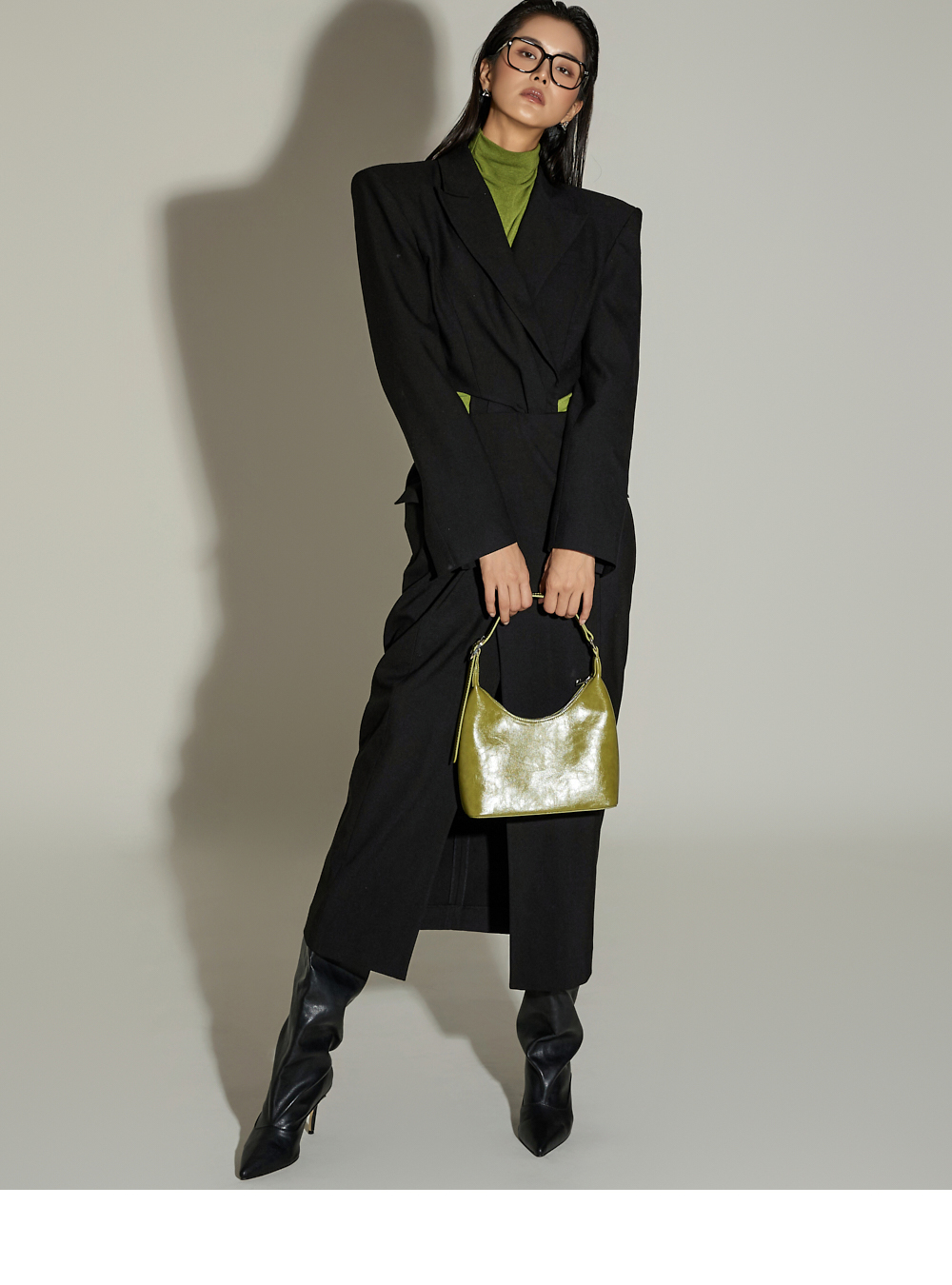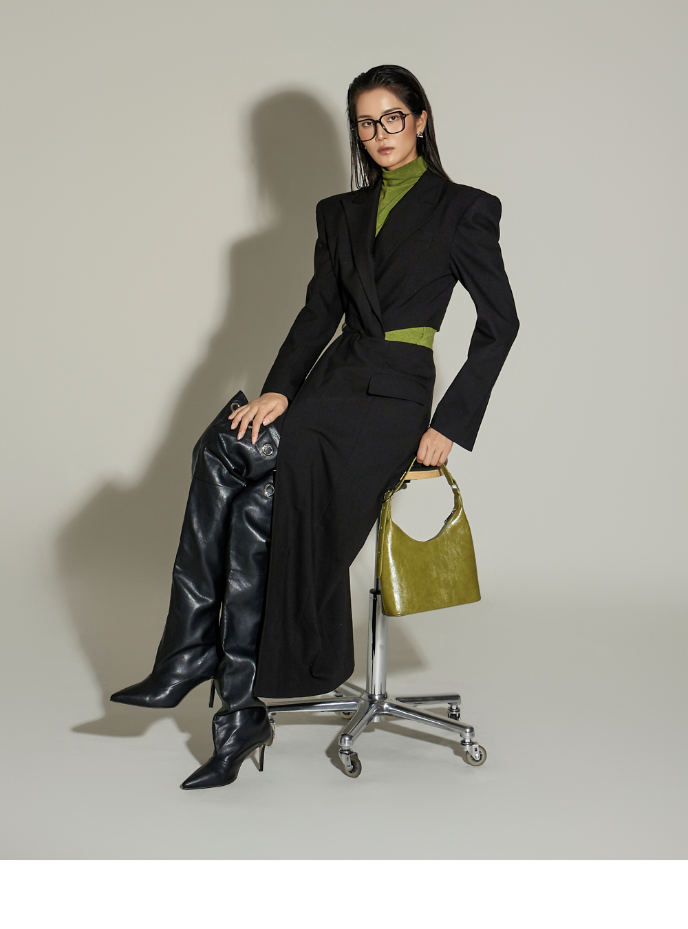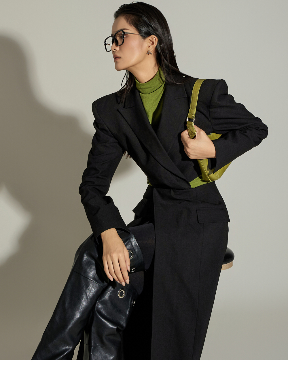 또한 숄더 패드가 더해져 볼륨감 있는 아웃핏을 완성해주고