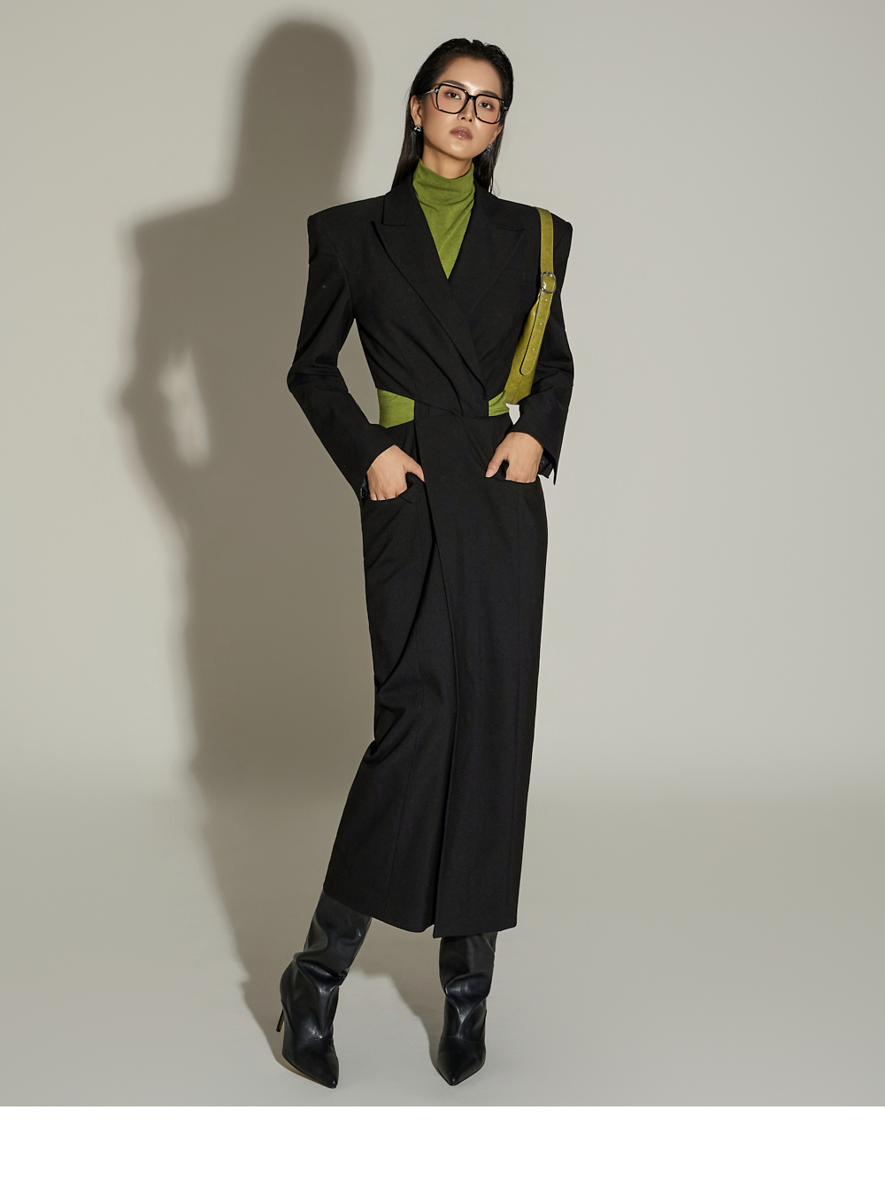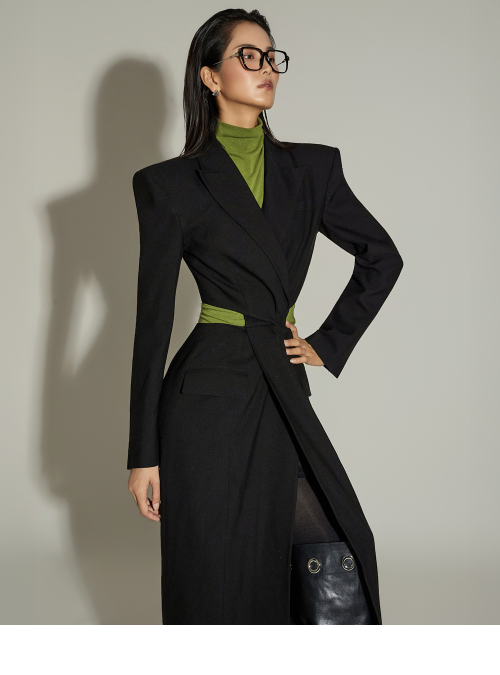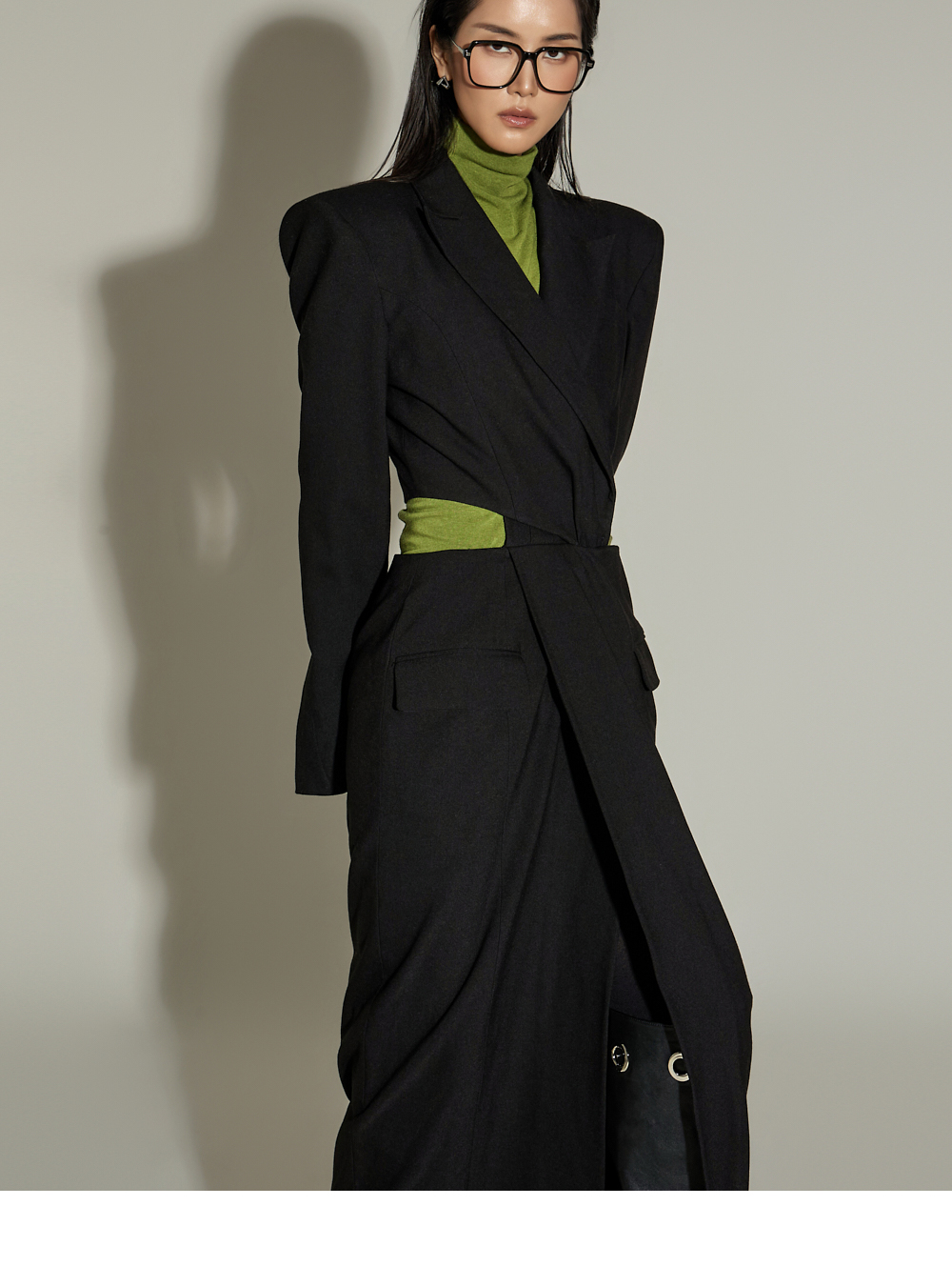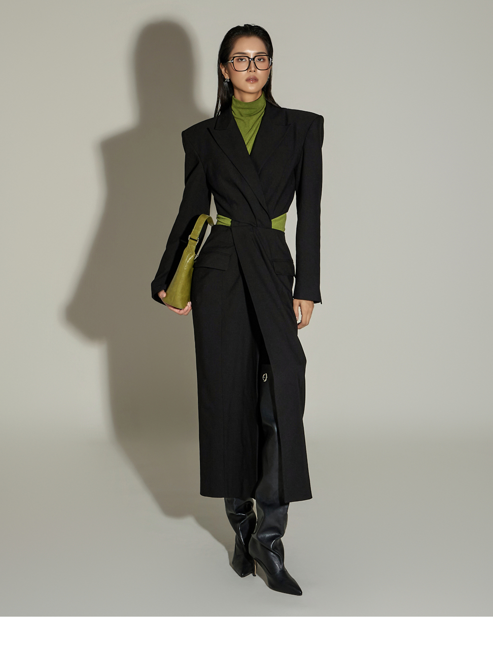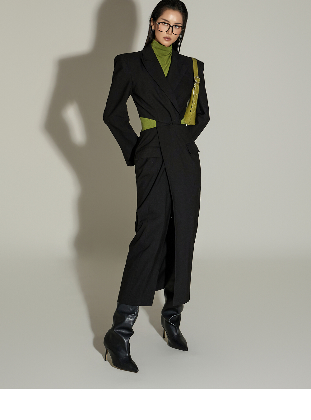 또한 숄더 패드가 더해져 볼륨감 있는 아웃핏을 완성해주고