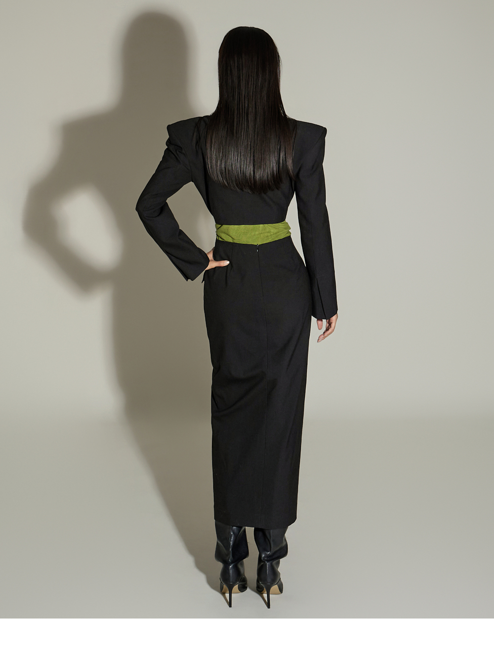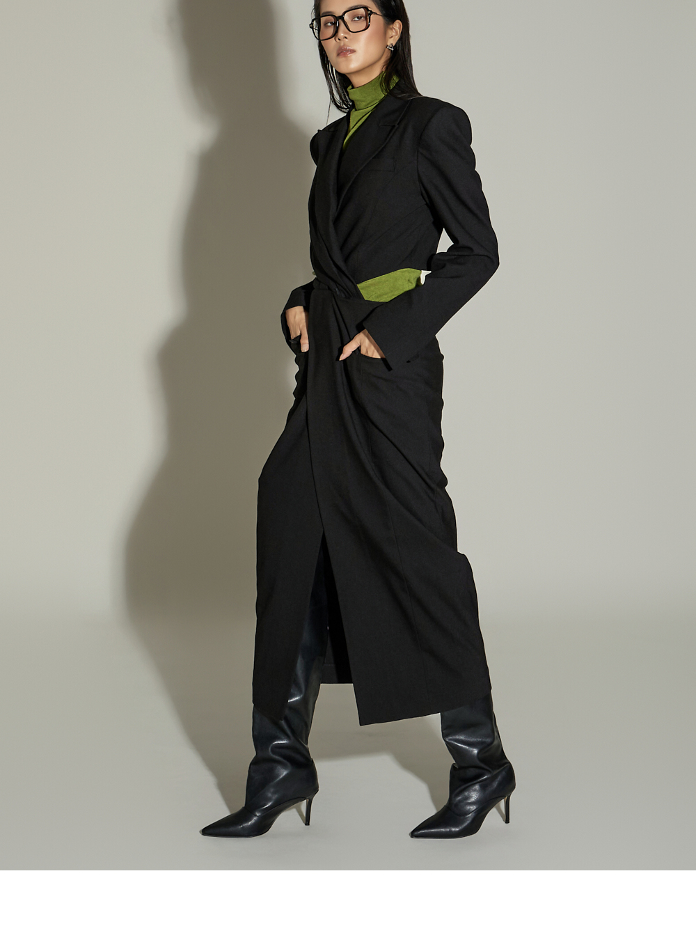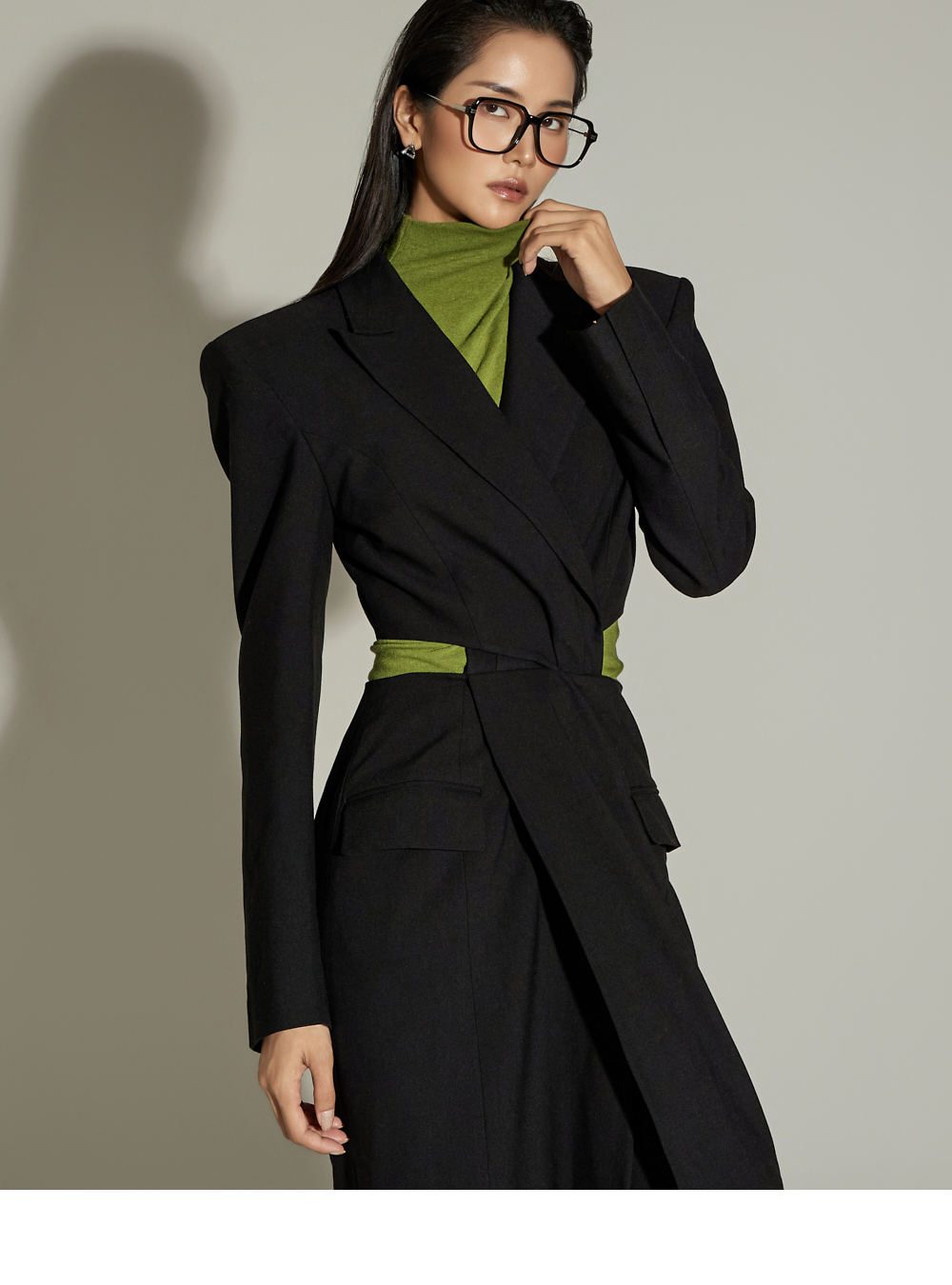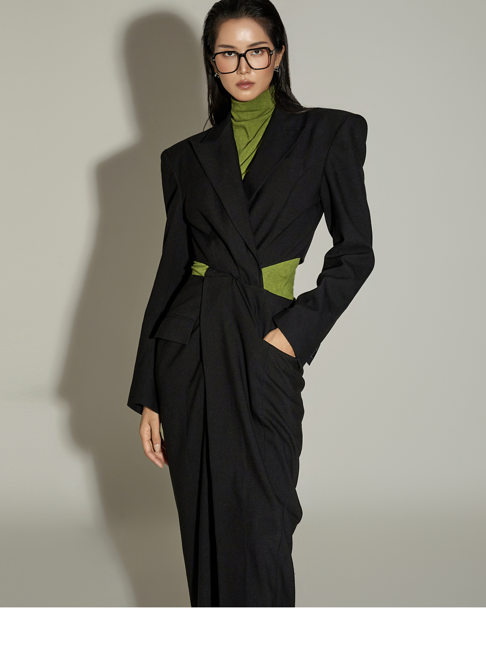 또한 숄더 패드가 더해져 볼륨감 있는 아웃핏을 완성해주고