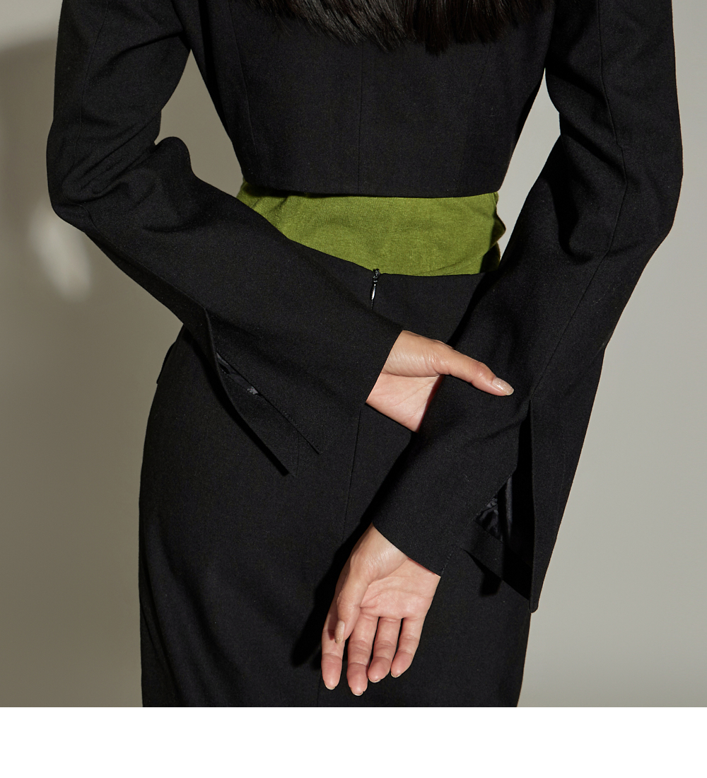 전면 버튼 여밈과 백라인 지퍼 디테일로