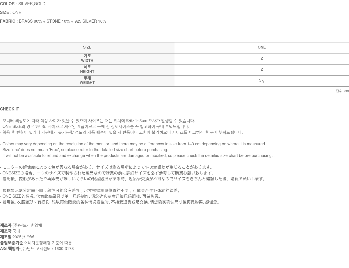 • 액세서리 및 잡화는 장시간 보관 및 착용 시 변색이나 변형이 될 수 있습니다.