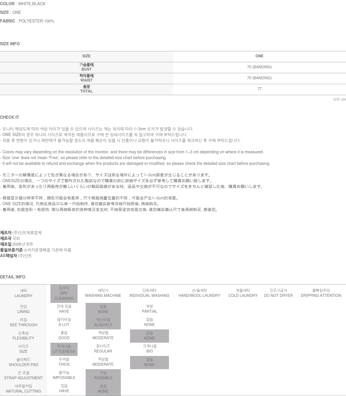 - (주)딘트의 의류는 일반 세탁 및 건조기 사용 시 원단의 변형이나 제품 손상의 원인이 될 수 있으므로, 하단에 안내된 세탁 방법을 따라주시기를 권장합니다.