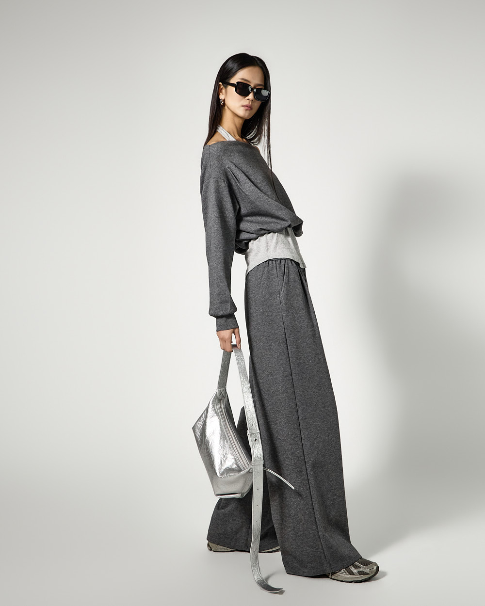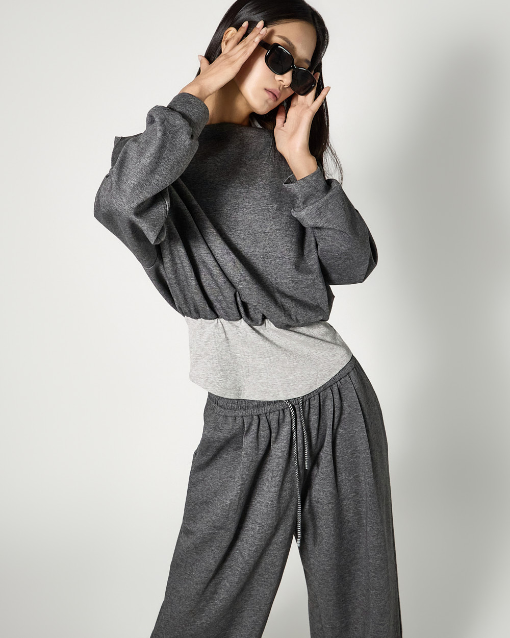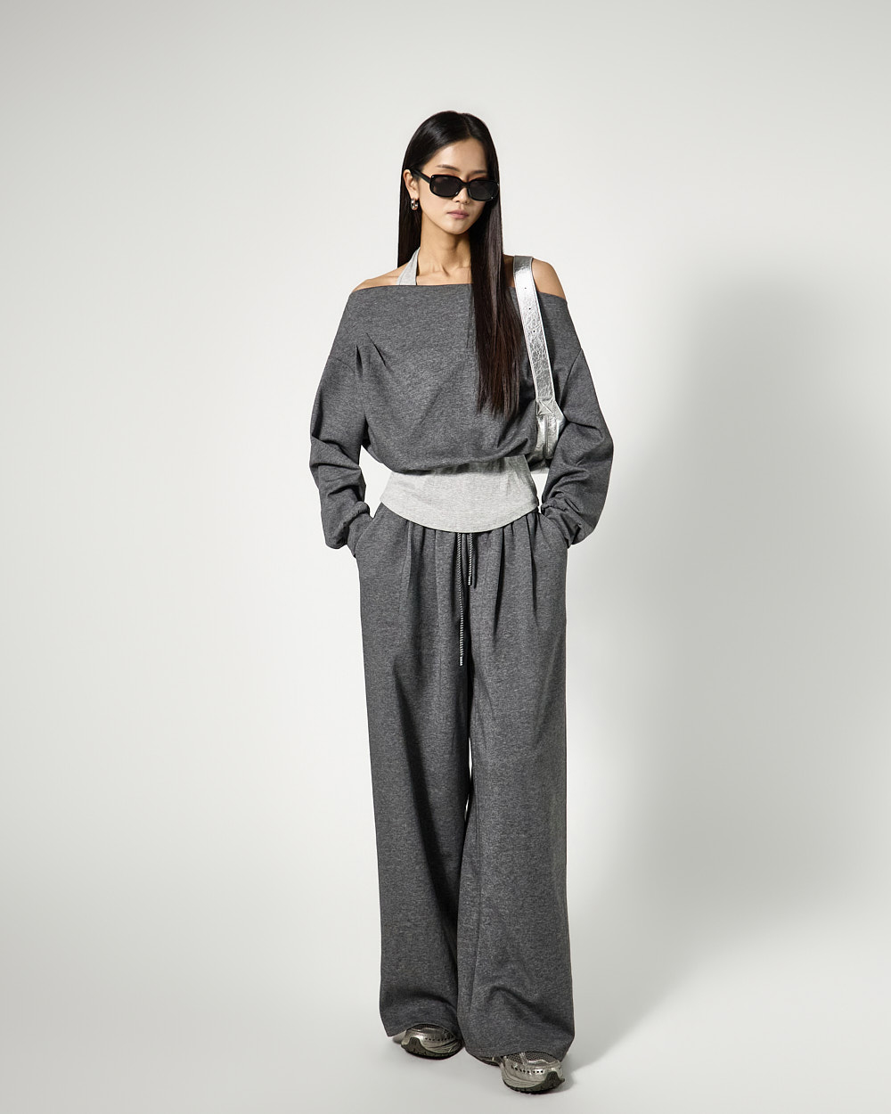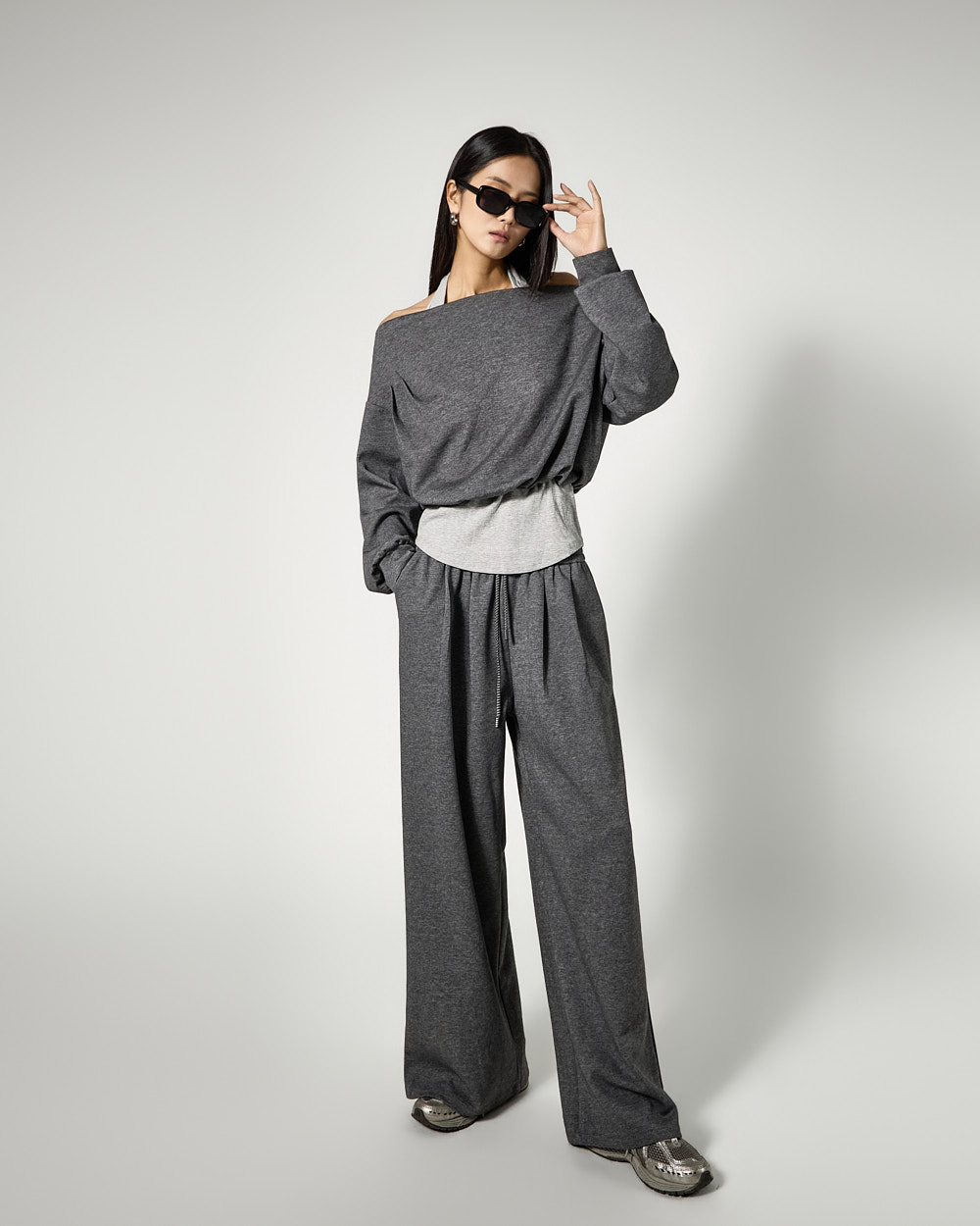 하의는 트레이닝 팬츠로 편안한 착용감을 더했으며,