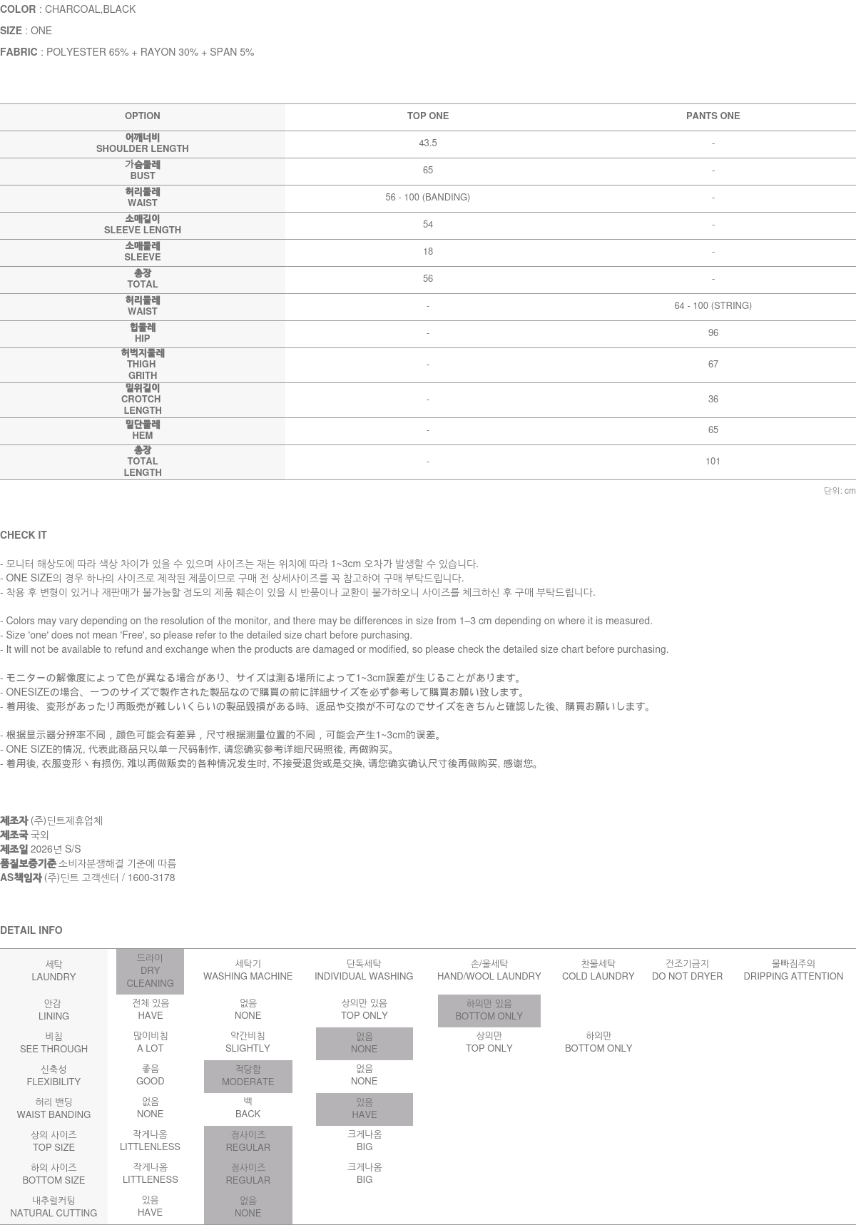 - (주)딘트의 의류는 일반 세탁 및 건조기 사용 시 원단의 변형이나 제품 손상의 원인이 될 수 있으므로, 하단에 안내된 세탁 방법을 따라주시기를 권장합니다.