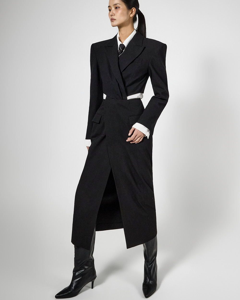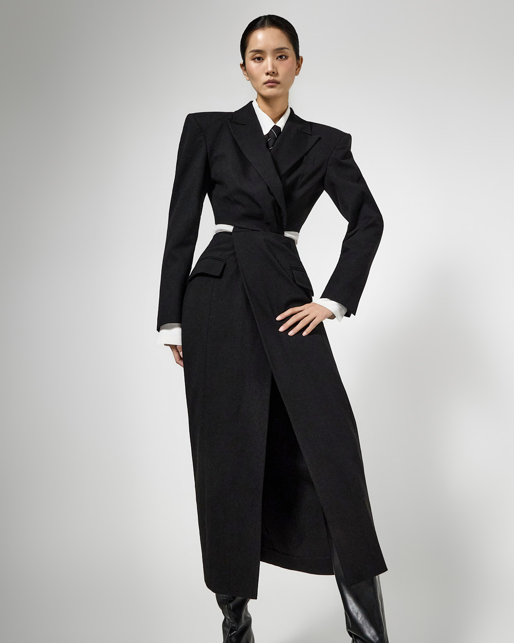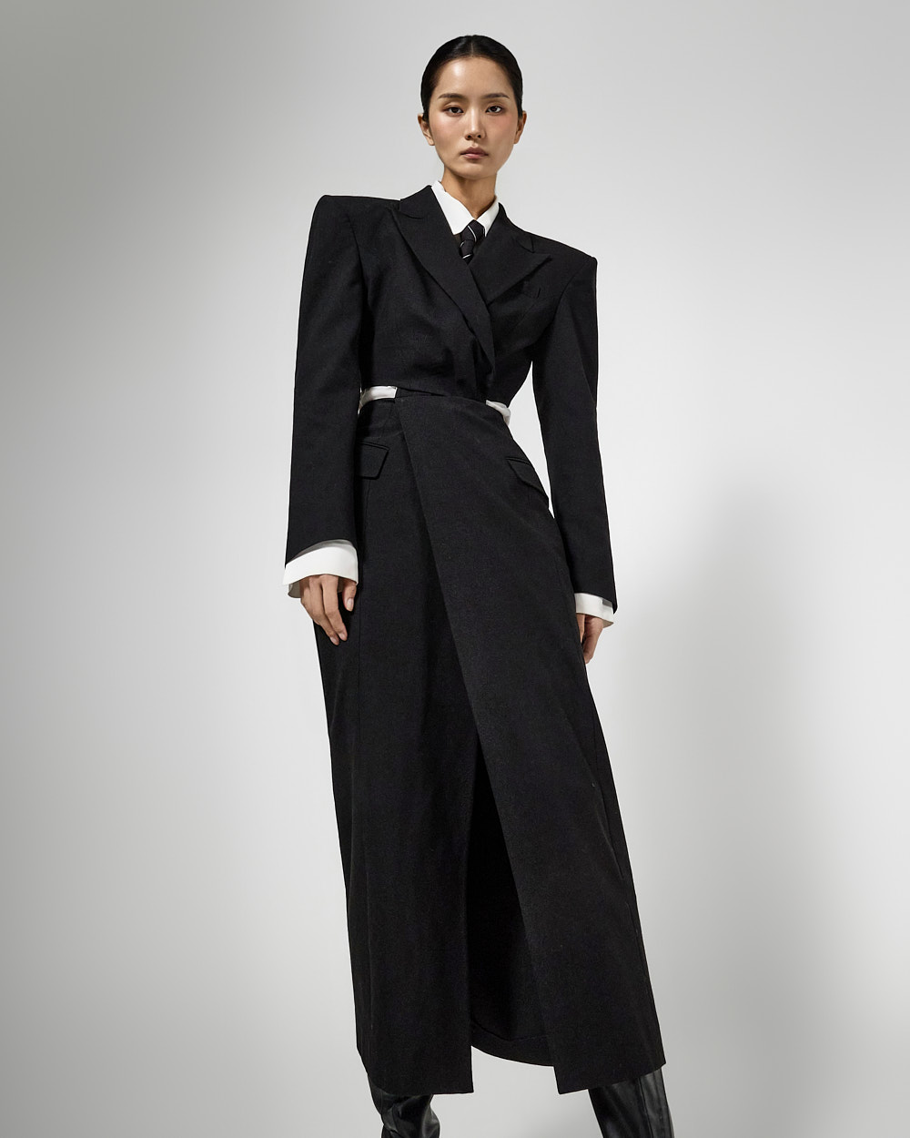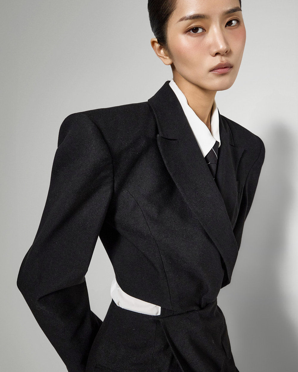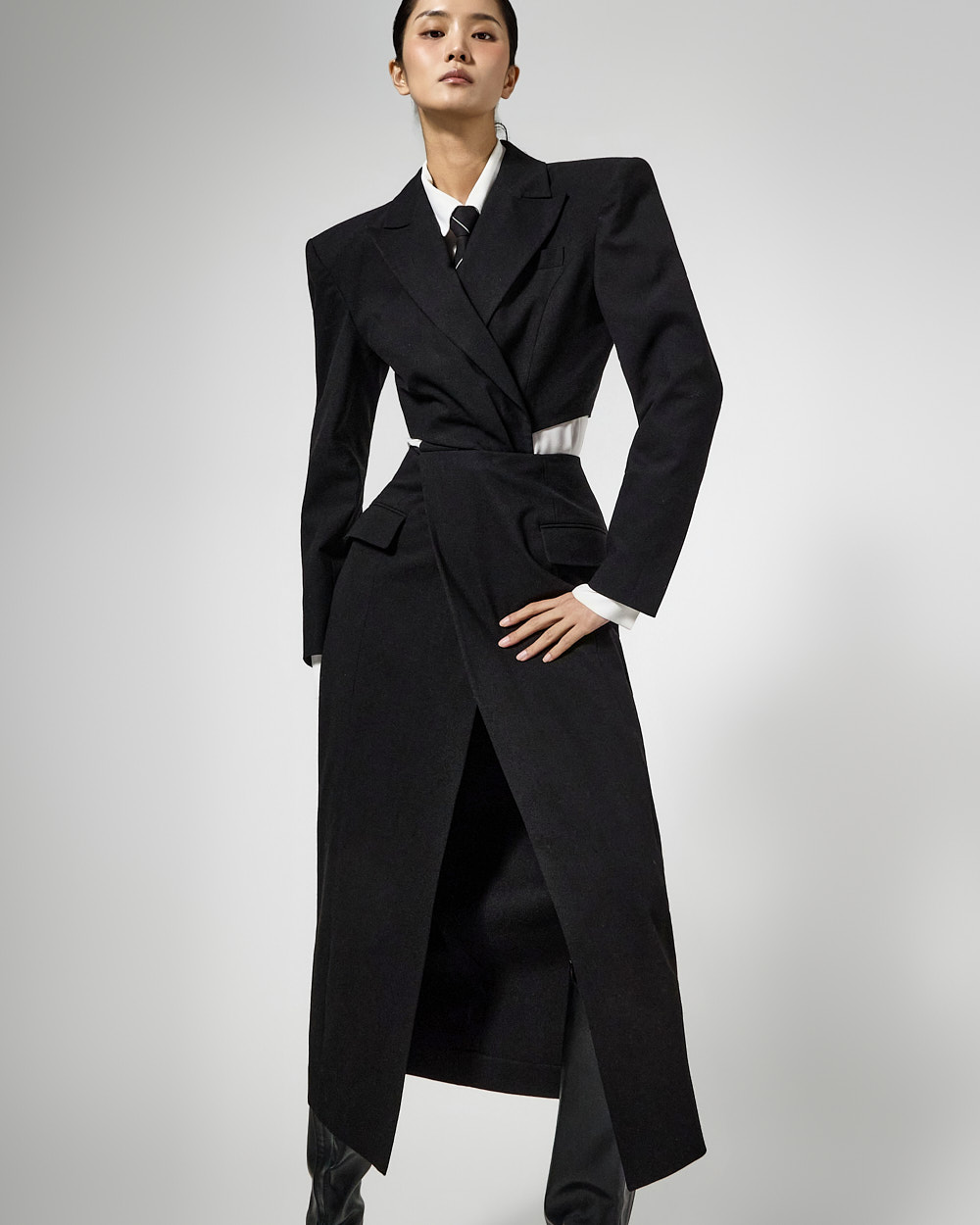 또한 숄더 패드가 더해져 볼륨감 있는 아웃핏을 완성해주고