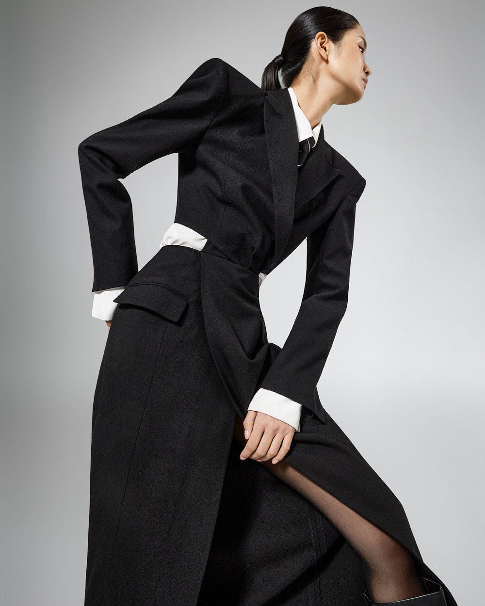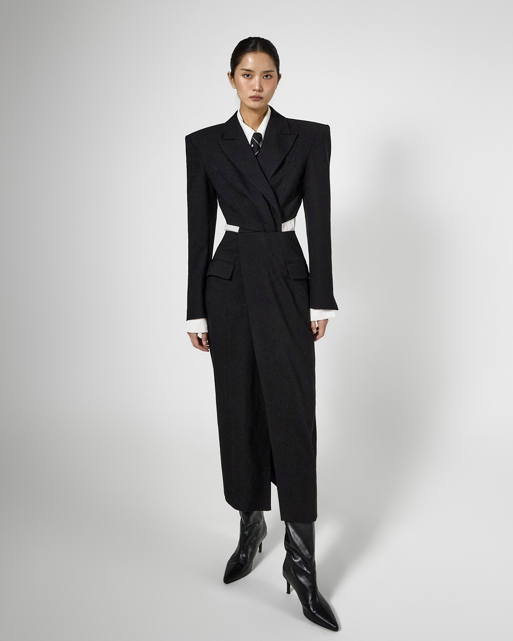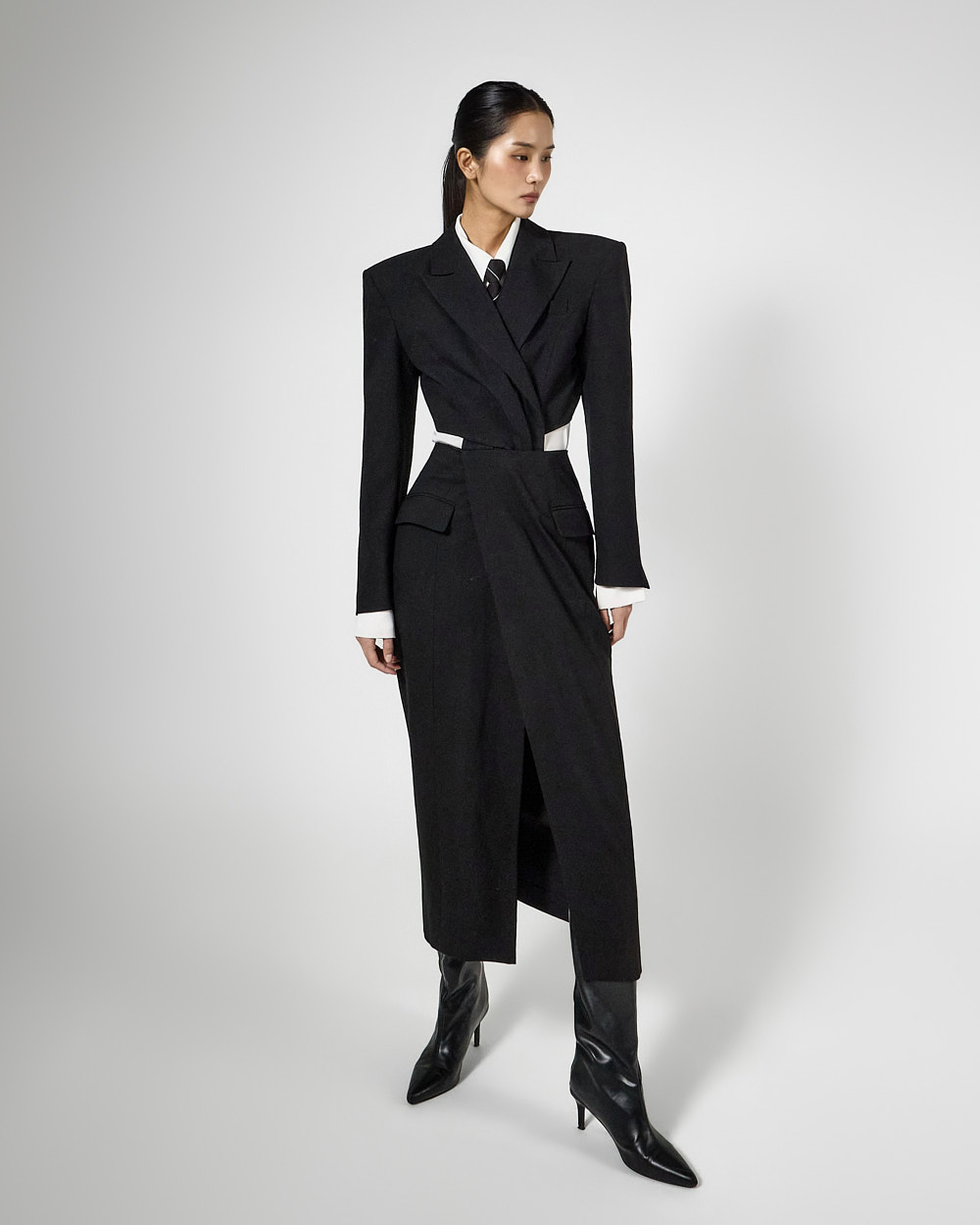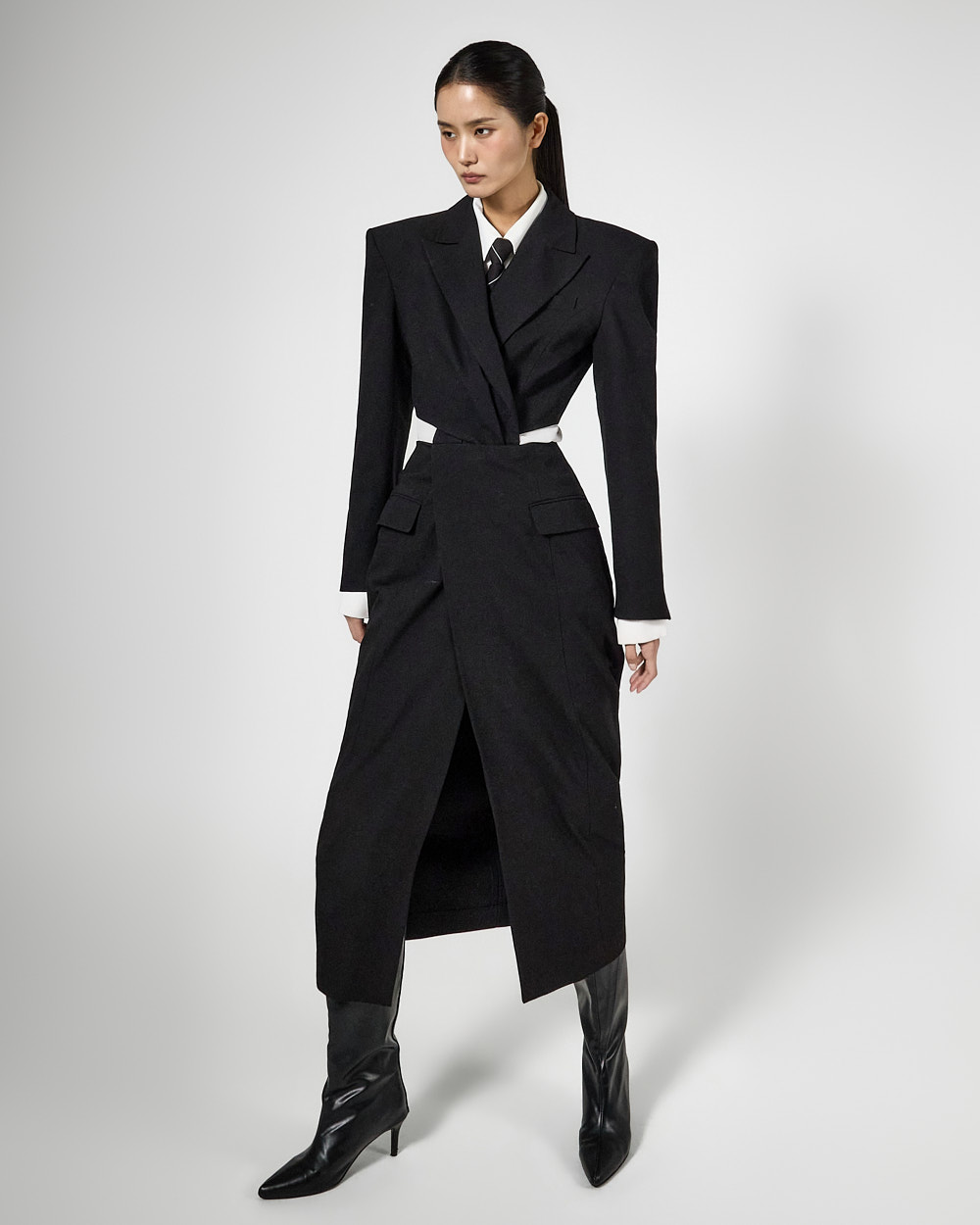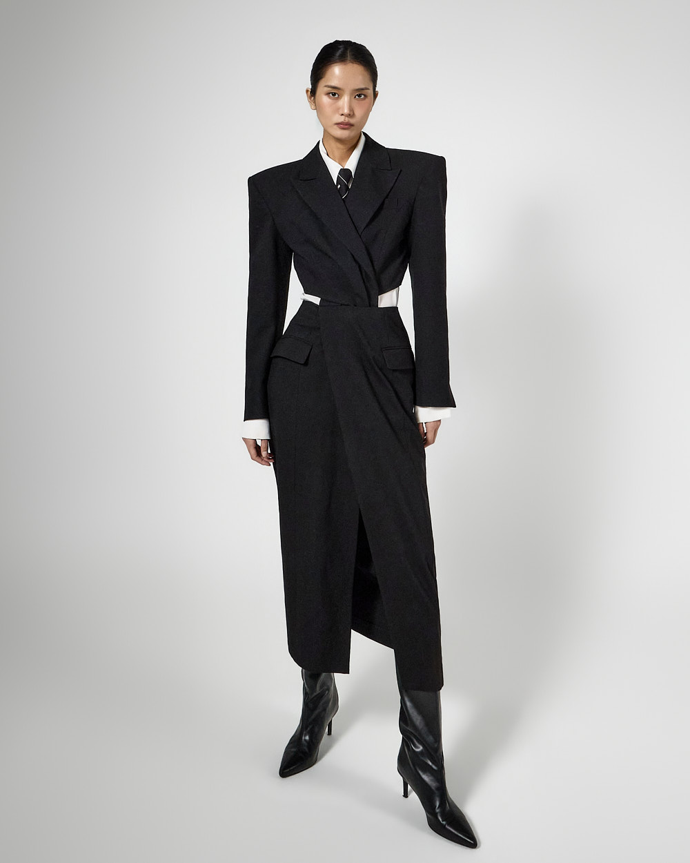 또한 숄더 패드가 더해져 볼륨감 있는 아웃핏을 완성해주고