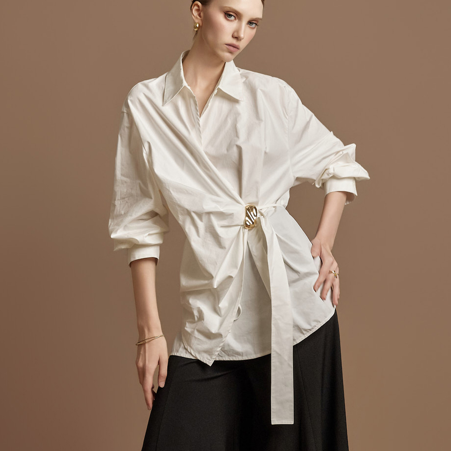 허리에는 골드 버클이 더해진 일체형 벨트가 구성되어