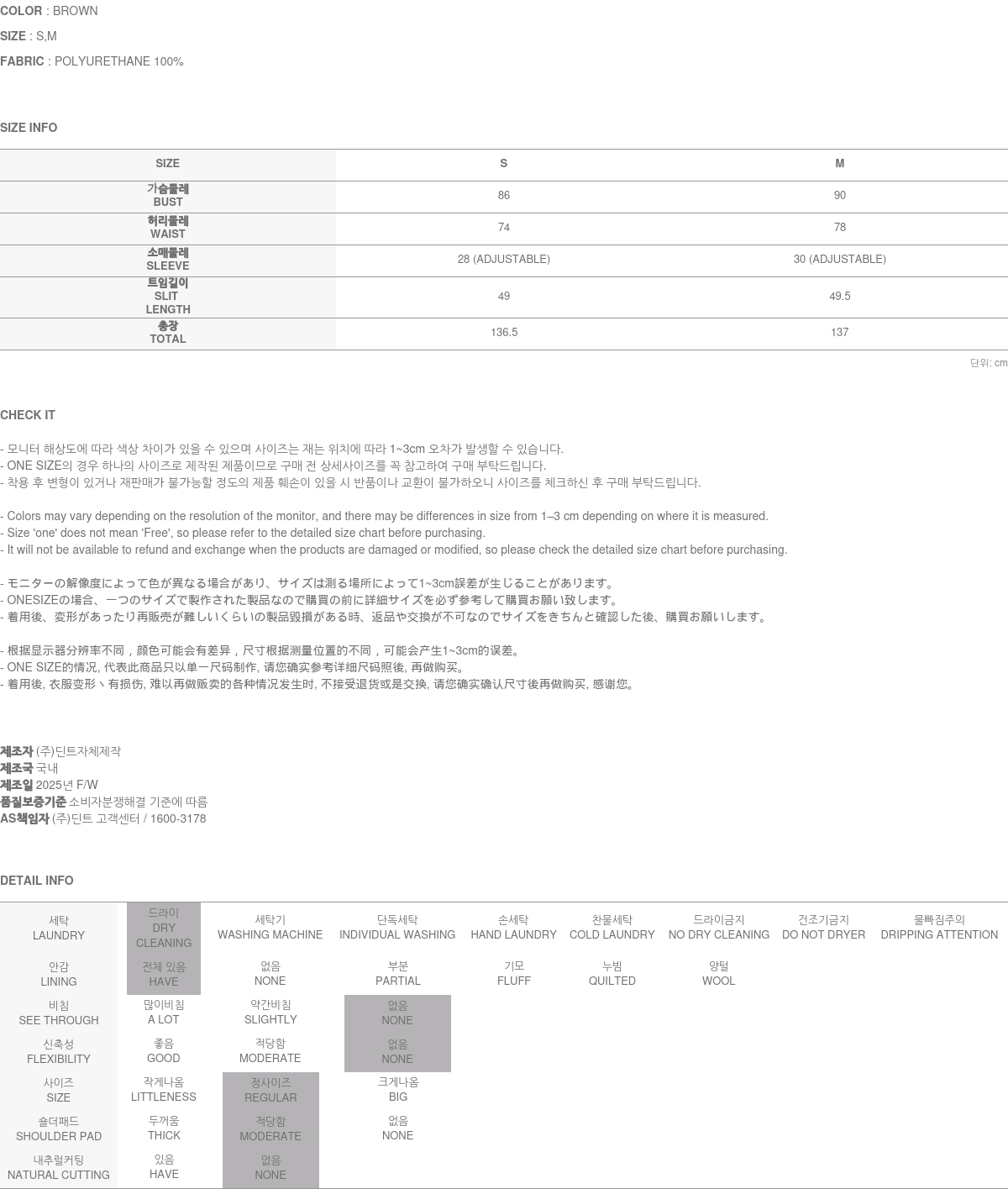 174CM 모델 S 사이즈, BROWN 컬러 착용하였습니다.