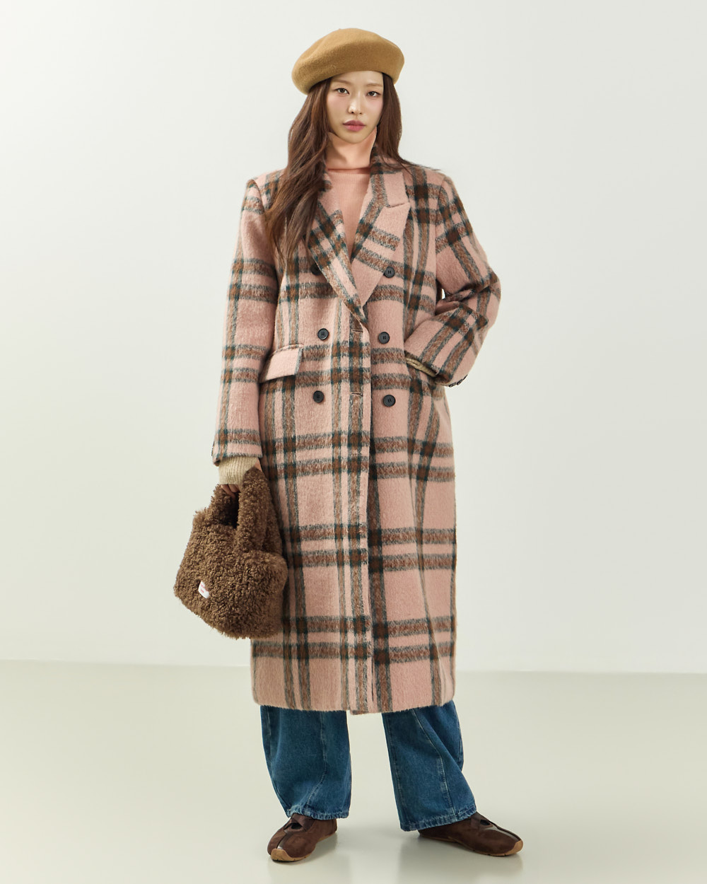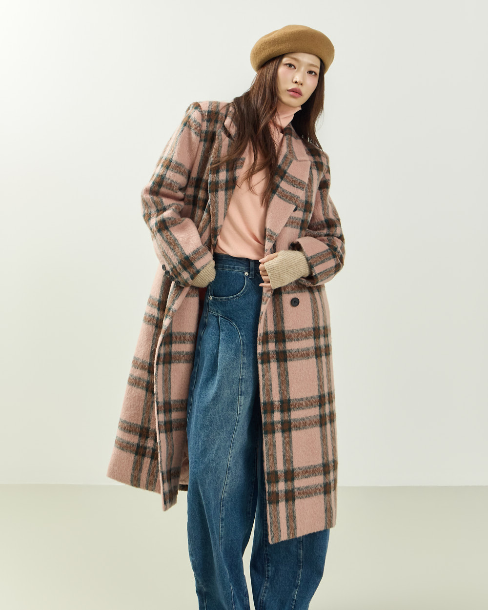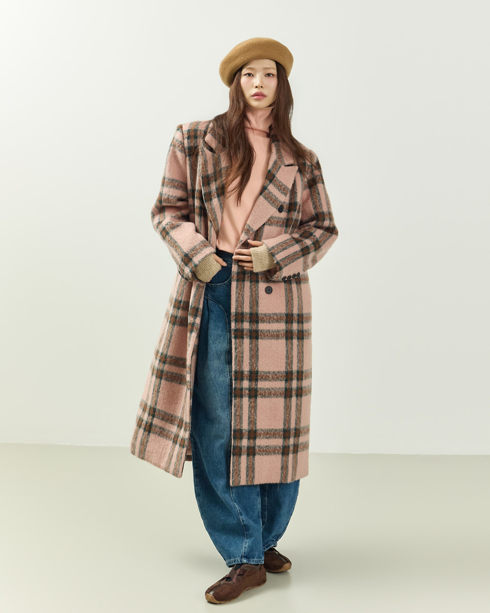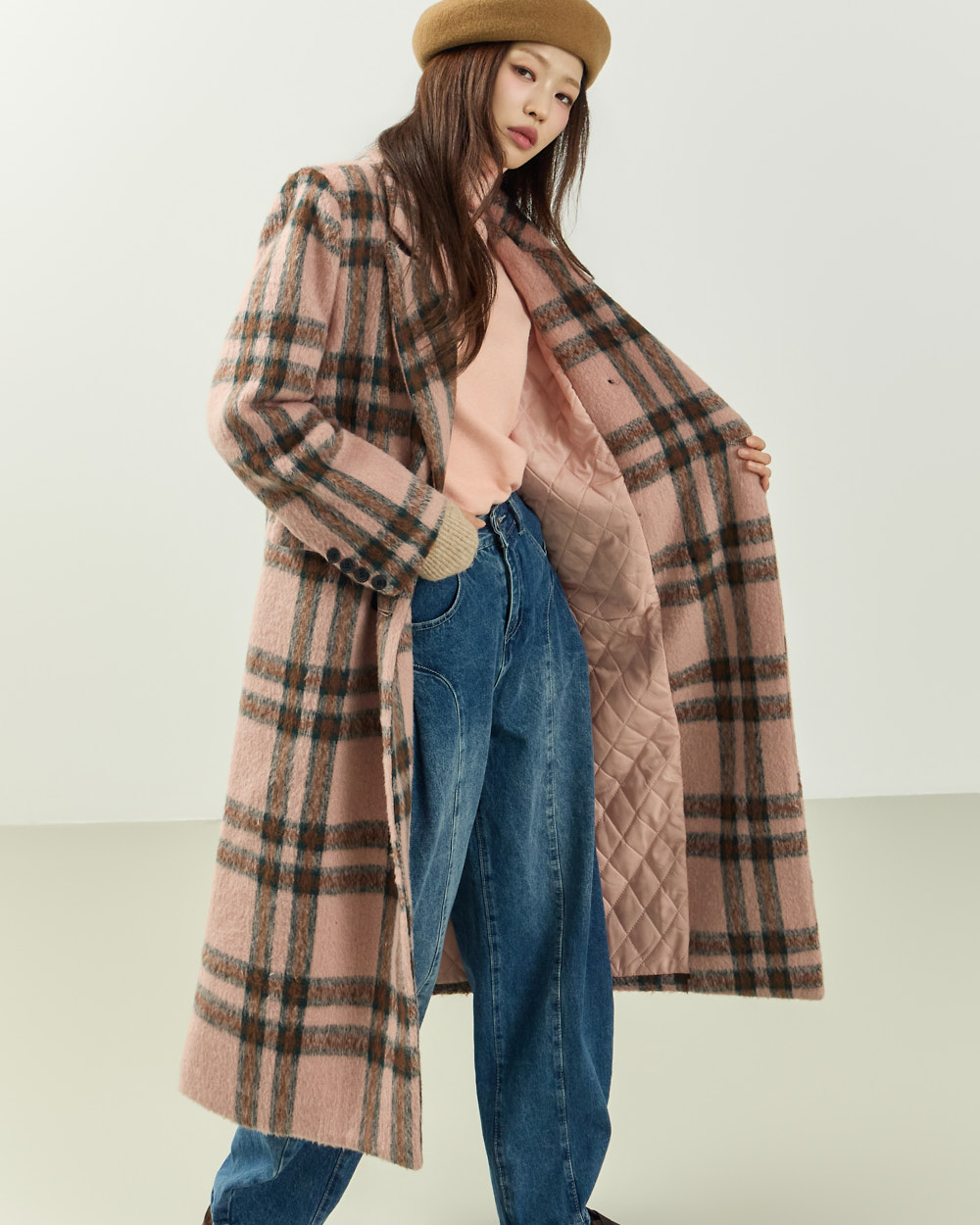 캐주얼한 무드의 모헤어 체크 롱 코트입니다.